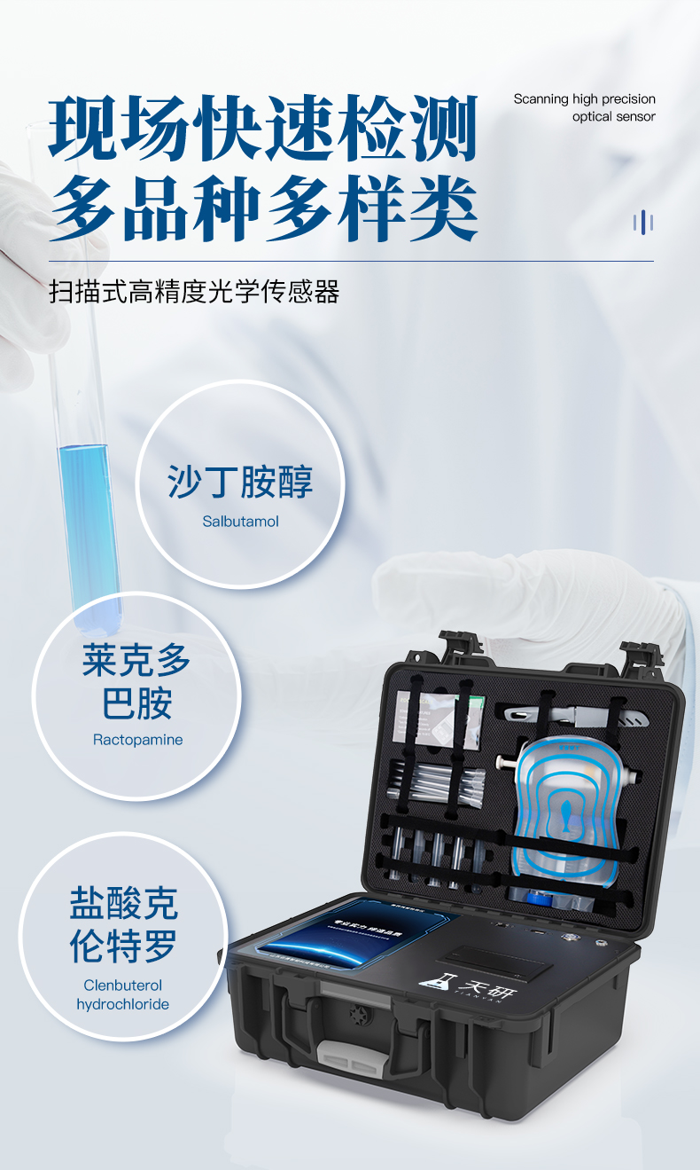 瘦肉精檢測(cè)儀可現(xiàn)場(chǎng)快速檢測(cè)鹽酸克倫特羅、萊克多巴胺、沙丁胺醇、己烯雌酚、喹乙醇等。儀器預(yù)留其他項(xiàng)目檢測(cè)程序和端口,根據(jù)日后需求可方便的自主增加檢測(cè)項(xiàng)目。日后可升級(jí)為檢測(cè)抗生素、獸藥殘留、動(dòng)物疫病、病害肉、的綜合類型儀器