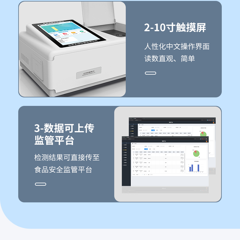 | 儀器采用臺式一體化系統(tǒng)檢測技術(shù),將分光光度模塊、新型農(nóng)殘檢測模塊、數(shù)字化管理模塊、無線通訊模塊高度集成于一體,支持檢測200種食品安全檢測項目,同時預(yù)留升級檢測方法。 | 儀器檢測模塊標(biāo)準(zhǔn)化、智能化,可隨意自由組合。檢測箱體內(nèi)置多個標(biāo)準(zhǔn)檢測單元,檢測模塊可以調(diào)整配置。 | 儀器采用全新安卓智能系統(tǒng),主控芯片采用 ARM Cortex-A7,RK3288/4核處理器,10.1寸高清液晶觸摸豎屏,更加**的UI交互界面,運(yùn)轉(zhuǎn)快捷;儀器配備無線通信模塊: 4G(APN)通訊模塊、Wifi模塊,藍(lán)牙傳輸,同時具有雙USB接口以及RJ45接口能以多種方式實(shí)現(xiàn)數(shù)據(jù)保存和數(shù)據(jù)傳輸功能。 | 創(chuàng)新檢測模式: | ★檢測通道:≥12通道;采用精密旋轉(zhuǎn)比色池設(shè)計,使用同芯片同光源校準(zhǔn)精度,解決不同光源之間的誤差值。1-12通道間誤差0.1%。(**號:ZL202022821055.2) | ★儀器具有自動識別比色皿檢測功能,即:將樣品比色皿放入儀器后,點(diǎn)擊樣品檢測,儀器自動識別比色皿進(jìn)行通道檢測。 | 進(jìn)口高精光源: | 高精度進(jìn)口四波長冷光源,通道配置 410、520、590、630nm 波長光源,一個光源芯片驅(qū)動一個光源,誤差極小,每臺設(shè)備單獨(dú)**校準(zhǔn)光源,**比對,同時參照四種不同波段光源全方位覆蓋市面上99%的農(nóng)殘食品項目檢測。 | 智能化操作系統(tǒng): | 便捷操作系統(tǒng):設(shè)備檢測時可在同一檢測界面自動對應(yīng)相關(guān)檢測通道一次性選擇1-12個樣品名稱,無須退出界面,節(jié)省操作時間。 | 數(shù)據(jù)集成系統(tǒng):設(shè)備首頁自動統(tǒng)計檢測數(shù)據(jù)包含:周檢測數(shù)據(jù)、月檢測數(shù)據(jù),全部檢測總數(shù)量,均包含檢測總數(shù),合格數(shù),不合格數(shù),以及相關(guān)柱形分析圖,對各項檢測數(shù)據(jù)清晰掌握,無需電腦查詢,更加快捷直觀。 | 項目預(yù)設(shè)系統(tǒng):支持添加單個及多個相同或不相同的任務(wù)預(yù)設(shè),一鍵快速調(diào)取,每一個任務(wù)分別可以設(shè)置不同的樣品、批次、編號、來源、備注、抽樣信息、檢測信息、受檢信息、復(fù)核信息等更多信息。無縫鏈接平臺和APP實(shí)時查看下發(fā)任務(wù)。 | 數(shù)據(jù)監(jiān)管系統(tǒng):同步對接監(jiān)管平臺,數(shù)據(jù)可局域網(wǎng)和互聯(lián)網(wǎng)數(shù)據(jù)上傳,檢測結(jié)果可選擇直接傳至食品安全監(jiān)管平臺。集成OSS輸出存儲服務(wù)、區(qū)分設(shè)備定向管理應(yīng)用,進(jìn)行區(qū)域食品安全監(jiān)管及大數(shù)據(jù)分析處理與數(shù)據(jù)統(tǒng)計,檢測區(qū)域食品安全長短期動態(tài),達(dá)到食品安全問題預(yù)估、預(yù)警。 | 自定義打印系統(tǒng):內(nèi)置全新打印系統(tǒng),新創(chuàng)自定義打印方式,可按需靈活設(shè)置開啟或關(guān)閉:產(chǎn)品合格證(國家農(nóng)業(yè)部標(biāo)準(zhǔn)要求),二維碼,抽樣信息、檢測信息,受檢信息、復(fù)核信息、抽樣日期、檢測日期等信息的打印。 | 系統(tǒng)遠(yuǎn)程更新功能:可定向分客戶分儀器更新系統(tǒng),按照不同客戶后期實(shí)際需求添加項目,無需機(jī)器返廠,即可遠(yuǎn)程實(shí)時升級全新系統(tǒng),節(jié)省時間成本及避免運(yùn)輸造成設(shè)備損壞。 | 儀器主機(jī)采用一體化防水、抗壓、防撞擊、防腐蝕箱體設(shè)計,同時配備交直流供電,可連接車載電源,可選配大容量充電鋰電池,滿足現(xiàn)場野外檢測需求。 | 安全證書,放心保障:儀器具有中國計量科學(xué)研究院校準(zhǔn)證書,**認(rèn)證。 |