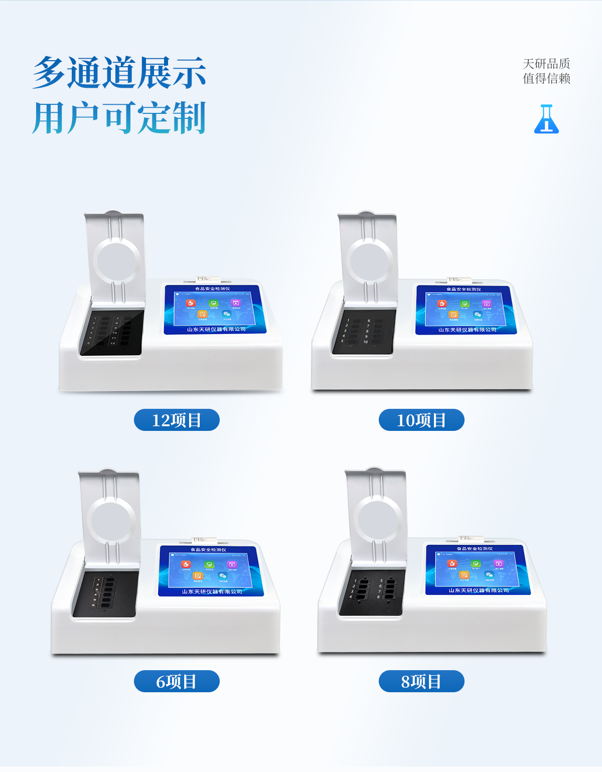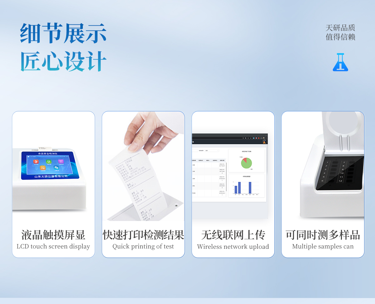 | 安卓智能操作系統(tǒng),采用更加**和人性化操作,儀器具有網(wǎng)線連接、wifi聯(lián)網(wǎng)上傳、GPRS無線遠(yuǎn)傳功能,快速上傳數(shù)據(jù)。 | 智能化程度高,儀器具有自檢功能:具有開機(jī)自檢和調(diào)零功能,具有自動檢測重復(fù)性功能。 | 檢測通道:≥12個檢測通道,可以同時測試多個樣品,每個樣品由程序控制分別獨立工作,不會互相干擾。 | 顯示方式:≥8英寸液晶觸摸屏顯示,人性化中文操作界面,讀數(shù)直觀、簡單。 | 配備新一代嵌入式熱敏打印機(jī),可選擇手動打印或者自動打印,檢測完成可自動打印檢測報告和二維碼。 | 光源采用進(jìn)口超高亮發(fā)光二極管,高精度、穩(wěn)定性強、光源可控、可以關(guān)掉不使用的光源,功耗更低。 | 采用USB2.0接口設(shè)計,方便數(shù)據(jù)的存貯和移動,并可隨時與計算機(jī)直接相連,并且可用計算機(jī)控制儀器。實現(xiàn)數(shù)據(jù)查詢、瀏覽、分析、統(tǒng)計、打印等。 | 儀器帶有監(jiān)管平臺。數(shù)據(jù)可局域網(wǎng)和互聯(lián)網(wǎng)數(shù)據(jù)上傳,檢測結(jié)果直接傳至食品安全監(jiān)管平臺。進(jìn)行區(qū)域食品安全監(jiān)管及大數(shù)據(jù)分析處理,檢測區(qū)域食品安全長短期動態(tài),達(dá)到食品安全問題預(yù)估、預(yù)警 | 一體化便攜式快檢設(shè)備,滿足現(xiàn)場及流動檢測使用需求,能夠在同一軟件下實現(xiàn)所有檢測項目的檢測,并可通過同一窗口直觀顯示檢測結(jié)果。 | 儀器具有多品類多種類樣品菜單庫,可靈活選擇檢測樣品,不同的檢測通道可同時檢測不同的樣品項目。也可在儀器上直接編輯錄入樣品名稱、檢測指標(biāo)、送檢單位等信息并保存進(jìn)樣品數(shù)據(jù)庫。 | 樣品處理簡單省力,整體操作快速、安全、便捷。 | 儀器具有自身保護(hù)功能,可設(shè)置用戶名及密碼,防止非工作人員操作等。 | 高靈敏度,高檢測精度,高重復(fù)性精度,掃描式高精度光學(xué)傳感器。 | 儀器具有重新校準(zhǔn)、鎖定、恢復(fù)出廠設(shè)置功能。 | 支持U盤存儲。 結(jié)果判定線可修改,對照值標(biāo)定值可保存,斷電不丟失數(shù)據(jù)。 |