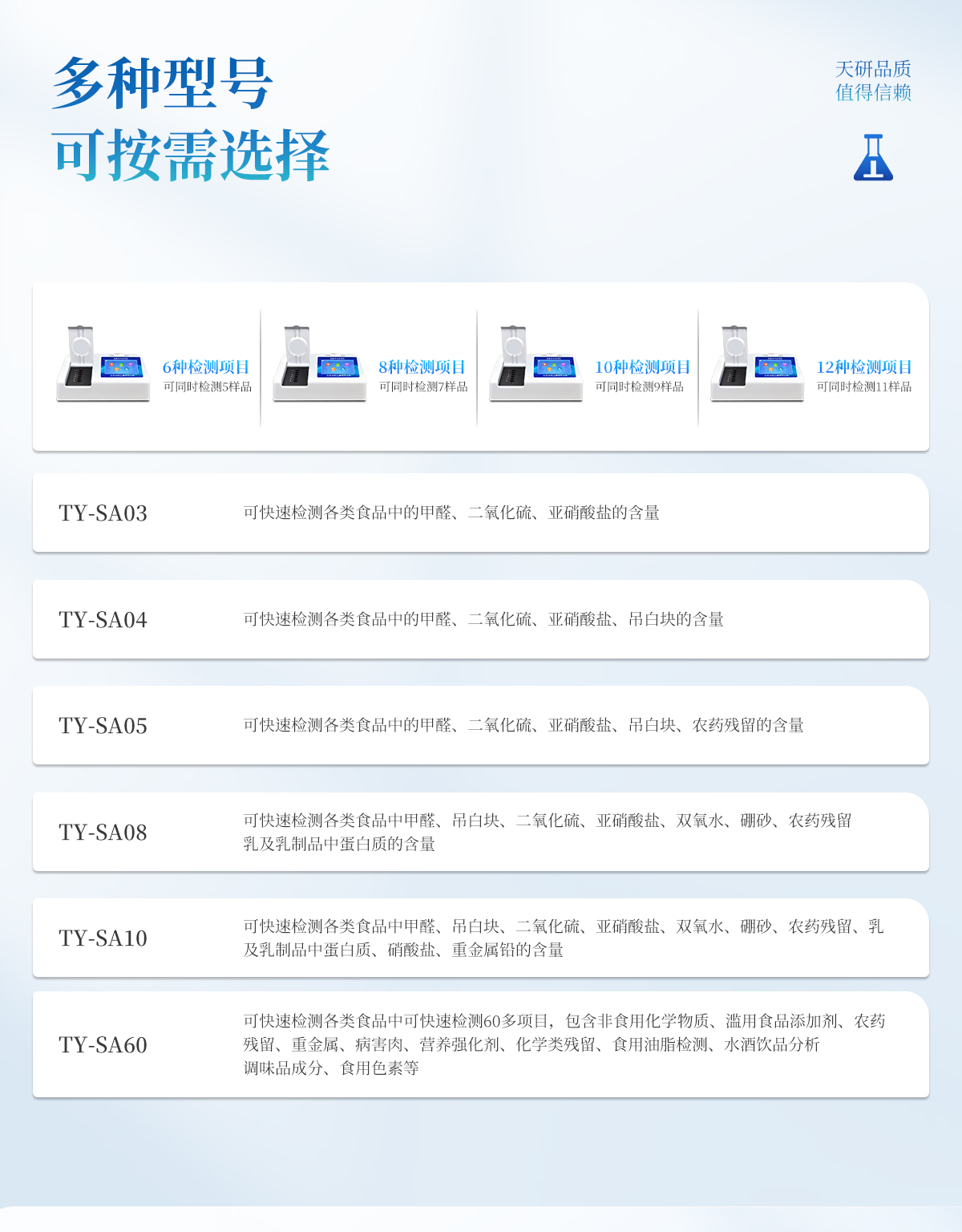 多功能食品安全檢測儀可快速檢測200多項目,包含非食用化學(xué)物質(zhì)、濫用食品添加劑、農(nóng)藥殘留、獸藥殘留、重金屬、病害肉、營養(yǎng)強(qiáng)化劑、抗生素類殘留、激素類殘留、真菌毒素類殘留、化學(xué)類殘留等現(xiàn)場的定性定量檢測。該多功能食品安全檢測儀為集成化食品安全快速檢測分析設(shè)備,廣泛應(yīng)用于市場監(jiān)管局、檢測中心、衛(wèi)生監(jiān)督部門、農(nóng)業(yè)部門、院校及各單位食堂、食品肉產(chǎn)品深加工企業(yè)、商超市場、司法部門、餐飲機(jī)構(gòu)、養(yǎng)殖場、屠宰場、檢驗檢疫部門等單位使用。