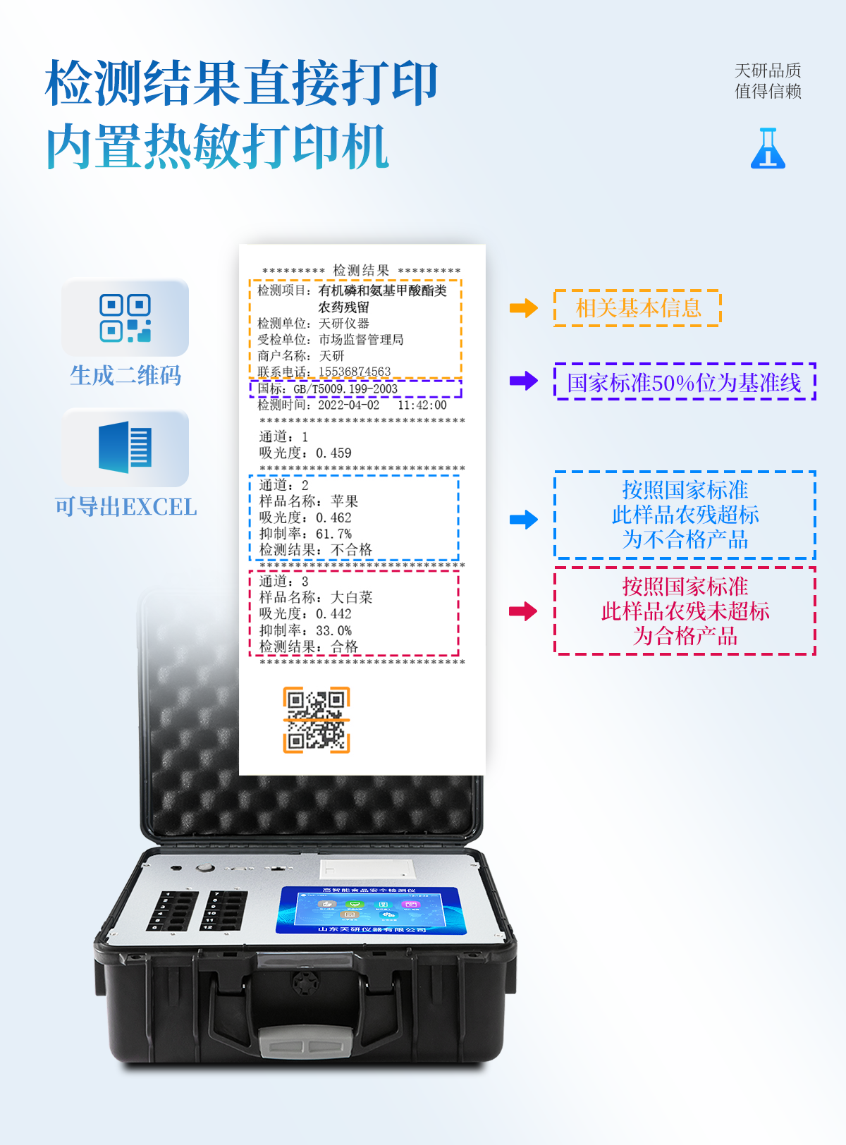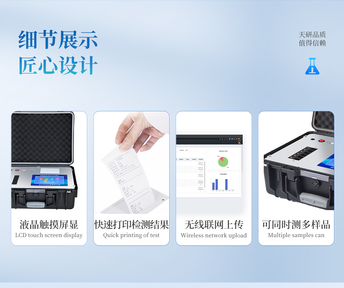 | 安卓智能操作系統(tǒng),采用更加**的UI交互界面,儀器具有wifi聯網上傳、4G聯網傳輸、GPRS無線遠傳、網線連接功能,快速批量上傳數據。 | 智能化程度高,儀器具有自檢功能:具有開機自檢和調零功能,具有自動檢測重復性功能。 | 新一代高速熱敏打印機,檢測完成可自動打印或批量打印檢測報告和二維碼。 | 儀器帶有監(jiān)管平臺,數據可局域網和互聯網數據上傳,檢測結果直接傳至食品安全監(jiān)管平臺。進行區(qū)域食品安全監(jiān)管及大數據分析處理與數據統(tǒng)計,檢測區(qū)域食品安全長短期動態(tài),達到食品安全問題預估、預警 | 一體化主機,包含食品安全檢測模塊、多通道農藥殘留檢測模塊、膠體金免疫層析檢測模塊。 | 一體化便攜式快檢設備,滿足現場及流動檢測使用需求,能夠在同一軟件下實現所有檢測項目的檢測,并可通過同一窗口直觀顯示檢測結果。 | 膠體金模塊檢測方式:軌道式自動傳輸掃描,檢測完成后自動退出檢測卡。 | CT線自動識別,無需手動調整。 | 內置強大的數據庫,具有多品類多種類樣品菜單功能,可靈活選擇檢測樣品,不同的檢測通道可同時檢測不同的樣品項目。也可在儀器上直接編輯錄入樣品名稱、檢測指標、送檢單位等信息并保存進樣品數據庫。 | 產品內置操作演示視頻,是您身邊的化驗指導專家。 | 樣品處理簡單省力,整體操作快速、安全、便捷。 | 儀器具有自身保護功能,可設置用戶名及密碼,防止非工作人員操作等。 | 高靈敏度,高檢測精度,高重復性精度,掃描式高精度光學傳感器。 | 結果判定線可修改,對照值標定值可保存,斷電不丟失數據。 | 兼容市場上所有的膠體金卡,使用耗材不受限制,極大增強用戶使用體驗。 | 儀器具有重新校準、鎖定、恢復出廠設置功能。 |