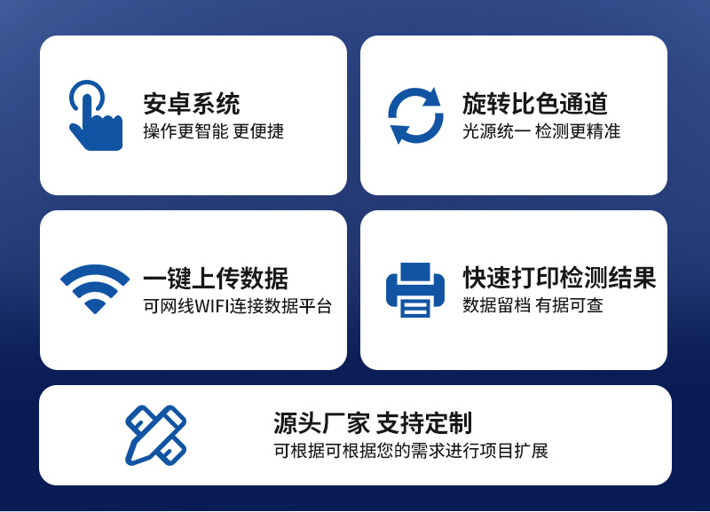 安卓智能操作系統(tǒng),采用更加**和人性化操作,儀器具有無線聯(lián)網(wǎng)上傳功能,快速上傳數(shù)據(jù),進行數(shù)據(jù)統(tǒng)計和分析。智能化程度高,儀器具有自檢功能:具有開機自檢和調(diào)零功能,具有自動檢測重復性功能;同時,檢測完成可自動打印檢測報告和二維碼。手機掃碼可顯示出詳細檢測信息。儀器帶有監(jiān)管平臺,數(shù)據(jù)可局域網(wǎng)和互聯(lián)網(wǎng)數(shù)據(jù)上傳,檢測結(jié)果直接傳至食品安全監(jiān)管平臺。進行區(qū)域食品安全監(jiān)管及大數(shù)據(jù)分析處理與數(shù)據(jù)統(tǒng)計,檢測區(qū)域食品安全長短期動態(tài),達到食品安全問題預估、預警 。樣品處理簡單省力,整體操作快速、安全、便捷。儀器具有自身保護功能,可設(shè)置用戶名及密碼,防止非工作人員操作等。內(nèi)置強大的數(shù)據(jù)庫,可在儀器上直接選擇樣品名稱、檢測指標、送檢單位等信息,也可在儀器上直接編輯錄入樣品名稱、檢測指標、送檢單位等信息并保存進樣品數(shù)據(jù)庫,方便后期操作調(diào)取使用。儀器具有重新校準、鎖定、恢復出廠設(shè)置功能。