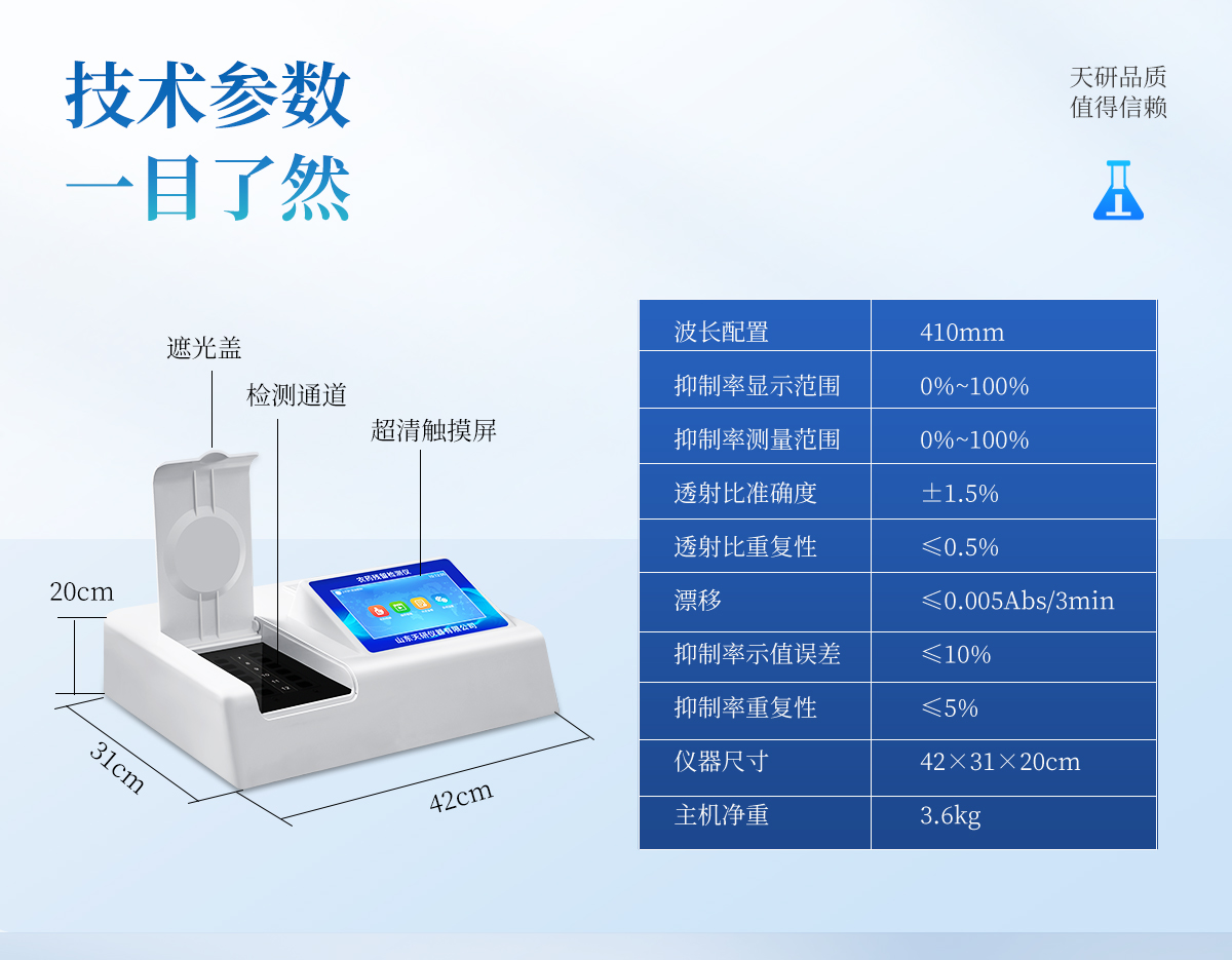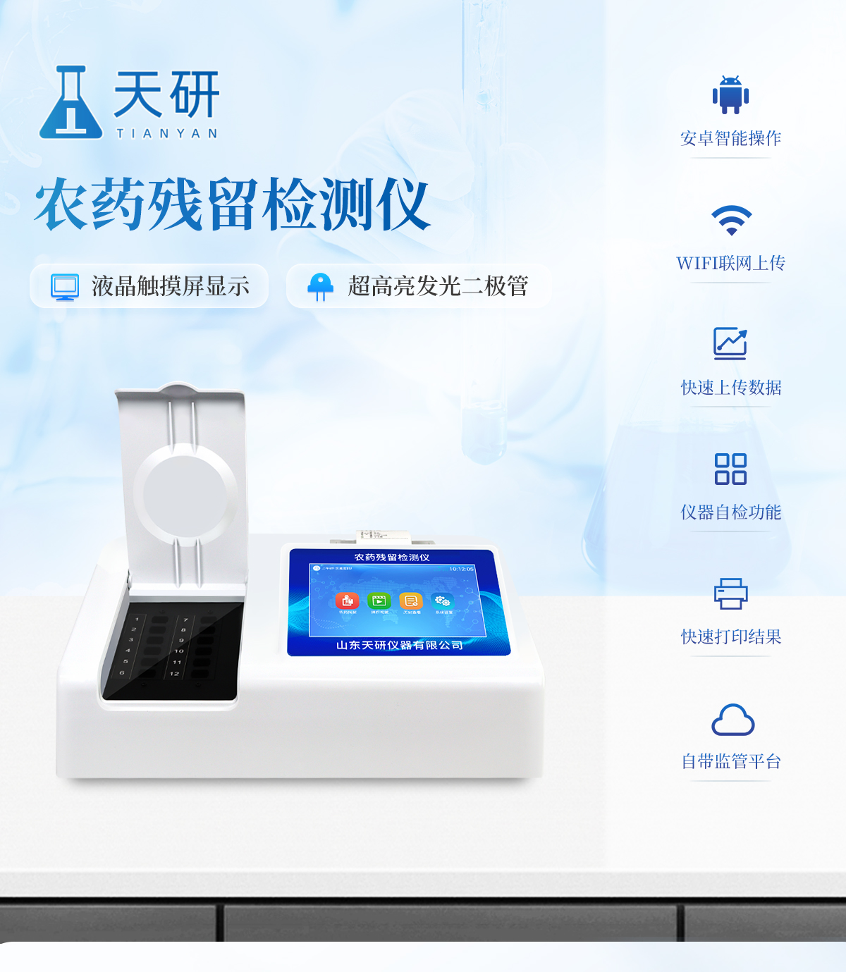 乙酰膽堿酯酶和丁酰膽堿酯酶試劑均可以使用,符合國家標(biāo)準(zhǔn)和農(nóng)業(yè)部標(biāo)準(zhǔn)的要求。自動判斷樣品是否合格,檢測結(jié)果更加直觀。儀器具有100多種蔬菜名稱菜單庫,分類管理,并可按需添加或刪除蔬菜名,編輯蔬菜名稱,可直接打印出蔬菜名稱。檢測通道:24個檢測通道,可以同時測試多個樣品,循環(huán)檢測,即放即檢,每個樣品由程序控制分別獨(dú)立工作,不會互相干擾。智能操作系統(tǒng),采用更加人性化操作,主控采用多核處理器,主頻1.88Ghz,運(yùn)轉(zhuǎn)速度更快速,穩(wěn)定性更強(qiáng)。顯示方式:7英寸高靈敏真彩觸摸屏顯示,人性化中文操作界面,讀數(shù)直觀、簡單。打印機(jī)采用串口5v打印,可選擇手動打印或者自動打印,三分鐘出打印結(jié)果,打印格式為檢測人姓名、吸光度差值、檢測時間、檢測機(jī)構(gòu)、樣品名稱及結(jié)果判定。光源采用進(jìn)口超高亮發(fā)光二極管,具有低功耗、高精度、穩(wěn)定性強(qiáng)、光源可控可以關(guān)掉不使用的光源,響應(yīng)速度快等優(yōu)點(diǎn)。智能恒流穩(wěn)壓,光強(qiáng)自動校準(zhǔn),長時間連續(xù)工作光源無溫漂現(xiàn)象。儀器具有GPRS遠(yuǎn)傳功能,可插手機(jī)卡實(shí)現(xiàn)數(shù)據(jù)遠(yuǎn)傳平臺,wifi聯(lián)網(wǎng)功能,可將數(shù)據(jù)快速上傳電腦,進(jìn)行數(shù)據(jù)管理與統(tǒng)計。采用USB2.0接口設(shè)計,方便數(shù)據(jù)的存貯和移動,并可隨時與計算機(jī)直接相連,并且可用計算機(jī)控制儀器。實(shí)現(xiàn)數(shù)據(jù)查詢、瀏覽、分析、統(tǒng)計、打印等。智能化程度高,儀器具有自檢功能:具有開機(jī)自檢和調(diào)零功能,具有自動檢測重復(fù)性功能儀器具有自身保護(hù)功能,可設(shè)置用戶名及密碼,防止非工作人員操作等。采用DC12v直流供電,安全系統(tǒng)更高,并且配備6A鋰電池充電器。儀器具有重新校準(zhǔn)、鎖定、恢復(fù)出廠設(shè)置功能。