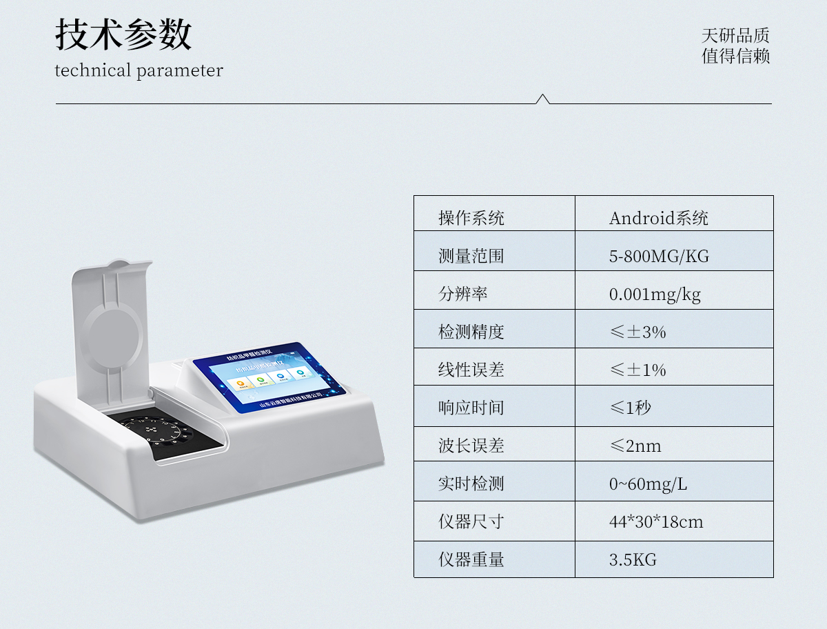 1、智能**且方便①智能芯片:主控芯片采用ARM Cortex-A7,RK3288/4核處理器,搭配安卓智能操作系統(tǒng),集實驗操作,分析結(jié)果,打印報告等功能于一體,使用方便,性能更強。②大屏顯示:采用10.1英寸液晶觸摸屏,單機即可操作,無需連接外部顯示或控制器。③多樣同檢:儀器具有12個檢測通道,可同時一次性檢測11個樣品,效率更高。④工作預(yù)設(shè):具有任務(wù)預(yù)設(shè)模塊,一鍵提前預(yù)設(shè)樣品所有信息內(nèi)容。來樣時可直接檢測,同時可多次調(diào)取。⑤數(shù)據(jù)分析:設(shè)備首頁自動匯總分析數(shù)據(jù),并繪制柱形分析圖,各項檢測數(shù)據(jù)一目了然,快捷直觀。⑥高度集成:模塊高度集合,將分光光度模塊、數(shù)字化管理模塊、無線通訊模塊集成于一體??蓪z測結(jié)果進行分析,直接上傳至數(shù)據(jù)平臺,實現(xiàn)數(shù)據(jù)共享,方便后期進行數(shù)據(jù)分析與統(tǒng)計。⑦遠(yuǎn)程升級:儀器具備遠(yuǎn)程升級功能,可遠(yuǎn)程升級程序,無需返廠,并可持續(xù)性免費更新系統(tǒng)版本,降低成本及運輸損耗風(fēng)險。2、檢測精準(zhǔn)且直觀①**技術(shù):精密旋轉(zhuǎn)比色池,使用同芯片同光源校準(zhǔn)精度,解決不同光源之間存在波長誤差的問題,更加準(zhǔn)確**。②結(jié)果直觀:儀器自動對檢測結(jié)果與國標(biāo)限量值進行對比,自動判定結(jié)果是否合格,結(jié)果更直觀。3、功能強大且實用①存儲功能:設(shè)備可以存儲數(shù)據(jù)100000組,可在屏幕上直觀查看歷史數(shù)據(jù),可導(dǎo)出數(shù)據(jù)。②打印功能:設(shè)備自帶打印功能,可對樣品信息及檢測結(jié)果無限次隨意打印。③全新方式:新創(chuàng)自定義打印方式,可按需靈活勾選控制:二維碼,抽樣信息、檢測信息,受檢信息、復(fù)核信息、抽樣日期、檢測日期等信息的打印④多重編輯:樣品信息可多重編輯,可以對每個通道屬性和樣品信息單獨進行編輯,例如樣品信息、抽樣信息、檢測信息,受檢信息、復(fù)核信息、抽樣日期、檢測日期等信息等。⑤雙語設(shè)計:全中文/英文操作菜單,簡單實用,適用于不同用戶的需求。