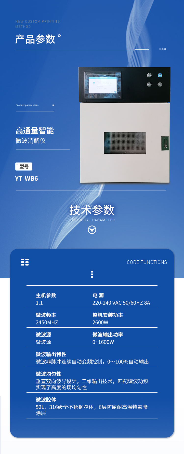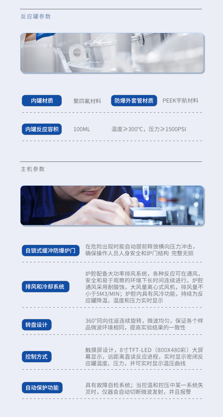 主機參數(shù);1.1電 源:220-240 VAC 50/60Hz 8A ;微波頻率:2450MHz;整機安裝功率:2600W;(1)電源要求:220 VAC 50 Hz 15A;(2)微波源:(3)微波輸出功率 :0~1600W;(4)微波輸出特性:微波非脈沖連續(xù)自動變頻控制,0~100%自動輸出;(5)微波均勻性:垂直雙向波導(dǎo)設(shè)計,三維輸出技術(shù),匹配諧波功頻實現(xiàn)了高度的場均勻性;(6)微波腔體:52L,316級全不銹鋼腔體,6層防腐耐高溫特氟隆涂層;(7)自鎖式緩沖防爆爐門,在危險出現(xiàn)時能自動提前釋放橫向壓力沖擊,確保操作人員人身安全和爐門結(jié)構(gòu)  完整無損;(8)排風(fēng)和冷卻系統(tǒng):爐腔配備大功率排風(fēng)系統(tǒng),各種反應(yīng)可在通風(fēng),安全和易于觀察的環(huán)境下長時間連續(xù)進行。爐腔通風(fēng)采用耐酸蝕,大風(fēng)量離心式風(fēng)機,排風(fēng)量不小于5m3/min;爐腔內(nèi)具有風(fēng)冷功能,持續(xù)為反應(yīng)罐降溫,溫度和壓力實時顯示。(9)轉(zhuǎn)盤設(shè)計:360°同向往返連續(xù)旋轉(zhuǎn),微波均勻,保證各個樣品微波環(huán)境相同,提高實驗結(jié)果的一致性。(10)控制方式:觸摸屏設(shè)計,8寸TFT-LED(800X480彩)大屏幕顯示,遠(yuǎn)距離直讀反應(yīng)進程,實時顯示密閉反應(yīng)罐溫度、壓力,并可實時顯示溫壓曲線;(11)操作語言:中文簡體(12)自動保護功能:具有故障自檢系統(tǒng);當(dāng)控溫和控壓中某一系統(tǒng)失靈時,儀器會自動切斷微波發(fā)射,并且報警;