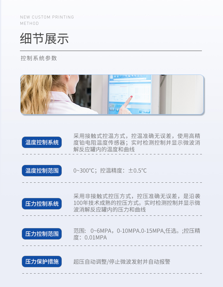 (1)溫度控制系統(tǒng):采用接觸式控溫方式,控溫準(zhǔn)確無誤差,使用高精度鉑電阻溫度傳感器;實時檢測控制并顯示微波消解反應(yīng)罐內(nèi)的溫度和曲線;(2)溫度控制范圍:0~300℃;控溫精度:±0.5℃;(3)控溫能力:速率升溫功能。(4)壓力控制系統(tǒng):采用非接觸式控壓方式,控壓準(zhǔn)確無誤差,是沿襲100年技術(shù)成熟的控壓方式。實時檢測控制并顯示微波消解反應(yīng)罐內(nèi)的壓力和曲線;(5)壓力控制范圍:范圍: 0~6MPa,0-10MPa.0-15MPa,任選。;控壓精度:0.01MPa;(6)壓力保護:超壓自動調(diào)整/停止微波發(fā)射并自動報警;