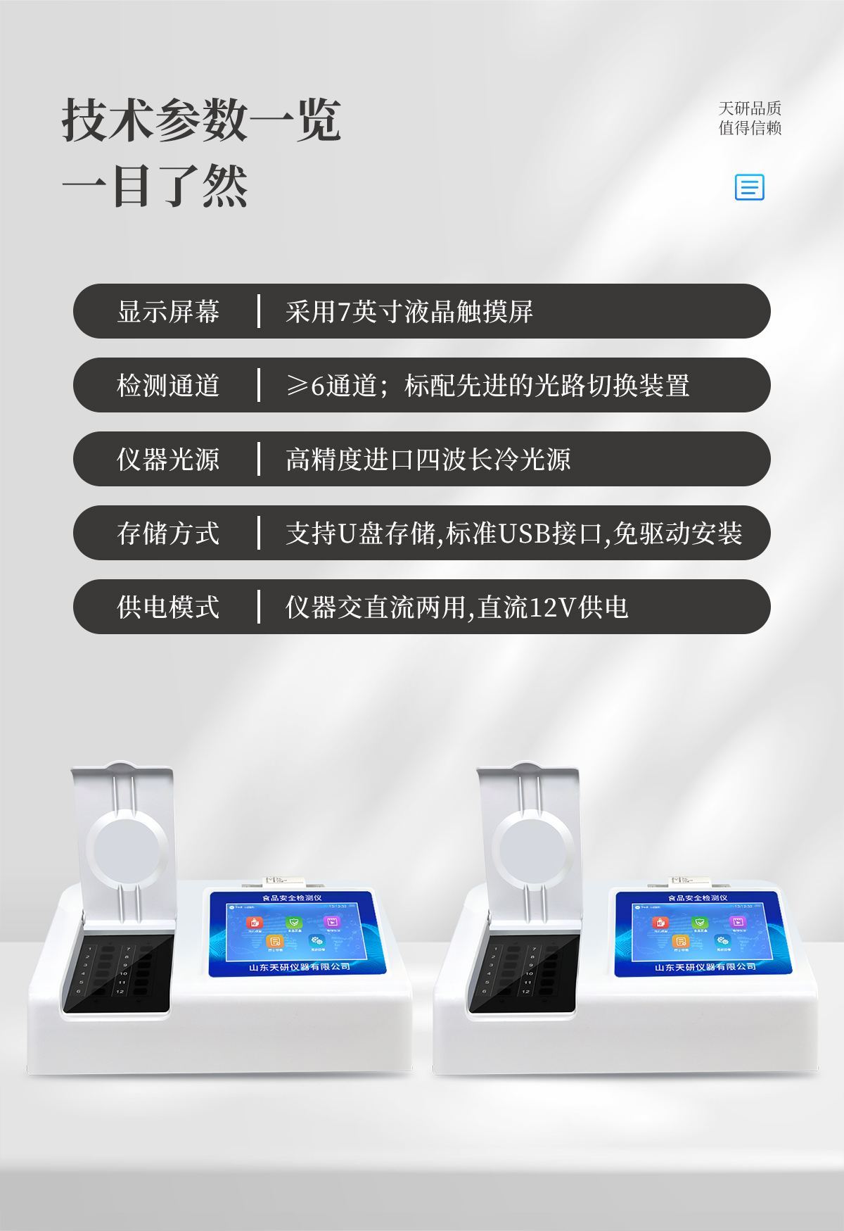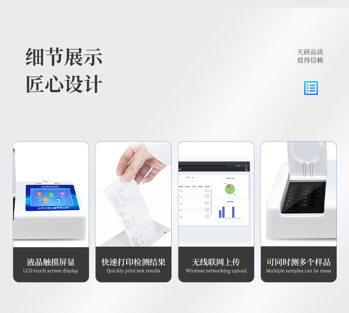 儀器采用臺式一體化系統(tǒng)檢測技術(shù),將分光光度模塊、新型農(nóng)殘檢測模塊、數(shù)字化管理模塊、無線通訊模塊高度集成于一體,支持檢測200種食品安全檢測項目,同時預(yù)留升級檢測方法。儀器檢測模塊標(biāo)準(zhǔn)化、智能化,可隨意自由組合。檢測箱體內(nèi)置多個標(biāo)準(zhǔn)檢測單元,檢測模塊可以調(diào)整配置。儀器采用全新安卓智能系統(tǒng),主控芯片采用 ARM Cortex-A7,RK3288/4核處理器,10.1寸高清液晶觸摸豎屏,更加**的UI交互界面,運轉(zhuǎn)快捷;儀器配備無線通信模塊: 4G(APN)通訊模塊、Wifi模塊,藍牙傳輸,同時具有雙USB接口以及RJ45接口能以多種方式實現(xiàn)數(shù)據(jù)保存和數(shù)據(jù)傳輸功能。創(chuàng)新檢測模式:★檢測通道:≥12通道;采用精密旋轉(zhuǎn)比色池設(shè)計,使用同芯片同光源校準(zhǔn)精度,解決不同光源之間的誤差值。1-12通道間誤差0.1%。(**號:ZL202022821055.2)★儀器具有自動識別比色皿檢測功能,即:將樣品比色皿放入儀器后,點擊樣品檢測,儀器自動識別比色皿進行通道檢測。進口高精光源:高精度進口四波長冷光源,通道配置 410、520、590、630nm 波長光源,一個光源芯片驅(qū)動一個光源,誤差極小,每臺設(shè)備單獨**校準(zhǔn)光源,**比對,同時參照四種不同波段光源全方位覆蓋市面上99%的農(nóng)殘食品項目檢測。智能化操作系統(tǒng):便捷操作系統(tǒng):設(shè)備檢測時可在同一檢測界面自動對應(yīng)相關(guān)檢測通道一次性選擇1-12個樣品名稱,無須退出界面,節(jié)省操作時間。數(shù)據(jù)集成系統(tǒng):設(shè)備首頁自動統(tǒng)計檢測數(shù)據(jù)包含:周檢測數(shù)據(jù)、月檢測數(shù)據(jù),全部檢測總數(shù)量,均包含檢測總數(shù),合格數(shù),不合格數(shù),以及相關(guān)柱形分析圖,對各項檢測數(shù)據(jù)清晰掌握,無需電腦查詢,更加快捷直觀。項目預(yù)設(shè)系統(tǒng):支持添加單個及多個相同或不相同的任務(wù)預(yù)設(shè),一鍵快速調(diào)取,每一個任務(wù)分別可以設(shè)置不同的樣品、批次、編號、來源、備注、抽樣信息、檢測信息、受檢信息、復(fù)核信息等更多信息。無縫鏈接平臺和APP實時查看下發(fā)任務(wù)。數(shù)據(jù)監(jiān)管系統(tǒng):同步對接監(jiān)管平臺,數(shù)據(jù)可局域網(wǎng)和互聯(lián)網(wǎng)數(shù)據(jù)上傳,檢測結(jié)果可選擇直接傳至食品安全監(jiān)管平臺。集成OSS輸出存儲服務(wù)、區(qū)分設(shè)備定向管理應(yīng)用,進行區(qū)域食品安全監(jiān)管及大數(shù)據(jù)分析處理與數(shù)據(jù)統(tǒng)計,檢測區(qū)域食品安全長短期動態(tài),達到食品安全問題預(yù)估、預(yù)警。自定義打印系統(tǒng):內(nèi)置全新打印系統(tǒng),新創(chuàng)自定義打印方式,可按需靈活設(shè)置開啟或關(guān)閉:產(chǎn)品合格證(國家農(nóng)業(yè)部標(biāo)準(zhǔn)要求),二維碼,抽樣信息、檢測信息,受檢信息、復(fù)核信息、抽樣日期、檢測日期等信息的打印。系統(tǒng)遠程更新功能:可定向分客戶分儀器更新系統(tǒng),按照不同客戶后期實際需求添加項目,無需機器返廠,即可遠程實時升級全新系統(tǒng),節(jié)省時間成本及避免運輸造成設(shè)備損壞。儀器主機采用一體化防水、抗壓、防撞擊、防腐蝕箱體設(shè)計,同時配備交直流供電,可連接車載電源,可選配大容量充電鋰電池,滿足現(xiàn)場野外檢測需求。安全證書,放心保障:儀器具有中國計量科學(xué)研究院校準(zhǔn)證書,**認證。