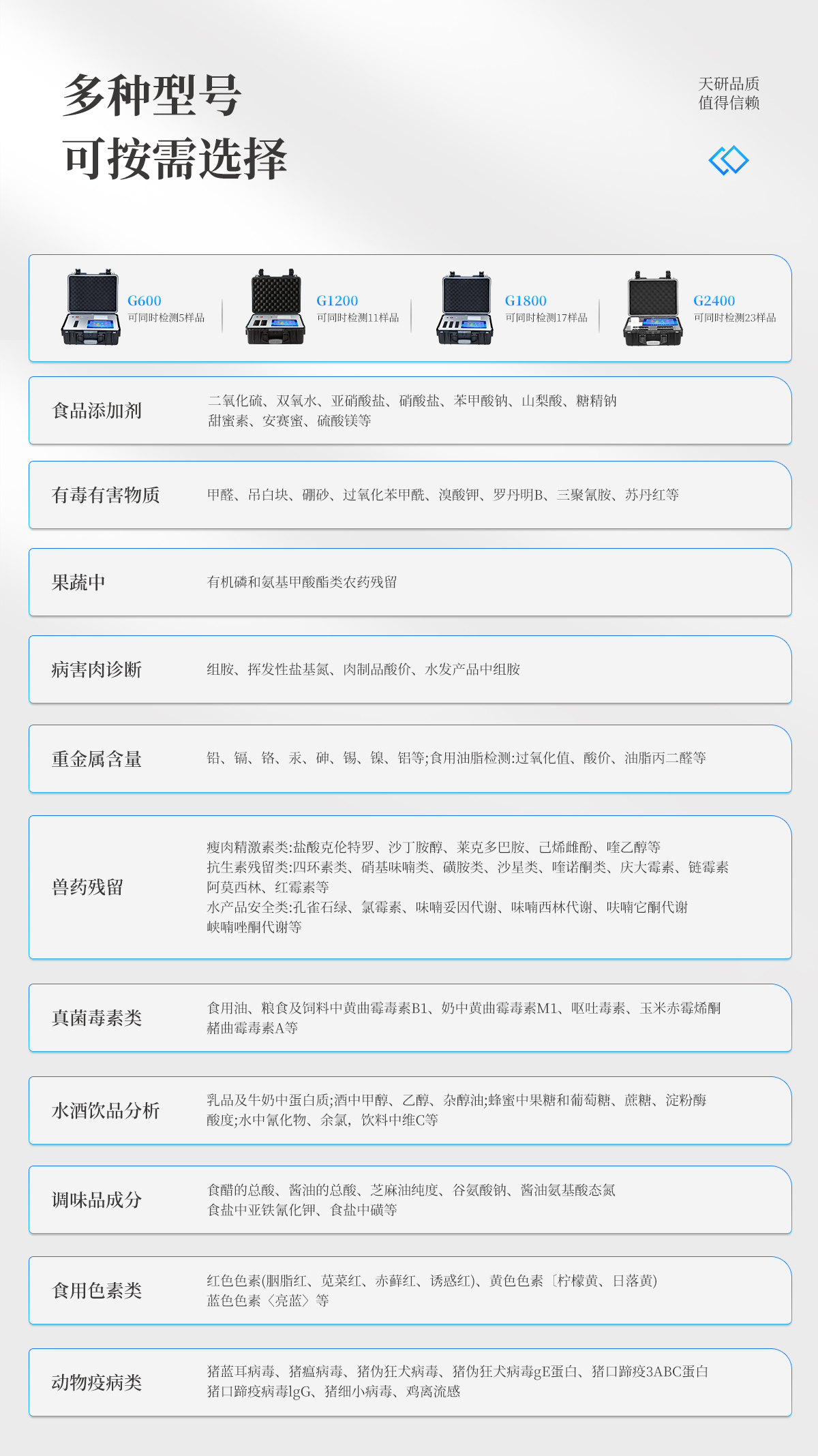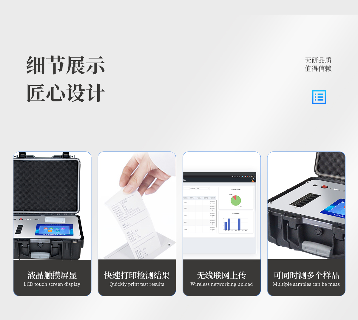 儀器采用手提式一體化系統(tǒng)檢測技術(shù),將分光光度模塊、新型農(nóng)殘檢測模塊、數(shù)字化管理模塊、無線通訊模塊高度集成于一體,支持檢測200種食品安全檢測項目,同時預(yù)留升級檢測方法。儀器檢測模塊標準化、智能化,檢測項目可隨意自由組合。檢測箱體內(nèi)置多個標準檢測單元,檢測模塊可以調(diào)整配置。顯示屏幕:儀器采用10.1英寸豎向液晶觸摸屏顯,搭配運行安卓智能操作系統(tǒng),主控芯片采用ARM Cortex-A7,RK3288/4核處理器,主頻1.88Ghz,操作方便,性能更強。檢測通道:≥12通道;采用精密旋轉(zhuǎn)比色池設(shè)計,使用同芯片同光源校準精度,解決不同光源之間的誤差值,更加準確**。(1-12通道間誤差0.1%,**號:ZL202022821055.2)儀器光源:高精度進口四波長冷光源,每個通道均配置 410、520、590、630nm 波長光源,標配**的光路切換裝置,**光路切換功能可實現(xiàn)64波長,并且所有檢測項目可實現(xiàn)所有通道同時檢測。設(shè)備可一鍵校準,自動保存校準數(shù)據(jù),自動對比校驗,得到精準光源,采用Android SP存儲數(shù)據(jù),光源數(shù)據(jù)永不丟失,方便每一次使用。通訊接口:配備無線通信模塊、4G(APN)通訊模塊、藍牙傳輸,同時具有雙USB接口以及RJ45網(wǎng)線接口,可以多方式實現(xiàn)數(shù)據(jù)保存及數(shù)據(jù)傳輸存儲方式:支持U盤存儲,標準USB接口,免驅(qū)動安裝。檢測結(jié)果存儲容量20萬條以上,可生成Excel表格進行拷貝,并具有登錄保護功能。智能化操作系統(tǒng):1)操作系統(tǒng):儀器可在同一檢測界面自動對應(yīng)相關(guān)檢測通道,一次性選擇1-12個樣品名稱,無需退出界面,節(jié)省操作時間。并可以對每個通道屬性和樣品信息單獨進行編輯,例如送檢單位、人員,檢測人員等,打印時勾選打印顯示。2)數(shù)據(jù)集成系統(tǒng):設(shè)備首頁自動匯總分析檢測數(shù)據(jù),包含:周檢測數(shù)據(jù)、月檢測數(shù)據(jù),全部檢測總數(shù)量,均包含檢測總數(shù),合格數(shù),不合格數(shù),以及相關(guān)柱形分析圖,各項檢測數(shù)據(jù)一目了然,無需電腦查詢,更加快捷直觀。3)數(shù)據(jù)庫系統(tǒng):十幾項數(shù)據(jù)庫分類管理儀器:包含項目類型、項目數(shù)據(jù)、檢測數(shù)據(jù)、歷史記錄、國標信息、曲線信息、采樣信息、檢測信息、受檢信息、復(fù)核信息、圖表信息、光源校準信息、打印樣式信息、樣品庫信息等等,數(shù)據(jù)庫之間互相協(xié)調(diào)聯(lián)動保證數(shù)據(jù)的真實完整性。同時產(chǎn)品數(shù)據(jù)庫以及歷史檢測記錄支持一鍵檢索功能。4)限量規(guī)判系統(tǒng):具有限量查詢、添加物質(zhì)合規(guī)判定系統(tǒng)。檢測出結(jié)果后,系統(tǒng)自動調(diào)用系統(tǒng)數(shù)據(jù)庫中相關(guān)國標進行比對判定,客觀顯示判定結(jié)果是否合格。5)項目預(yù)設(shè)系統(tǒng):儀器具有任務(wù)預(yù)設(shè)模塊,一鍵提前預(yù)設(shè),給出方便快捷的新檢測方案,每一個任務(wù)分別可以設(shè)置不同的樣品、批次、編號、來源、備注、抽樣信息、檢測信息、受檢信息、復(fù)核信息等更多信息。樣品送檢時一鍵調(diào)取保存信息,并可多次調(diào)取,大大提高檢測效率。6)數(shù)據(jù)監(jiān)管系統(tǒng):同步對接監(jiān)管平臺,數(shù)據(jù)可局域網(wǎng)和互聯(lián)網(wǎng)數(shù)據(jù)上傳,檢測結(jié)果可選擇直接傳至食品安全監(jiān)管平臺。進行區(qū)域食品安全監(jiān)管及大數(shù)據(jù)分析處理與數(shù)據(jù)統(tǒng)計,檢測區(qū)域食品安全長短期動態(tài),達到食品安全問題預(yù)估、預(yù)警。7)打印系統(tǒng):內(nèi)置全新打印機,新創(chuàng)自定義打印方式,可按需靈活勾選控制:產(chǎn)品合格證(國家農(nóng)業(yè)部標準要求),二維碼,抽樣信息、檢測信息,受檢信息、復(fù)核信息、抽樣日期、檢測日期等信息的打印。供電模式:儀器交直流兩用,直流12V供電,可連接車載電源,可配6ah大容量充電鋰電池,電量可實時顯示,方便戶外流動測試。膠體金檢測模塊:采用雙通道CMOS成像處理技術(shù)及膠體金免疫層析技術(shù),可同時讀取雙膠體金卡數(shù)據(jù),自動采集、處理分析,將檢測結(jié)果顯示,并可根據(jù)參考限值自動判斷檢測結(jié)果,可檢測常見的獸藥殘留、生物毒素、抗生素、違禁添加物等。1)探測技術(shù):CMOS成像探測;2)檢測通道:1個通道;3)檢測方式:消線法和比色法;4)顯示模式:陰性或陽性;5)曲線形式:軌道式掃描方式,顯示金標卡圖像,實時生成、識別CT曲線圖,無需手動調(diào)整,完成檢測后自動退出檢測卡。兼容市場上其他金標卡,使用耗材不受限制。儀器加入遠程升級功能,可定向分客戶分儀器更新,開機后自動更新,客戶無需任何操作,即可升級全新項目。做到了無需退換機器即可實現(xiàn)實時遠程升級檢測儀器。