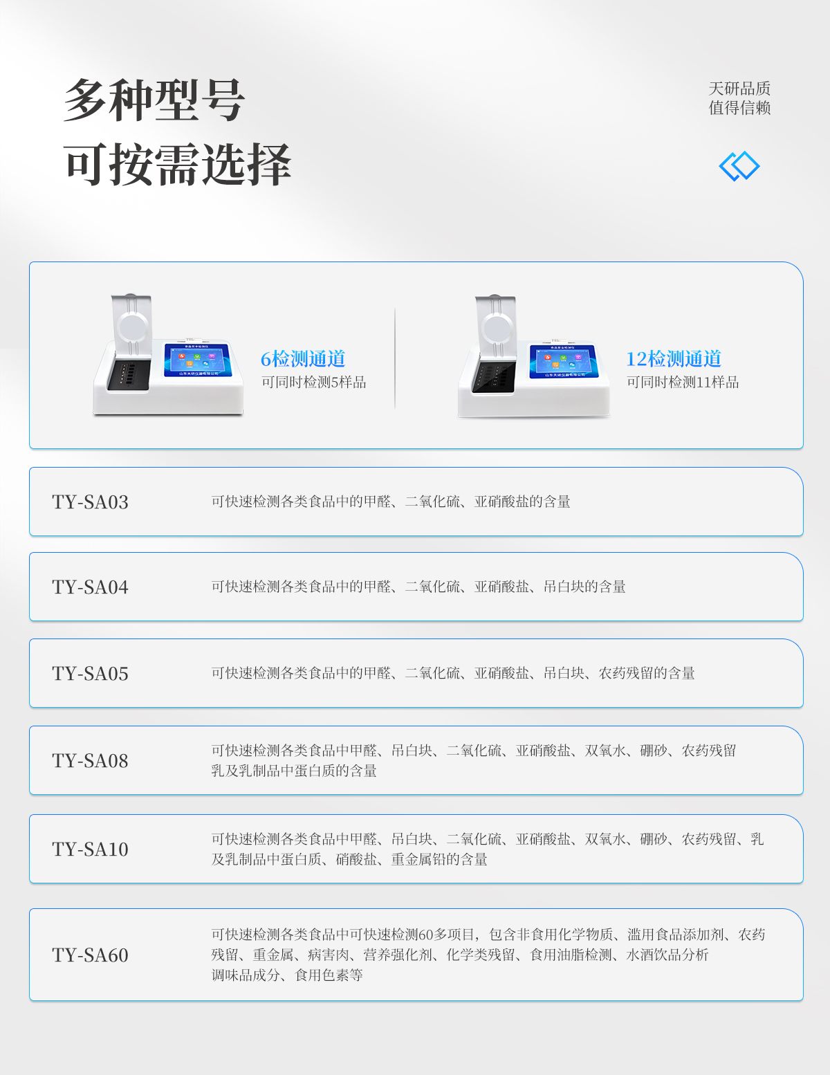 | 安卓智能操作系統(tǒng),采用更加**UI交互界面,儀器具有wifi聯(lián)網(wǎng)上傳、4G聯(lián)網(wǎng)傳輸、GPRS無線遠傳、網(wǎng)線連接功能,快速批量上傳數(shù)據(jù)。 | 智能化程度高,儀器具有自檢功能:具有開機自檢和調(diào)零功能,具有自動檢測重復(fù)性功能。 | 新一代高速熱敏打印機,檢測完成可自動打印或批量打印檢測報告和二維碼。 | 儀器帶有監(jiān)管平臺,數(shù)據(jù)可局域網(wǎng)和互聯(lián)網(wǎng)數(shù)據(jù)上傳,檢測結(jié)果直接傳至食品安全監(jiān)管平臺。進行區(qū)域食品安全監(jiān)管及大數(shù)據(jù)分析處理與數(shù)據(jù)統(tǒng)計,檢測區(qū)域食品安全長短期動態(tài),達到食品安全問題預(yù)估、預(yù)警 | 一體化主機,包含光電比色檢測模塊、膠體金免疫層析檢測模塊。 | 一體化便攜式快檢設(shè)備,滿足現(xiàn)場及流動檢測使用需求,能夠在同一軟件下實現(xiàn)所有檢測項目的檢測,并可通過同一窗口直觀顯示檢測結(jié)果。 | 膠體金模塊檢測方式:軌道式自動傳輸掃描,檢測完成后自動退出檢測卡。 | CT線自動識別,無需手動調(diào)整。 | 儀器具有多品類多種類樣品菜單庫,可靈活選擇檢測樣品,不同的檢測通道可同時檢測不同的樣品項目。也可在儀器上直接編輯錄入樣品名稱、檢測指標、送檢單位等信息并保存進樣品數(shù)據(jù)庫。 | 儀器內(nèi)置操作視頻,是您身邊的化驗指導(dǎo)專家。 | 樣品處理簡單省力,整體操作快速、安全、便捷。 | 儀器具有自身保護功能,可設(shè)置用戶名及密碼,防止非工作人員操作等。 | 高靈敏度,高檢測精度,高重復(fù)性精度,掃描式高精度光學傳感器。 | 儀器具有重新校準、鎖定、恢復(fù)出廠設(shè)置功能。 | 結(jié)果判定線可修改,對照值標定值可保存,斷電不丟失數(shù)據(jù)。 | 兼容市場上所有的膠體金卡,使用耗材不受限制,極大增強用戶使用體驗。 |