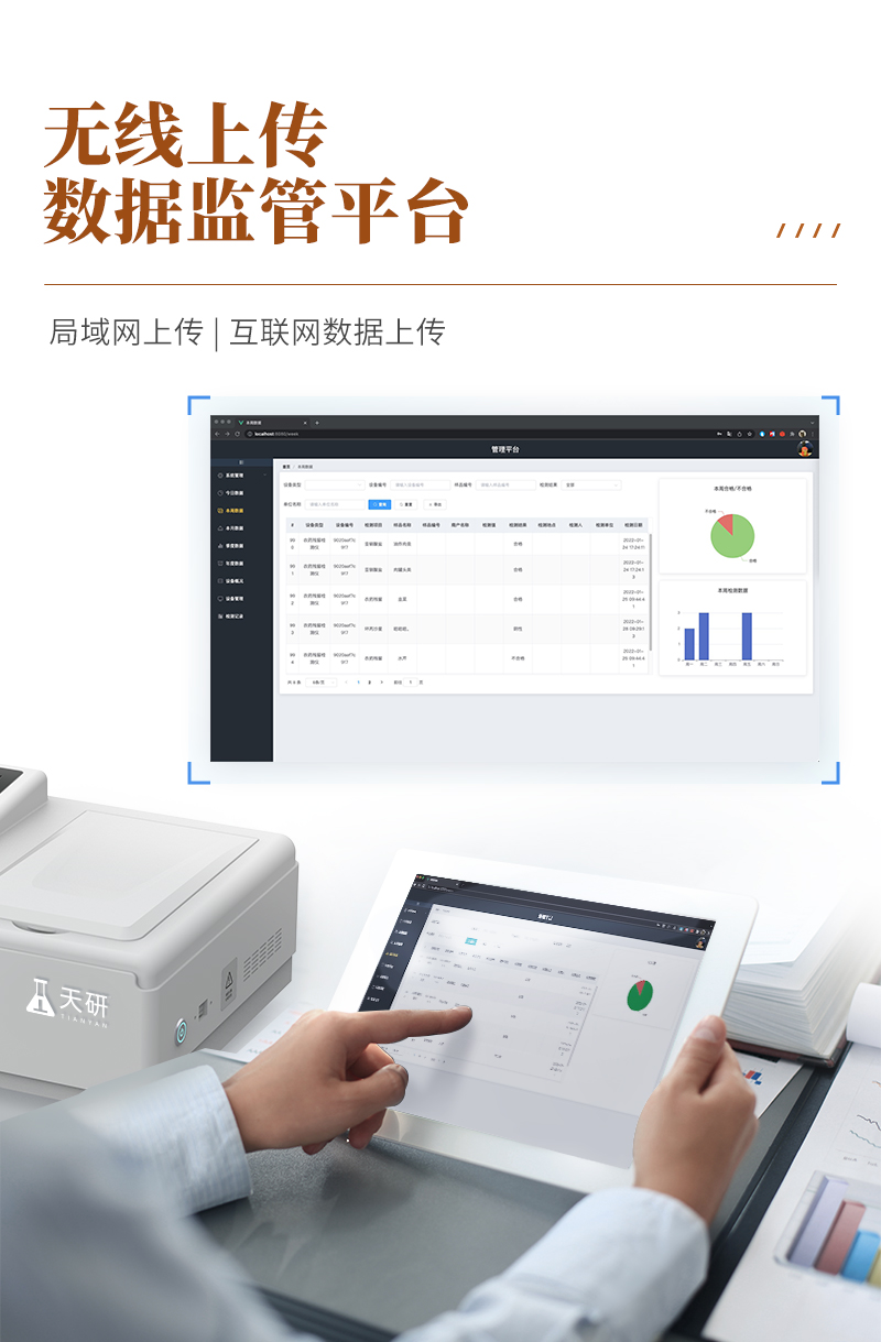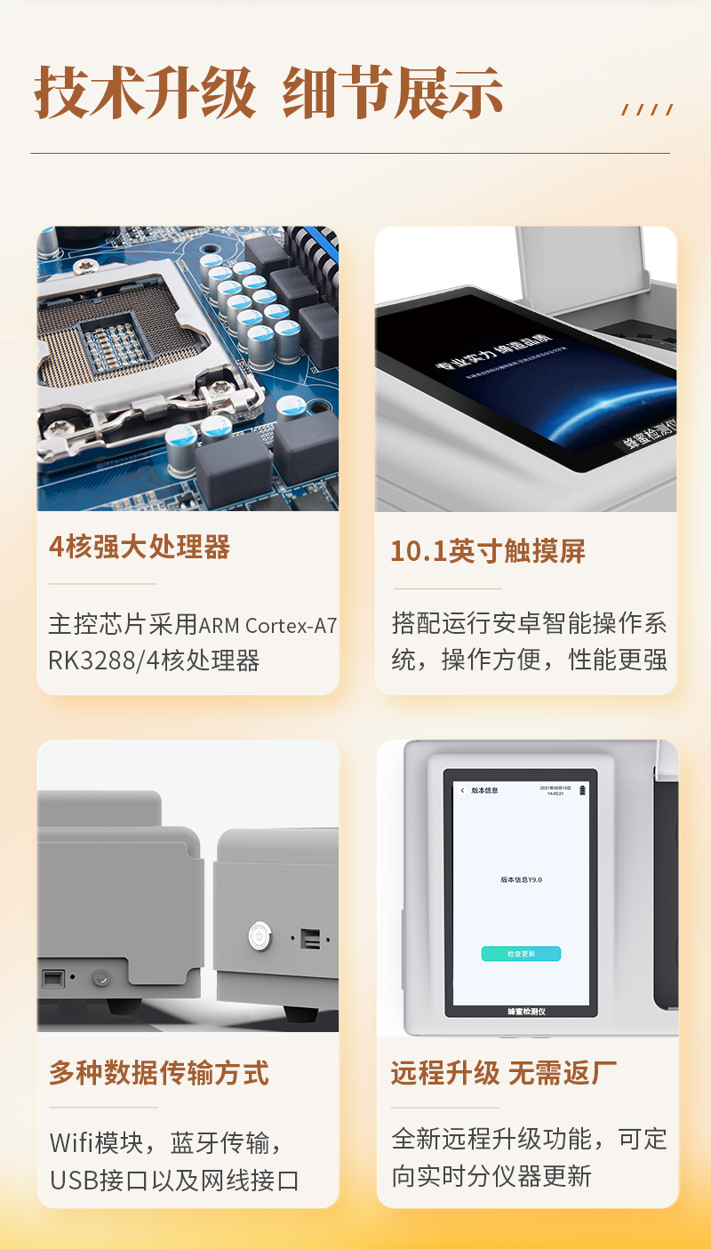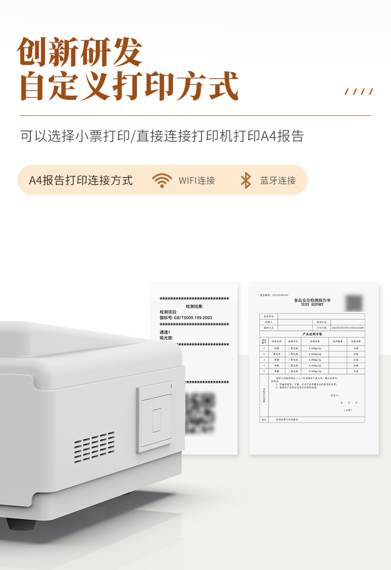 儀器采用手提式一體化系統(tǒng)檢測技術,將分光光度模塊、膠體金檢測模塊、新型農(nóng)殘檢測模塊、數(shù)字化管理模塊、無線通訊模塊高度集成于一體,支持檢測200種食品安全檢測項目,同時預留升級檢測方法。儀器檢測模塊標準化、智能化,可隨意自由組合。檢測箱體內置多個標準檢測單元,檢測模塊可以調整配置。儀器采用全新安卓智能系統(tǒng),主控芯片采用 ARM Cortex-A7,RK3288/4核處理器,10.1寸高清液晶觸摸豎屏,更加**的UI交互界面,運轉快捷;儀器配備無線通信模塊: 4G(APN)通訊模塊、Wifi模塊,藍牙傳輸,同時具有雙USB接口以及RJ45接口能以多種方式實現(xiàn)數(shù)據(jù)保存和數(shù)據(jù)傳輸功能。創(chuàng)新檢測模式:★檢測通道:≥12通道;采用精密旋轉比色池設計,使用同芯片同光源校準精度,解決不同光源之間的誤差值。1-12通道間誤差0.1%。(**號:ZL202022821055.2)★儀器具有自動識別比色皿檢測功能,即:將樣品比色皿放入儀器后,點擊樣品檢測,儀器自動識別比色皿進行通道檢測。進口高精光源:高精度進口四波長冷光源,通道配置 410、520、590、630nm 波長光源,一個光源芯片驅動一個光源,誤差極小,每臺設備單獨**校準光源,**比對,同時參照四種不同波段光源全方位覆蓋市面上99%的農(nóng)殘食品項目檢測。膠體金模塊檢測方式:★采用COMS實時成像技術,單金標實時讀卡,通過不同顏色的灰度變化,一秒精準得出結果。智能操作分析系統(tǒng):★便捷操作系統(tǒng):設備檢測時可在同一檢測界面自動對應相關檢測通道一次性選擇1-12個樣品名稱,無須退出界面,節(jié)省操作時間。★數(shù)據(jù)集成系統(tǒng):設備首頁自動統(tǒng)計檢測數(shù)據(jù)包含:周檢測數(shù)據(jù)、月檢測數(shù)據(jù),全部檢測總數(shù)量,均包含檢測總數(shù),合格數(shù),不合格數(shù),以及相關柱形分析圖,對各項檢測數(shù)據(jù)清晰掌握,無需電腦查詢,更加快捷直觀。★項目預設系統(tǒng):支持添加單個及多個相同或不相同的任務預設,一鍵快速調取,每一個任務分別可以設置不同的樣品、批次、編號、來源、備注、抽樣信息、檢測信息、受檢信息、復核信息等更多信息。無縫鏈接平臺和APP實時查看下發(fā)任務。★數(shù)據(jù)監(jiān)管系統(tǒng):同步對接監(jiān)管平臺,數(shù)據(jù)可局域網(wǎng)和互聯(lián)網(wǎng)數(shù)據(jù)上傳,檢測結果可選擇直接傳至食品安全監(jiān)管平臺。集成OSS輸出存儲服務、區(qū)分設備定向管理應用,進行區(qū)域食品安全監(jiān)管及大數(shù)據(jù)分析處理與數(shù)據(jù)統(tǒng)計,檢測區(qū)域食品安全長短期動態(tài),達到食品安全問題預估、預警。★自定義打印系統(tǒng):內置全新打印系統(tǒng),新創(chuàng)自定義打印方式,可按需靈活設置開啟或關閉:產(chǎn)品合格證(國家農(nóng)業(yè)部標準要求),二維碼,抽樣信息、檢測信息,受檢信息、復核信息、抽樣日期、檢測日期等信息的打印。★系統(tǒng)遠程更新功能:可定向分客戶分儀器更新系統(tǒng),按照不同客戶后期實際需求添加項目,無需機器返廠,即可遠程實時升級全新系統(tǒng),節(jié)省時間成本及避免運輸造成設備損壞。儀器主機采用一體化防水、抗壓、防撞擊、防腐蝕箱體設計,同時配備交直流供電,可連接車載電源,可選配大容量充電鋰電池,滿足現(xiàn)場野外檢測需求。安全證書,放心保障:儀器具有中國計量科學研究院校準證書,**認證。