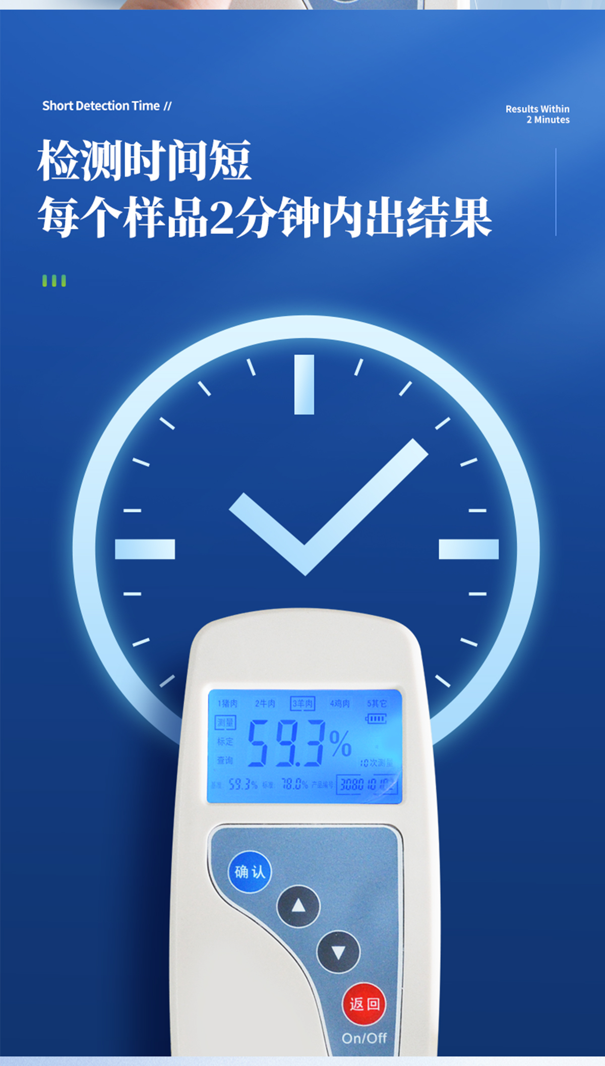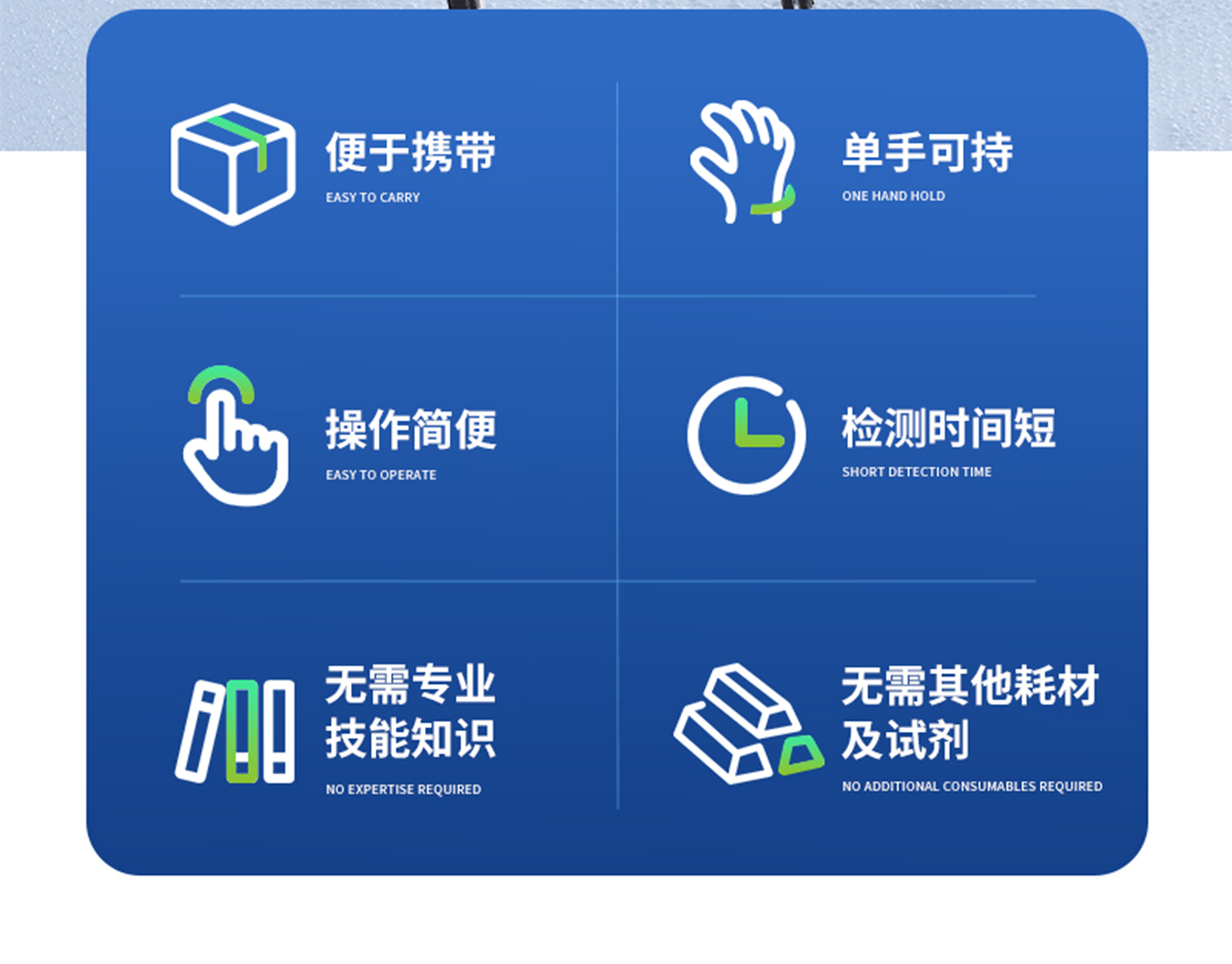 便于攜帶,單手可持可根據測定對象的品種,設定相應的判斷標準值操作簡便,檢測人員無需專業(yè)技能知識檢測時間短,每個樣品2分鐘內出結果;檢測試驗無需其他耗材及試劑
