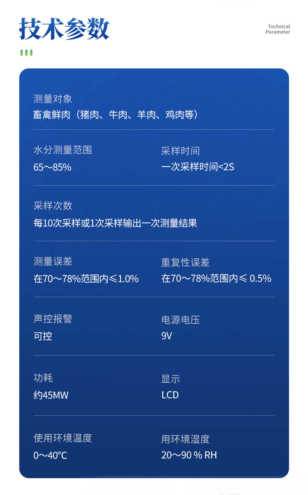 畜禽鮮肉(豬肉、牛肉、羊肉、雞肉等)65~85%一次采樣時間< 1s每10次采樣或1次采樣輸出一次測量結果在70~78%范圍內≤1.0%在70~78%范圍內≤ 0.5%超標報警可設定每個品種的判斷標準。交直流兩用觸摸式按鍵45mW167×70×30mm藍色背光LCD0~40℃20~90 % RHUSB接口