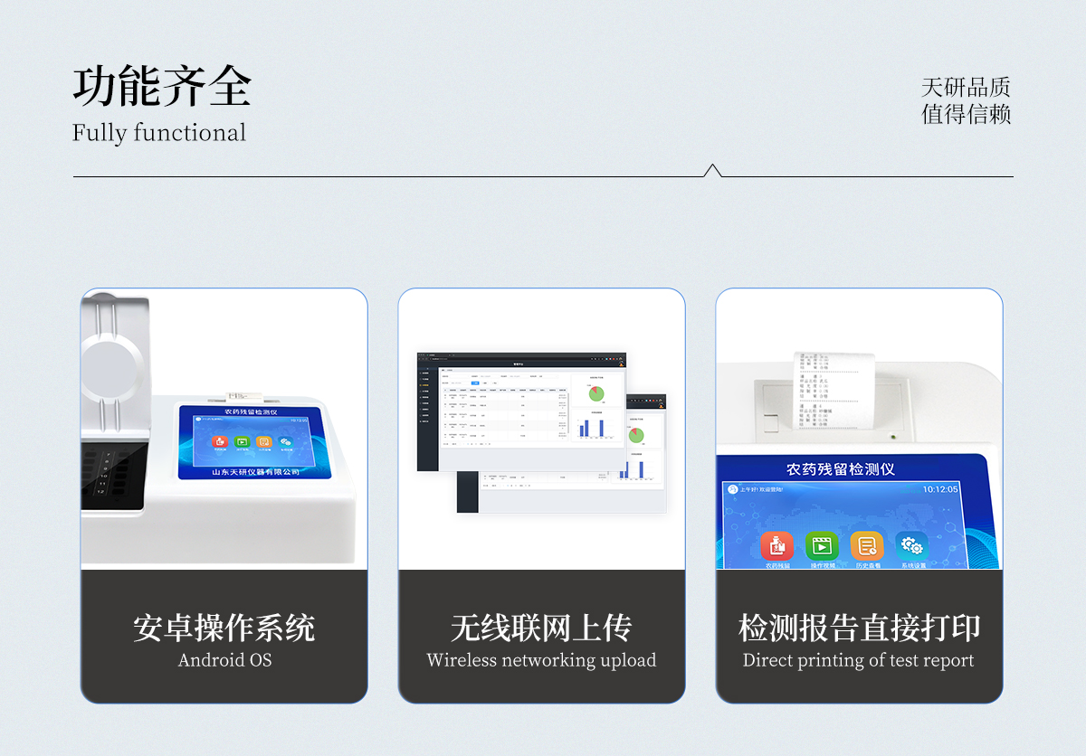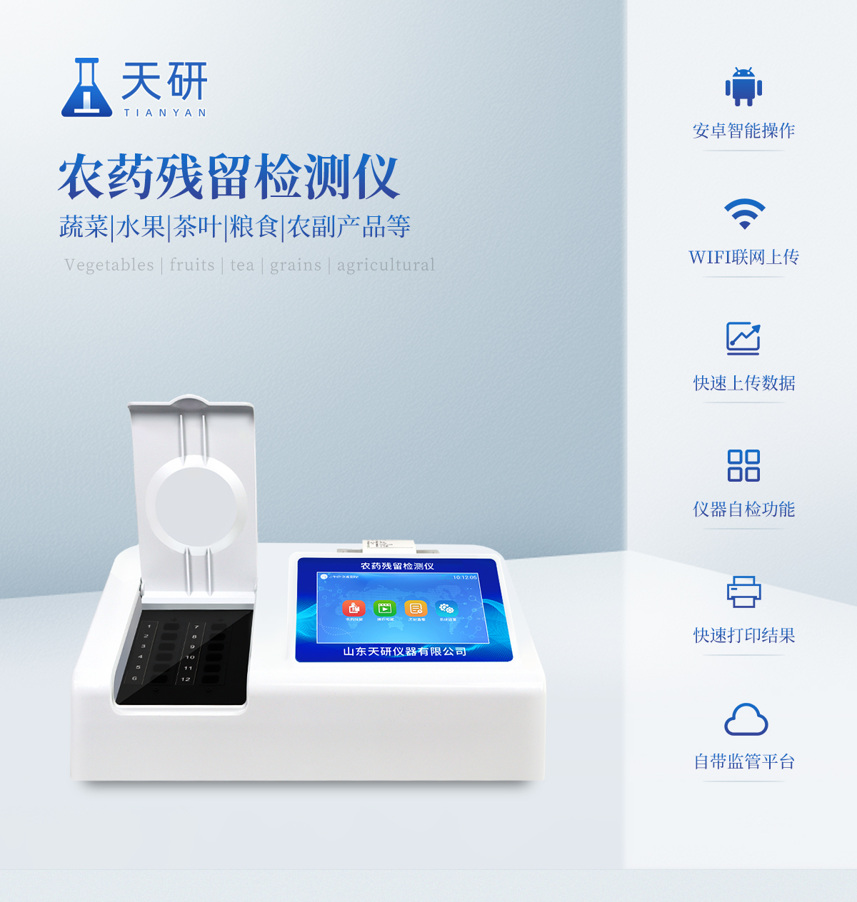 乙酰膽堿酯酶和丁酰膽堿酯酶試劑均可以使用,符合國家標準和農(nóng)業(yè)部標準的要求。 自動判斷樣品是否合格,檢測結(jié)果更加直觀。儀器具有100多種蔬菜名稱菜單庫,分類管理,并可按需添加或刪除蔬菜名,編輯蔬菜名稱,可直接打印出蔬菜名稱。 檢測通道:12個檢測通道,可以同時測試多個樣品,循環(huán)檢測,即放即檢,每個樣品由程序控制分別獨立工作,不會互相干擾。智能操作系統(tǒng),采用更加人性化操作,主控采用多核處理器,主頻1.88Ghz,運轉(zhuǎn)速度更快速,穩(wěn)定性更強。 顯示方式:7英寸高靈敏真彩觸摸屏顯示,人性化中文操作界面,讀數(shù)直觀、簡單。打印機采用串口5v打印,可選擇手動打印或者自動打印,三分鐘出打印結(jié)果,打印格式為檢測人姓名、吸光度差值、檢測時間、檢測機構(gòu)、樣品名稱及結(jié)果判定。 光源采用進口超高亮發(fā)光二極管,具有低功耗、高精度、穩(wěn)定性強、光源可控可以關掉不使用的光源,響應速度快等優(yōu)點。智能恒流穩(wěn)壓,光強自動校準,長時間連續(xù)工作光源無溫漂現(xiàn)象。 儀器具有GPRS遠傳功能,可插手機卡實現(xiàn)數(shù)據(jù)遠傳平臺,wifi聯(lián)網(wǎng)功能,可將數(shù)據(jù)快速上傳電腦,進行數(shù)據(jù)管理與統(tǒng)計。采用USB2.0接口設計,方便數(shù)據(jù)的存貯和移動,并可隨時與計算機直接相連,并且可用計算機控制儀器。實現(xiàn)數(shù)據(jù)查詢、瀏覽、分析、統(tǒng)計、打印等。 智能化程度高,儀器具有自檢功能:具有開機自檢和調(diào)零功能,具有自動檢測重復性功能儀器具有自身保護功能,可設置用戶名及密碼,防止非工作人員操作等。 采用DC12v直流供電,安全系統(tǒng)更高,并且配備6A鋰電池充電器。儀器具有重新校準、鎖定、恢復出廠設置功能。