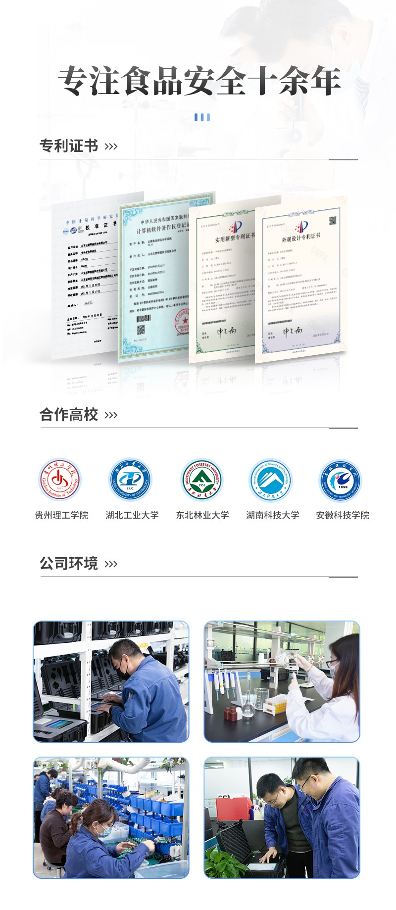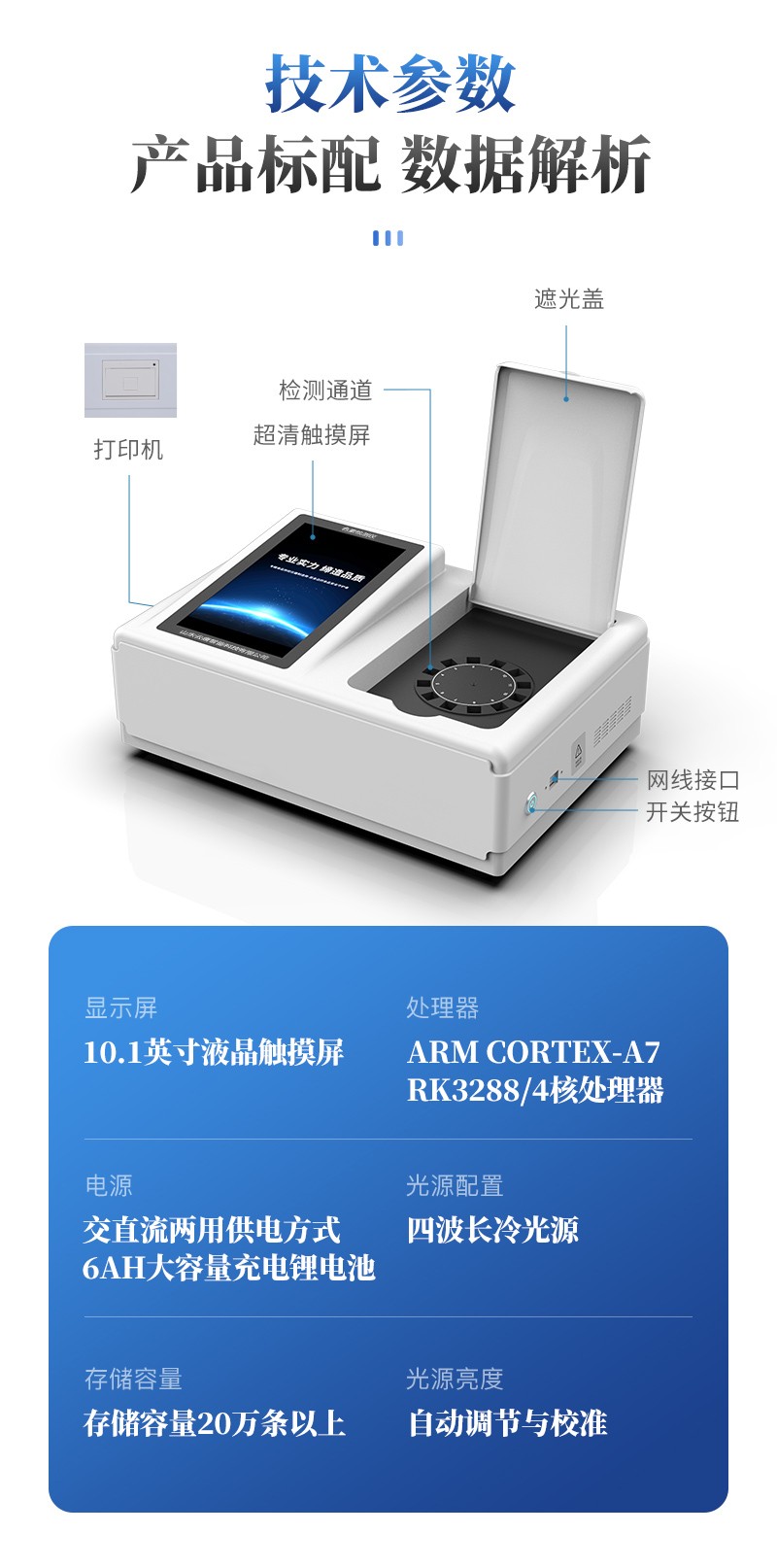 | 儀器采用臺(tái)式一體化系統(tǒng)檢測(cè)技術(shù),將分光光度模塊、新型農(nóng)殘檢測(cè)模塊、數(shù)字化管理模塊、無(wú)線通訊模塊高度集成于一體,支持檢測(cè)200種食品安全檢測(cè)項(xiàng)目,同時(shí)預(yù)留升級(jí)檢測(cè)方法。 | 儀器檢測(cè)模塊標(biāo)準(zhǔn)化、智能化,可隨意自由組合。檢測(cè)箱體內(nèi)置多個(gè)標(biāo)準(zhǔn)檢測(cè)單元,檢測(cè)模塊可以調(diào)整配置。 | 儀器采用全新安卓智能系統(tǒng),主控芯片采用 ARM Cortex-A7,RK3288/4核處理器,10.1寸高清液晶觸摸豎屏,更加**的UI交互界面,運(yùn)轉(zhuǎn)快捷;儀器配備無(wú)線通信模塊: 4G(APN)通訊模塊、Wifi模塊,藍(lán)牙傳輸,同時(shí)具有雙USB接口以及RJ45接口能以多種方式實(shí)現(xiàn)數(shù)據(jù)保存和數(shù)據(jù)傳輸功能。 | 創(chuàng)新檢測(cè)模式: | ★檢測(cè)通道:≥12通道;采用精密旋轉(zhuǎn)比色池設(shè)計(jì),使用同芯片同光源校準(zhǔn)精度,解決不同光源之間的誤差值。1-12通道間誤差0.1%。(**號(hào):ZL202022821055.2) | ★儀器具有自動(dòng)識(shí)別比色皿檢測(cè)功能,即:將樣品比色皿放入儀器后,點(diǎn)擊樣品檢測(cè),儀器自動(dòng)識(shí)別比色皿進(jìn)行通道檢測(cè)。 | 進(jìn)口高精光源: | 高精度進(jìn)口四波長(zhǎng)冷光源,通道配置 410、520、590、630nm 波長(zhǎng)光源,一個(gè)光源芯片驅(qū)動(dòng)一個(gè)光源,誤差極小,每臺(tái)設(shè)備單獨(dú)**校準(zhǔn)光源,**比對(duì),同時(shí)參照四種不同波段光源全方位覆蓋市面上99%的農(nóng)殘食品項(xiàng)目檢測(cè)。 | 智能化操作系統(tǒng): | 便捷操作系統(tǒng):設(shè)備檢測(cè)時(shí)可在同一檢測(cè)界面自動(dòng)對(duì)應(yīng)相關(guān)檢測(cè)通道一次性選擇1-12個(gè)樣品名稱,無(wú)須退出界面,節(jié)省操作時(shí)間。 | 數(shù)據(jù)集成系統(tǒng):設(shè)備首頁(yè)自動(dòng)統(tǒng)計(jì)檢測(cè)數(shù)據(jù)包含:周檢測(cè)數(shù)據(jù)、月檢測(cè)數(shù)據(jù),全部檢測(cè)總數(shù)量,均包含檢測(cè)總數(shù),合格數(shù),不合格數(shù),以及相關(guān)柱形分析圖,對(duì)各項(xiàng)檢測(cè)數(shù)據(jù)清晰掌握,無(wú)需電腦查詢,更加快捷直觀。 | 項(xiàng)目預(yù)設(shè)系統(tǒng):支持添加單個(gè)及多個(gè)相同或不相同的任務(wù)預(yù)設(shè),一鍵快速調(diào)取,每一個(gè)任務(wù)分別可以設(shè)置不同的樣品、批次、編號(hào)、來(lái)源、備注、抽樣信息、檢測(cè)信息、受檢信息、復(fù)核信息等更多信息。無(wú)縫鏈接平臺(tái)和APP實(shí)時(shí)查看下發(fā)任務(wù)。 | 數(shù)據(jù)監(jiān)管系統(tǒng):同步對(duì)接監(jiān)管平臺(tái),數(shù)據(jù)可局域網(wǎng)和互聯(lián)網(wǎng)數(shù)據(jù)上傳,檢測(cè)結(jié)果可選擇直接傳至食品安全監(jiān)管平臺(tái)。集成OSS輸出存儲(chǔ)服務(wù)、區(qū)分設(shè)備定向管理應(yīng)用,進(jìn)行區(qū)域食品安全監(jiān)管及大數(shù)據(jù)分析處理與數(shù)據(jù)統(tǒng)計(jì),檢測(cè)區(qū)域食品安全長(zhǎng)短期動(dòng)態(tài),達(dá)到食品安全問題預(yù)估、預(yù)警。 | 自定義打印系統(tǒng):內(nèi)置全新打印系統(tǒng),新創(chuàng)自定義打印方式,可按需靈活設(shè)置開啟或關(guān)閉:產(chǎn)品合格證(國(guó)家農(nóng)業(yè)部標(biāo)準(zhǔn)要求),二維碼,抽樣信息、檢測(cè)信息,受檢信息、復(fù)核信息、抽樣日期、檢測(cè)日期等信息的打印。 | 系統(tǒng)遠(yuǎn)程更新功能:可定向分客戶分儀器更新系統(tǒng),按照不同客戶后期實(shí)際需求添加項(xiàng)目,無(wú)需機(jī)器返廠,即可遠(yuǎn)程實(shí)時(shí)升級(jí)全新系統(tǒng),節(jié)省時(shí)間成本及避免運(yùn)輸造成設(shè)備損壞。 | 儀器主機(jī)采用一體化防水、抗壓、防撞擊、防腐蝕箱體設(shè)計(jì),同時(shí)配備交直流供電,可連接車載電源,可選配大容量充電鋰電池,滿足現(xiàn)場(chǎng)野外檢測(cè)需求。 | 安全證書,放心保障:儀器具有中國(guó)計(jì)量科學(xué)研究院校準(zhǔn)證書,**認(rèn)證。 |