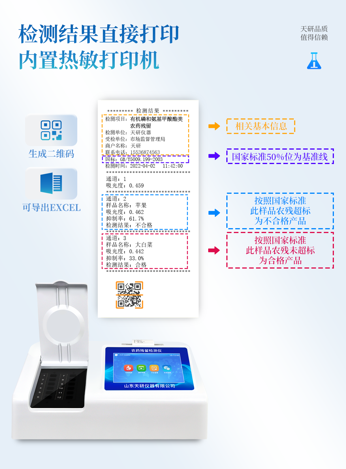 乙酰膽堿酯酶和丁酰膽堿酯酶試劑均可以使用,符合國(guó)家標(biāo)準(zhǔn)和農(nóng)業(yè)部標(biāo)準(zhǔn)的要求。 自動(dòng)判斷樣品是否合格,檢測(cè)結(jié)果更加直觀。儀器具有100多種蔬菜名稱菜單庫(kù),分類管理,并可按需添加或刪除蔬菜名,編輯蔬菜名稱,可直接打印出蔬菜名稱。 檢測(cè)通道:12個(gè)檢測(cè)通道,可以同時(shí)測(cè)試多個(gè)樣品,循環(huán)檢測(cè),即放即檢,每個(gè)樣品由程序控制分別獨(dú)立工作,不會(huì)互相干擾。智能操作系統(tǒng),采用更加人性化操作,主控采用多核處理器,主頻1.88Ghz,運(yùn)轉(zhuǎn)速度更快速,穩(wěn)定性更強(qiáng)。 顯示方式:7英寸高靈敏真彩觸摸屏顯示,人性化中文操作界面,讀數(shù)直觀、簡(jiǎn)單。打印機(jī)采用串口5v打印,可選擇手動(dòng)打印或者自動(dòng)打印,三分鐘出打印結(jié)果,打印格式為檢測(cè)人姓名、吸光度差值、檢測(cè)時(shí)間、檢測(cè)機(jī)構(gòu)、樣品名稱及結(jié)果判定。 光源采用進(jìn)口超高亮發(fā)光二極管,具有低功耗、高精度、穩(wěn)定性強(qiáng)、光源可控可以關(guān)掉不使用的光源,響應(yīng)速度快等優(yōu)點(diǎn)。智能恒流穩(wěn)壓,光強(qiáng)自動(dòng)校準(zhǔn),長(zhǎng)時(shí)間連續(xù)工作光源無(wú)溫漂現(xiàn)象。 儀器具有GPRS遠(yuǎn)傳功能,可插手機(jī)卡實(shí)現(xiàn)數(shù)據(jù)遠(yuǎn)傳平臺(tái),wifi聯(lián)網(wǎng)功能,可將數(shù)據(jù)快速上傳電腦,進(jìn)行數(shù)據(jù)管理與統(tǒng)計(jì)。采用USB2.0接口設(shè)計(jì),方便數(shù)據(jù)的存貯和移動(dòng),并可隨時(shí)與計(jì)算機(jī)直接相連,并且可用計(jì)算機(jī)控制儀器。實(shí)現(xiàn)數(shù)據(jù)查詢、瀏覽、分析、統(tǒng)計(jì)、打印等。 智能化程度高,儀器具有自檢功能:具有開(kāi)機(jī)自檢和調(diào)零功能,具有自動(dòng)檢測(cè)重復(fù)性功能儀器具有自身保護(hù)功能,可設(shè)置用戶名及密碼,防止非工作人員操作等。 采用DC12v直流供電,安全系統(tǒng)更高,并且配備6A鋰電池充電器。儀器具有重新校準(zhǔn)、鎖定、恢復(fù)出廠設(shè)置功能。