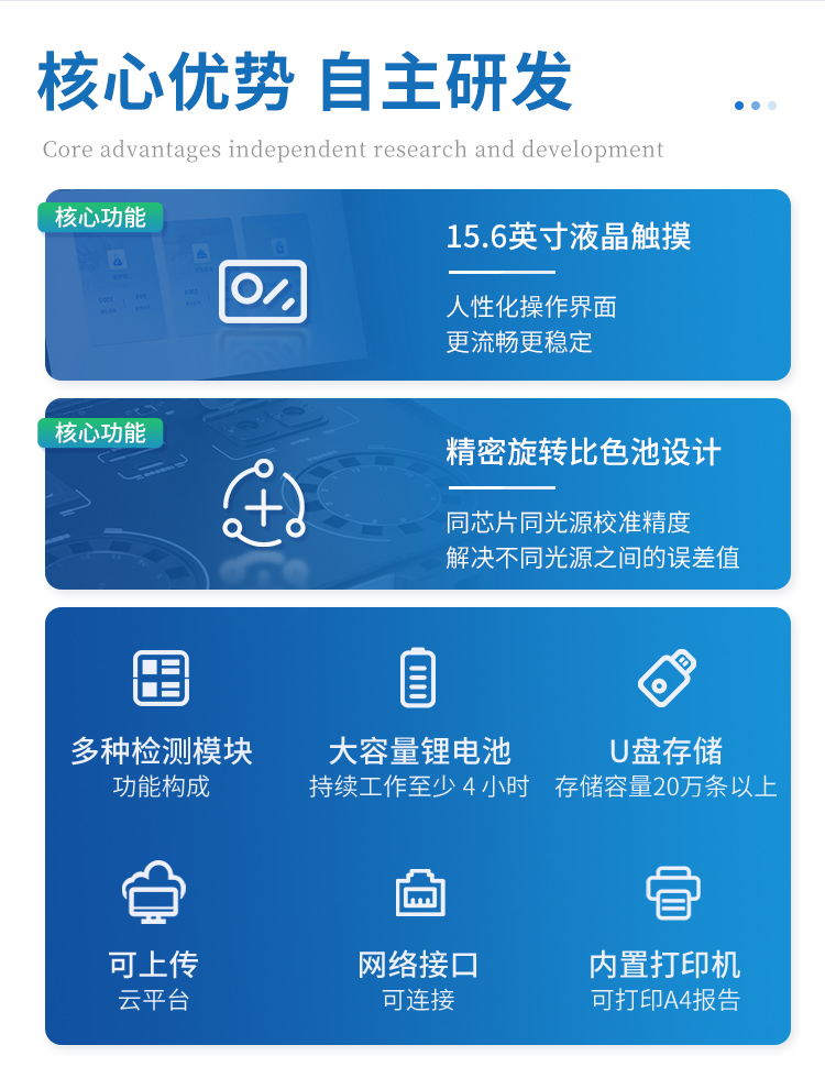 儀器采用手提式一體化系統(tǒng)檢測技術,將分光光度模塊、膠體金檢測模塊、新型農(nóng)殘檢測模塊、數(shù)字化管理模塊、無線通訊模塊高度集成于一體,支持檢測200種食品安全檢測項目,同時預留升級檢測方法。儀器檢測模塊標準化、智能化,檢測項目可隨意自由組合。檢測箱體內(nèi)置多個標準檢測單元,檢測模塊可以調(diào)整配置。 顯示屏幕:儀器采用10.1英寸豎向液晶觸摸屏顯,搭配運行安卓智能操作系統(tǒng),主控芯片采用ARM Cortex-A7,RK3288/4核處理器,主頻1.88Ghz,操作方便,性能更強。檢測通道:≥12通道;采用精密旋轉比色池設計,使用同芯片同光源校準精度,解決不同光源之間的誤差值,更加準確**。(1-12通道間誤差0.1%,**號:ZL202022821055.2)儀器光源:高精度進口四波長冷光源,每個通道均配置 410、520、590、630nm 波長光源,標配**的光路切換裝置,**光路切換功能可實現(xiàn)64波長,并且所有檢測項目可實現(xiàn)所有通道同時檢測。設備可一鍵校準,自動保存校準數(shù)據(jù),自動對比校驗,得到精準光源,采用Android SP存儲數(shù)據(jù),光源數(shù)據(jù)永不丟失,方便每一次使用。通訊接口:配備無線通信模塊、4G(APN)通訊模塊、藍牙傳輸,同時具有雙USB接口以及RJ45網(wǎng)線接口,可以多方式實現(xiàn)數(shù)據(jù)保存及數(shù)據(jù)傳輸。 存儲方式:支持U盤存儲,標準USB接口,免驅動安裝。檢測結果存儲容量20萬條以上,可生成Excel表格進行拷貝,并具有登錄保護功能。智能化操作系統(tǒng):: ★操作系統(tǒng):儀器可在同一檢測界面自動對應相關檢測通道,一次性選擇1-12個樣品名稱,無需退出界面,節(jié)省操作時間。并可以對每個通道屬性和樣品信息單獨進行編輯,例如送檢單位、人員,檢測人員等,打印時勾選打印顯示。★數(shù)據(jù)集成系統(tǒng):設備首頁自動匯總分析檢測數(shù)據(jù),包含:周檢測數(shù)據(jù)、月檢測數(shù)據(jù),全部檢測總數(shù)量,均包含檢測總數(shù),合格數(shù),不合格數(shù),以及相關柱形分析圖,各項檢測數(shù)據(jù)一目了然,無需電腦查詢,更加快捷直觀。★數(shù)據(jù)庫系統(tǒng):十幾項數(shù)據(jù)庫分類管理儀器:包含項目類型、項目數(shù)據(jù)、檢測數(shù)據(jù)、歷史記錄、國標信息、曲線信息、采樣信息、檢測信息、受檢信息、復核信息、圖表信息、光源校準信息、打印樣式信息、樣品庫信息等等,數(shù)據(jù)庫之間互相協(xié)調(diào)聯(lián)動保證數(shù)據(jù)的真實完整性。同時產(chǎn)品數(shù)據(jù)庫以及歷史檢測記錄支持一鍵檢索功能。★限量規(guī)判系統(tǒng):具有限量查詢、添加物質合規(guī)判定系統(tǒng)。檢測出結果后,系統(tǒng)自動調(diào)用系統(tǒng)數(shù)據(jù)庫中相關國標進行比對判定,客觀顯示判定結果是否合格★項目預設系統(tǒng):儀器具有任務預設模塊,一鍵提前預設,給出方便快捷的新檢測方案,每一個任務分別可以設置不同的樣品、批次、編號、來源、備注、抽樣信息、檢測信息、受檢信息、復核信息等更多信息。樣品送檢時一鍵調(diào)取保存信息,并可多次調(diào)取,大大提高檢測效率。★數(shù)據(jù)監(jiān)管系統(tǒng):同步對接監(jiān)管平臺,數(shù)據(jù)可局域網(wǎng)和互聯(lián)網(wǎng)數(shù)據(jù)上傳,檢測結果可選擇直接傳至食品安全監(jiān)管平臺。進行區(qū)域食品安全監(jiān)管及大數(shù)據(jù)分析處理與數(shù)據(jù)統(tǒng)計,檢測區(qū)域食品安全長短期動態(tài),達到食品安全問題預估、預警。★打印系統(tǒng):內(nèi)置全新打印機,新創(chuàng)自定義打印方式,可按需靈活勾選控制:產(chǎn)品合格證(國家農(nóng)業(yè)部標準要求),二維碼,抽樣信息、檢測信息,受檢信息、復核信息、抽樣日期、檢測日期等信息的打印。供電模式:儀器交直流兩用,直流12V供電,可連接車載電源,可配6ah大容量充電鋰電池,電量可實時顯示,方便戶外流動測試。膠體金檢測模塊:采用雙通道CMOS成像處理技術及膠體金免疫層析技術,可同時讀取雙膠體金卡數(shù)據(jù),自動采集、處理分析,將檢測結果顯示,并可根據(jù)參考限值自動判斷檢測結果,可檢測常見的獸藥殘留、生物毒素、抗生素、違禁添加物等。★探測技術:CMOS成像探測;★檢測通道:1個通道;★檢測方式:消線法和比色法;★顯示模式:陰性或陽性;★曲線形式:軌道式掃描方式,顯示金標卡圖像,實時生成、識別CT曲線圖,無需手動調(diào)整,完成檢測后自動退出檢測卡。兼容市場上其他金標卡,使用耗材不受限制。儀器加入遠程升級功能,可定向分客戶分儀器更新,開機后自動更新,客戶無需任何操作,即可升級全新項目。做到了無需退換機器即可實現(xiàn)實時遠程升級檢測儀器。