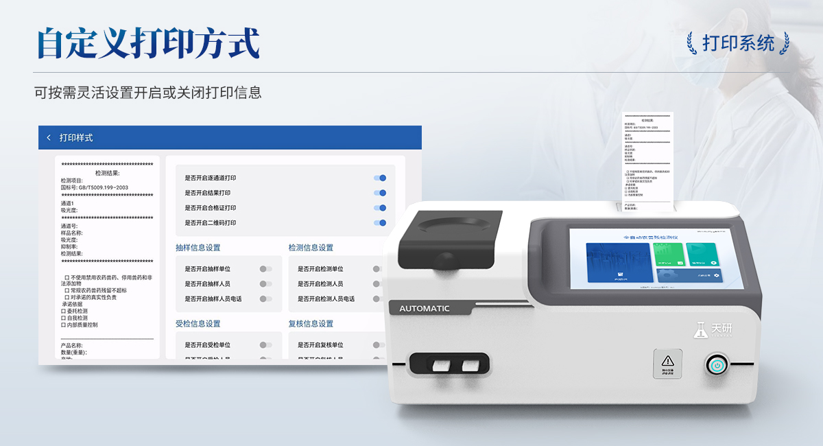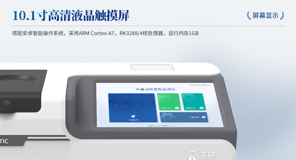 1. 試劑位置:3個(gè)2. 農(nóng)殘檢測(cè)盤(pán):旋轉(zhuǎn)24通道比色盤(pán),可任意選擇檢測(cè)通道,自動(dòng)對(duì)應(yīng)選擇通道。3. 膠體金通道:2個(gè),可讀取檢測(cè)卡結(jié)果,自動(dòng)采集、處理分析,自動(dòng)判斷檢測(cè)結(jié)果,并具備自動(dòng)判空功能。4.系統(tǒng)配置:10.1寸高清液晶觸摸屏,采用ARM Cortex?-A7,RK3288/4核處理器,運(yùn)行內(nèi)存1GB。Android7.1.1 系統(tǒng)分辨率1280×800。5.恒溫系統(tǒng):具有自動(dòng)加溫溫控系統(tǒng),精準(zhǔn)恒溫37℃,精度±0.1℃。 6.添加系統(tǒng):儀器按照試劑要求自動(dòng)、按時(shí)、按量加入試劑,并且自動(dòng)對(duì)未正常放置的樣本或異常的樣本進(jìn)行檢查并提示。7.清洗功能:儀器具備回流及自動(dòng)清洗管路功能,避免試劑污染。8.混勻功能:設(shè)備具備自動(dòng)混勻功能。9.光源校準(zhǔn):設(shè)備可自動(dòng)校準(zhǔn),確保檢測(cè)準(zhǔn)確度。10.實(shí)時(shí)監(jiān)控:儀器測(cè)試過(guò)程中屏幕顯示運(yùn)行狀態(tài),可實(shí)時(shí)查看。11.數(shù)據(jù)存儲(chǔ):內(nèi)部存儲(chǔ)16GB,可存儲(chǔ)500萬(wàn)條數(shù)據(jù)。12.樣品多選功能:設(shè)備具備樣品一鍵多選功能,選擇樣品自動(dòng)匹配檢測(cè)通道。13.項(xiàng)目預(yù)設(shè):可提前設(shè)置單個(gè)及多個(gè)相同或不相同的檢測(cè)任務(wù),可單次或者多次調(diào)取,減少檢測(cè)時(shí)間。14.自定義打印系統(tǒng):內(nèi)置自定義打印系統(tǒng),可按需靈活設(shè)置開(kāi)啟或關(guān)閉:產(chǎn)品合格證(國(guó)家農(nóng)業(yè)部標(biāo)準(zhǔn)),二維碼,抽樣信息、檢測(cè)信息,受檢信息等信息的打印。15.A4版本報(bào)告打印功能:設(shè)備可自動(dòng)生成A4版報(bào)告,A4報(bào)告帶二維碼,可掃描二維碼生成電子版,并可識(shí)別真?zhèn)巍?/td>16.傳輸方式:儀器配備無(wú)線通信模塊: 4G(APN)通訊模塊、Wifi模塊,藍(lán)牙傳輸模塊,同時(shí)具有USB接口以及RJ45接口能以多種方式實(shí)現(xiàn)數(shù)據(jù)保存和數(shù)據(jù)傳輸功能,設(shè)備數(shù)據(jù)可以同步上傳至平臺(tái)。17.系統(tǒng)17.數(shù)據(jù)監(jiān)管系統(tǒng):設(shè)備自帶監(jiān)管平臺(tái),并可同步對(duì)接監(jiān)管平臺(tái),數(shù)據(jù)可局域網(wǎng)和互聯(lián)網(wǎng)數(shù)據(jù)上傳,檢測(cè)結(jié)果可直接傳至食品安全監(jiān)管平臺(tái)。達(dá)到食品安全問(wèn)題預(yù)估、預(yù)警。18.系統(tǒng)遠(yuǎn)程更新功能:無(wú)需設(shè)備返廠,即可遠(yuǎn)程實(shí)時(shí)升級(jí)全新系統(tǒng),節(jié)省時(shí)間成本及避免運(yùn)輸造成設(shè)備損。