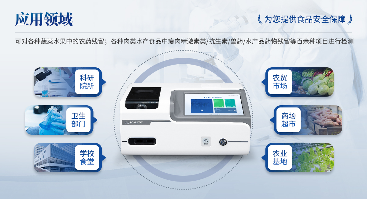全自動(dòng)農(nóng)獸藥殘留檢測(cè)儀可對(duì)各種蔬菜水果中有機(jī)磷和氨基甲酸酯類農(nóng)藥殘留;各種肉類水產(chǎn)食品中瘦肉精激素類殘留,抗生素殘留,獸藥殘留,水產(chǎn)品藥物殘留等百余種項(xiàng)目進(jìn)行快速檢測(cè)。該設(shè)備廣泛應(yīng)用于蔬菜批發(fā)市場(chǎng)、超市、商場(chǎng)、食藥監(jiān)等部門(mén)的蔬菜和水果中的農(nóng)藥殘留檢測(cè)。