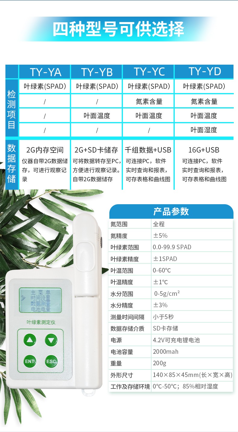 測(cè)定指標(biāo):氮素、葉綠素、葉溫測(cè)量范圍:葉綠素:0.0-99.9SPAD     氮含量:0.0-99.9mg/g        葉面溫度:-10-99.9℃測(cè)量精度:葉綠素:±1.0 SPAD單位以內(nèi) (室溫下,SPAD值介于0-50)       氮含量:  ±5%    葉面溫度:±0.5℃重復(fù)性:葉綠素:±0.3 SPAD單位以內(nèi) (SPAD值介于0-50)  氮含量:±0.5單位   葉面溫度:±0.2℃測(cè)量面積:2mm*2mm測(cè)量時(shí)間間隔:小于3秒數(shù)據(jù)存儲(chǔ)容量:1000組數(shù)據(jù)電源:4.2V可充電鋰電池電池容量:2000mah重量:200g