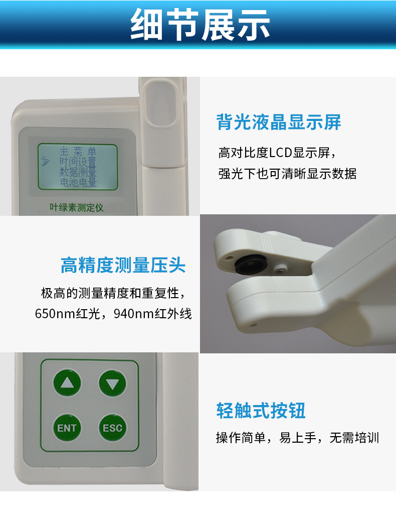 快速無(wú)損植物活體檢測(cè),不影響植物成長(zhǎng)。一次操作可同時(shí)測(cè)定所有參數(shù),實(shí)時(shí)顯示。氮,葉綠素,葉溫三種參數(shù)同一屏幕同時(shí)顯示,且可同時(shí)儲(chǔ)存歷史數(shù)據(jù)查看,即可順序查看。測(cè)量數(shù)據(jù)可連接計(jì)算機(jī)將測(cè)量數(shù)據(jù)導(dǎo)出,便于植物養(yǎng)分的管理和分析。歷史數(shù)據(jù)查看,即可順序查看,也可跳轉(zhuǎn)查看。意外斷電后已保存在主機(jī)里的數(shù)據(jù)不丟失。對(duì)于歷史數(shù)據(jù)可以一鍵式全部刪除。可連接計(jì)算機(jī)將測(cè)量數(shù)據(jù)導(dǎo)出,便于植物養(yǎng)分的管理和分析。使用鋰電池供電,帶背光功能。每種參數(shù)的報(bào)表、曲線圖均可選擇時(shí)段查詢查看。可將存儲(chǔ)記錄的數(shù)據(jù)以EXCEL格式備份保存,方便以后調(diào)用。可將存儲(chǔ)記錄的數(shù)據(jù)曲線圖以BMP圖片格式備份保存,方便以后調(diào)用。