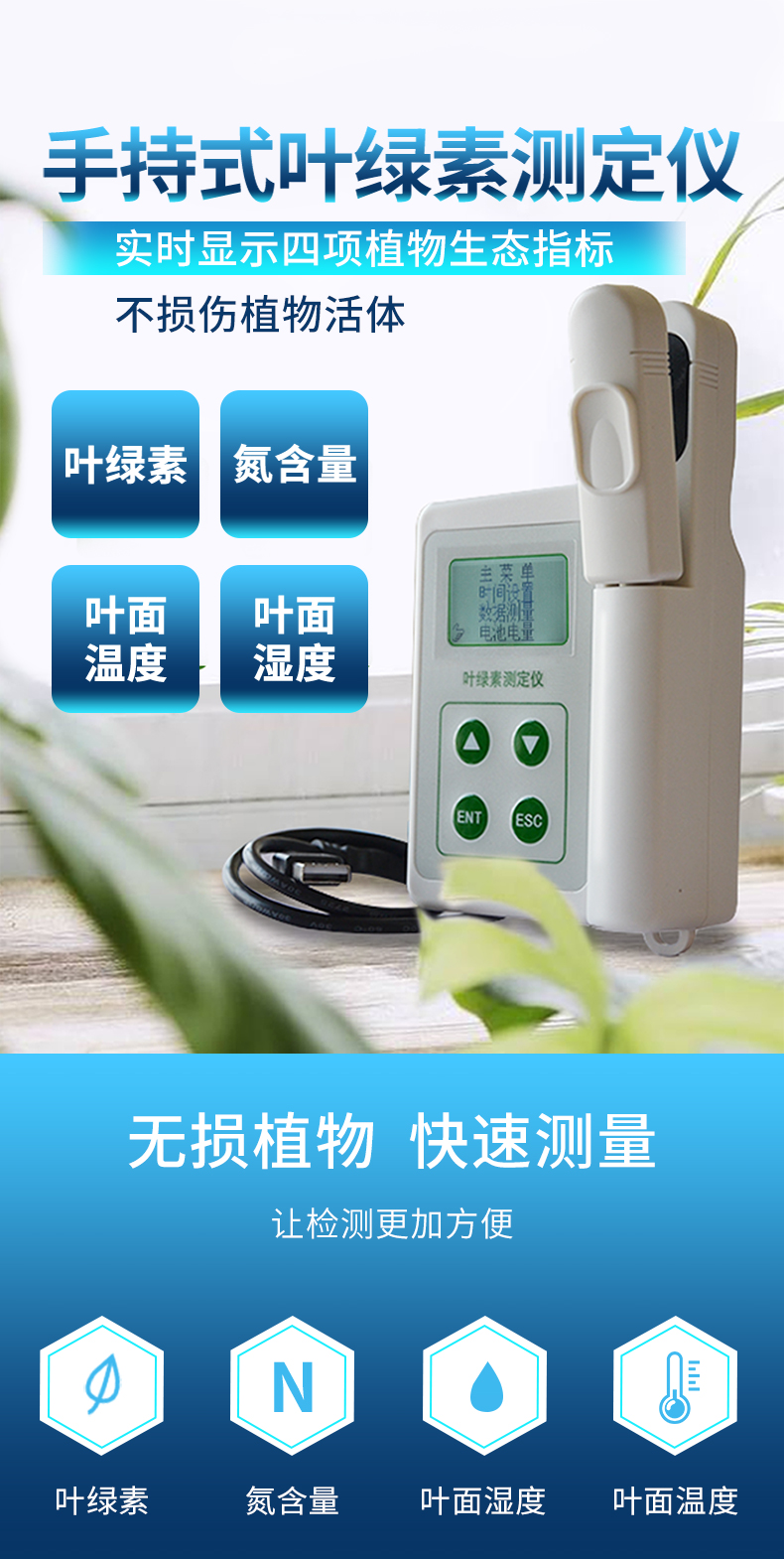 氮素含量一般情況下直接反應(yīng)作物的健康情況,生長(zhǎng)狀態(tài)、了解植物真實(shí)的硝基需求量和土壤硝基的缺乏程度或是否過(guò)多地施加了氮肥,廣泛應(yīng)用于氮肥管理,除草劑應(yīng)用,葉片衰老,環(huán)境脅迫等研究,葉綠素測(cè)量?jī)x在農(nóng)業(yè)種植過(guò)程中有很大的意義。 葉 綠素含量的測(cè)定結(jié)果是SPAD值,是葉片在兩種波長(zhǎng)650nm 和940nm,葉片傳輸光的數(shù)量進(jìn)行比值計(jì)算,來(lái)確定葉片當(dāng)前葉綠素的相對(duì)數(shù)量(兩種波長(zhǎng)范圍內(nèi)的透光系數(shù)來(lái)確定葉片當(dāng)前葉綠素的相對(duì)數(shù)量 ),SPAD值與葉綠素之間成正比關(guān)系,因此SPAD值往往間接地可代表葉綠素值,從而可以評(píng)估植物健康狀況、生長(zhǎng)狀態(tài),因而在農(nóng)業(yè)中,時(shí)常使用葉綠素計(jì) 來(lái)進(jìn)行對(duì)植物葉綠素含量進(jìn)行檢測(cè),以此來(lái)進(jìn)行指導(dǎo)氮肥的施用量,因而在農(nóng)業(yè)種植過(guò)程中使用葉綠素計(jì)來(lái)進(jìn)行指導(dǎo)氮元素含量的施肥,同時(shí)在很多植物中,以此來(lái) 進(jìn)行判斷植物的抗逆性。 葉溫常用來(lái)表示植物的體溫狀況,植物葉片中所有的化學(xué)反應(yīng),都受葉片溫度的影響,在植物生理活動(dòng)的分析中經(jīng)常用到。葉溫與 氣溫的差值,可以表明植物的缺水情況或受旱程度。因?yàn)楫?dāng)水分供應(yīng)充足時(shí),植物蒸騰正常,蒸騰耗熱可以降低植物體溫,這時(shí)葉溫比氣溫低;反之受旱時(shí),植物體 溫上升,可高于當(dāng)時(shí)的氣溫。