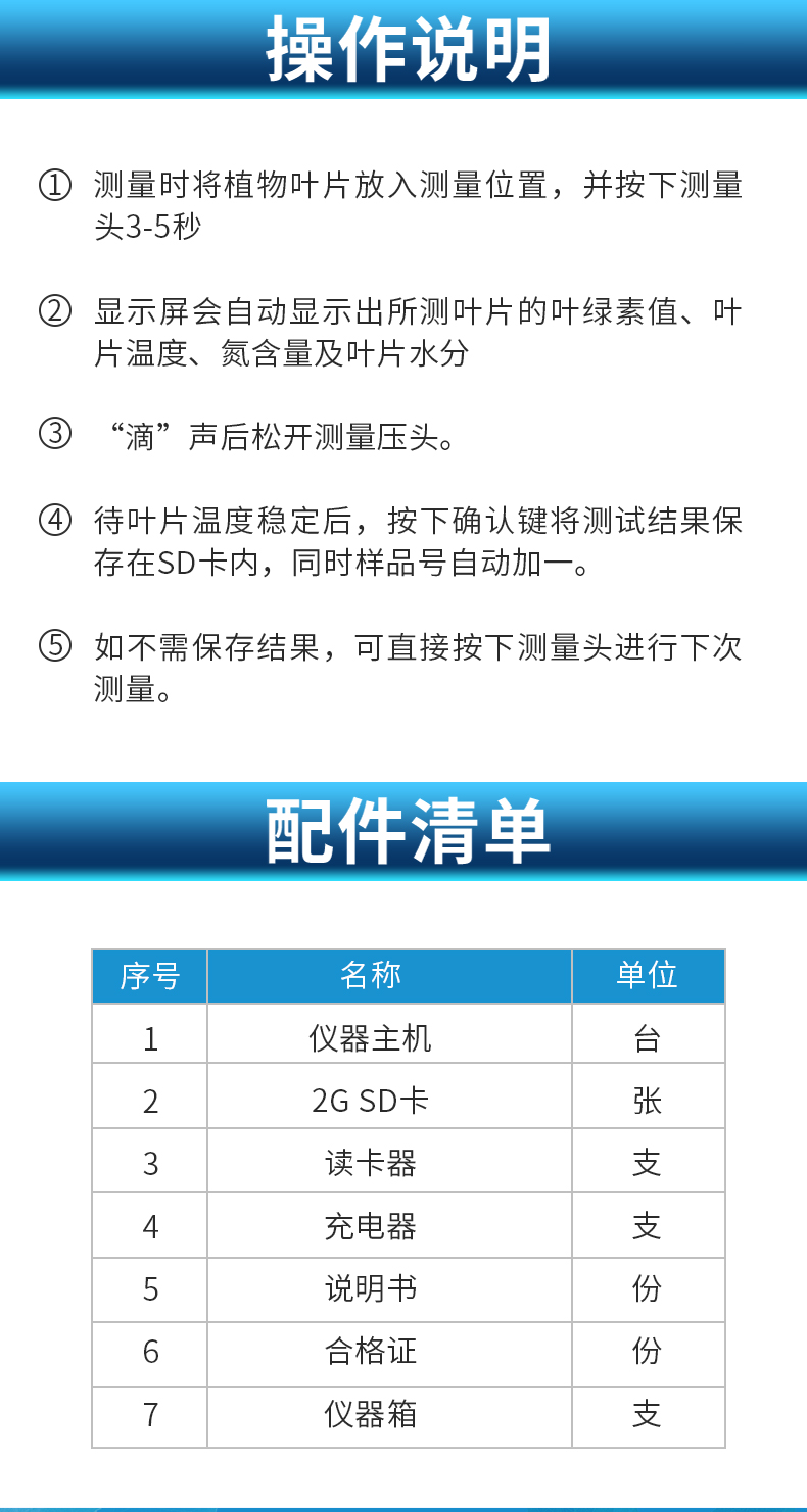 | 測量對象:陸地植物葉片 | 測量原理: 650nm和940nm兩種波長下光密度差 | 測量范圍 0.0-99.9 SPAD | 測量面積 2mm*3mm | 測量精度 ±1.0 SPAD單位以內(nèi) (室溫下,SPAD值介乎0-50) | 重復(fù)性 ±0.3 SPAD單位以內(nèi) (SPAD值介乎0-50,保持測量位置不變) | 測量時間間隔 小于2秒 | 測量面積:2mm*2mm | 測量時間間隔:小于3秒 | 內(nèi)存 內(nèi)存16GB,可計(jì)算/顯示平均值,以及刪除異常值 | 樣品厚度** 1 mm | 樣品插入深度 10 mm | 電源 4.2V可充電鋰電池 | 電池容量 2000mah | 重量 250g | 外形尺寸 140×85×45mm(長×寬×高) | 操作溫度/濕度范圍:0 - 50°C,相對濕度85% | 儲存溫度/濕度范圍:20 - 55°C,相對濕度85% | 標(biāo)準(zhǔn)配置:主機(jī), 充電器,USB數(shù)據(jù)線,便攜鋁箱,說明書等 |