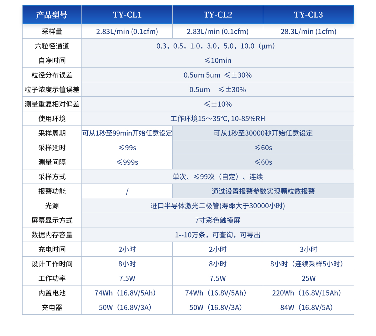 | 采樣量:2.83L/min (0.1cfm) | 六粒徑通道:0.3,0.5,1.0,3.0,5.0,10.0(μm) | 自凈時間:≤10min | 粒徑分布誤差:0.5um 5um ≤±30% | 粒子濃度示值誤差:0.5um ≤±30% | 測量重復相對偏差:≤±10% | 使用環(huán)境:工作環(huán)境15~35℃, 10-85%RH | 采樣周期:可從1秒至99min開始任意設定 | 采樣延時:≤99s | 測量間隔:≤999s | 采樣方式:單次、≤99次(自定)、連續(xù) | 光源:進口半導體激光二極管(壽命大于30000小時) | 屏幕顯示方式:7寸彩色觸摸屏 | 數(shù)據(jù)內(nèi)存容量:1--10萬條,可查詢,可導出。 | 充電時間:2小時 | 設計工作時間:8小時 | 平均功率:7.5W | 內(nèi)置電池:74Wh(16.8V/5Ah) | 充電器:50W(16.8V/3A) |