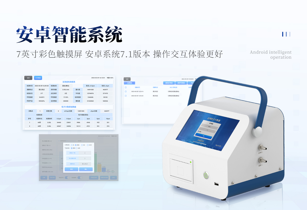 | 1、安卓系統(tǒng)7.1版本,操作交互體驗更好。 | 2、內(nèi)置溫濕度傳感器、環(huán)境氣壓傳感器 | 3、核心部件光散射傳感器明顯消除腔體的雜散光,信噪比大為提高。從而使測量更準確更可靠。 | 4、按95%置信度(UCL)計算,計數(shù)結(jié)果可換算成m3和ft3 | 5、依照凈化級別劃分和規(guī)定,自動判定凈化級別,使用便利。 | 6、支持wifi、藍牙傳輸,數(shù)據(jù)可無線上傳;同時支持U盤拷貝數(shù)據(jù),免驅(qū)動插拔。 | 7、配置監(jiān)管平臺,檢測結(jié)果可直接無線傳至平臺,進行潔凈度長短期分析,輔助管理。 | 8、內(nèi)置新一代高速熱敏打印機,可選擇所需要打印的粒徑通道,靈活打印結(jié)果。 | 9、交直流兩用,內(nèi)置充電鋰電池,環(huán)保耐用可支持連續(xù)采樣6小時以上。 | 10、便捷簡易伸縮式云臺支架,安裝采樣操作更加方便。 |