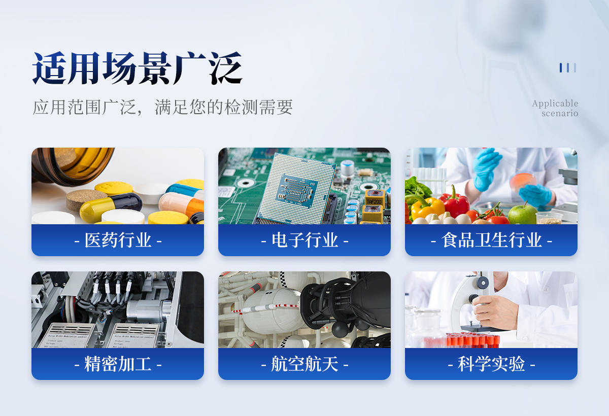 滿(mǎn)足醫(yī)藥行業(yè)(制藥廠、藥檢所、醫(yī)院手術(shù)室等);電子行業(yè)(半導(dǎo)體工廠、精密機(jī)械的生產(chǎn)加工等);食品衛(wèi)生行業(yè)(乳制品、塑封肉食品、調(diào)味食品、農(nóng)產(chǎn)品等的精加工);過(guò)濾器的生產(chǎn)廠家,檢驗(yàn)過(guò)濾器的質(zhì)量及效率等;光學(xué)、及航空航天等領(lǐng)域的精加工、精密試驗(yàn)所需的潔凈室(區(qū))的檢測(cè)需要。