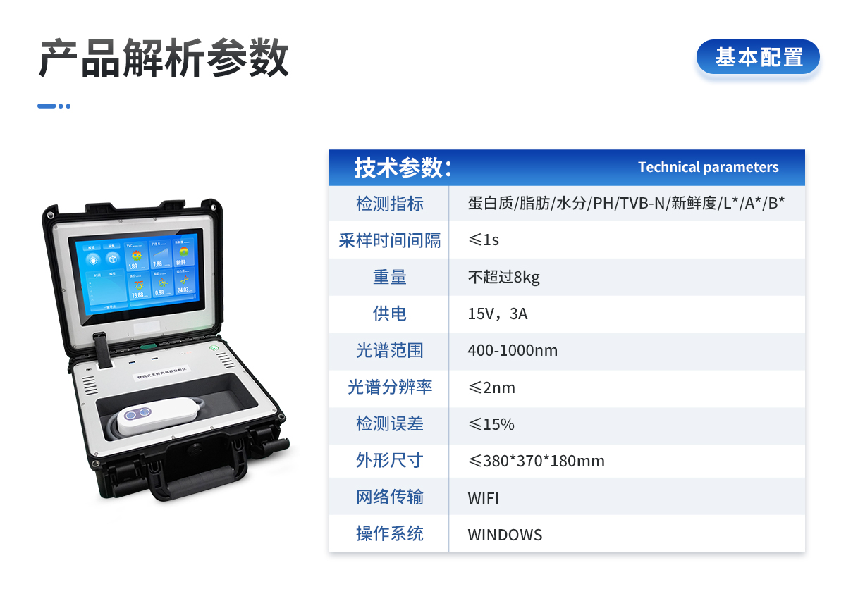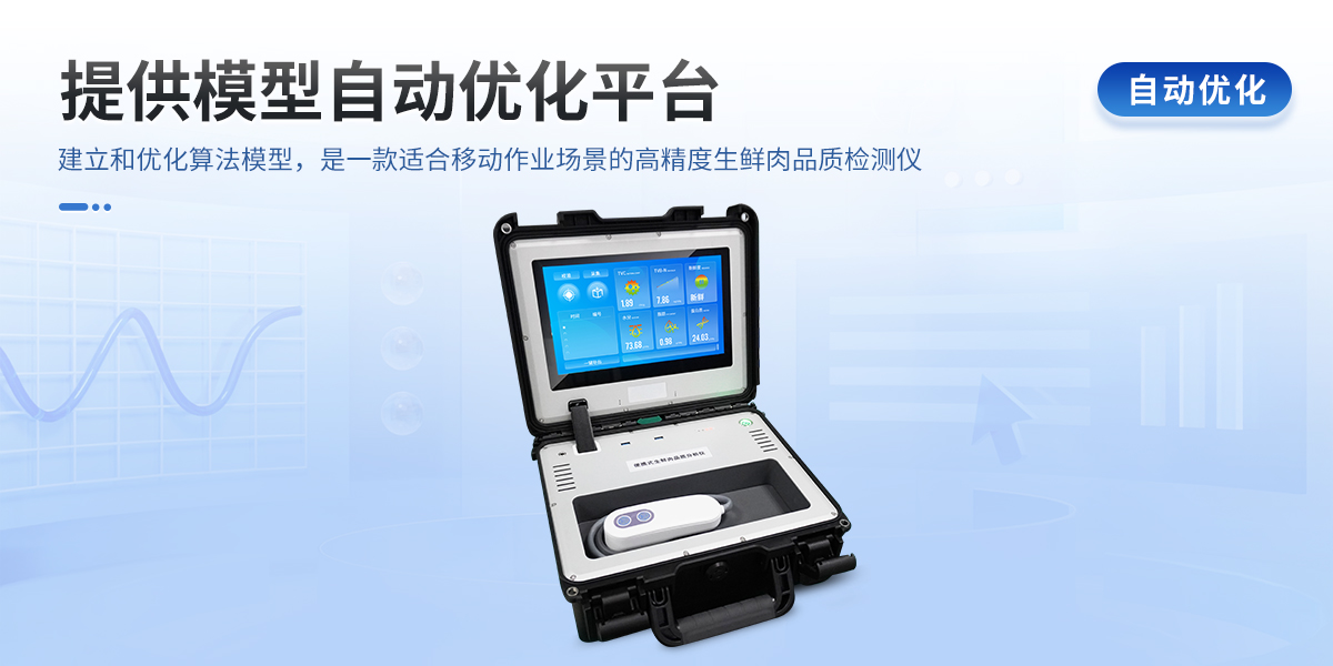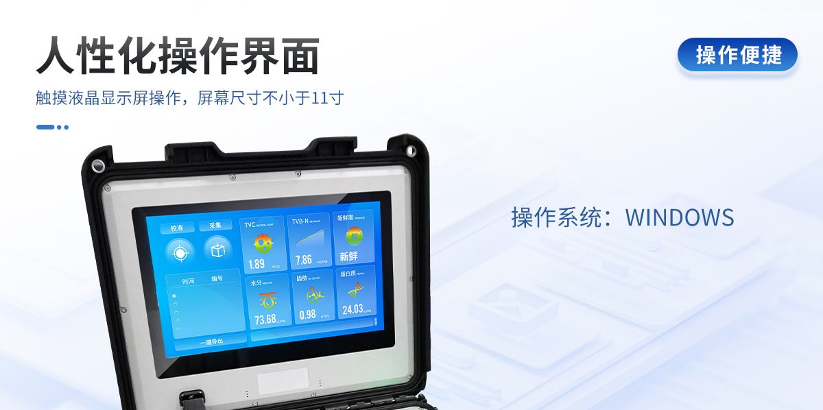 可用于檢測(cè)生鮮肉的蛋白質(zhì)、脂肪、水分、pH、TVC、TVB-N、新鮮度、L*、A*、B*等品質(zhì)參數(shù)。配備手提箱式防水減震外殼、大尺寸觸控屏幕并內(nèi)置大容量電池,可一鍵自動(dòng)校準(zhǔn),是一款適合移動(dòng)作業(yè)場(chǎng)景的高精度生鮮肉品質(zhì)檢測(cè)儀,其可用于生鮮肉及肉品生產(chǎn)、加工、儲(chǔ)運(yùn)企業(yè)、肉品品質(zhì)監(jiān)管部門等。