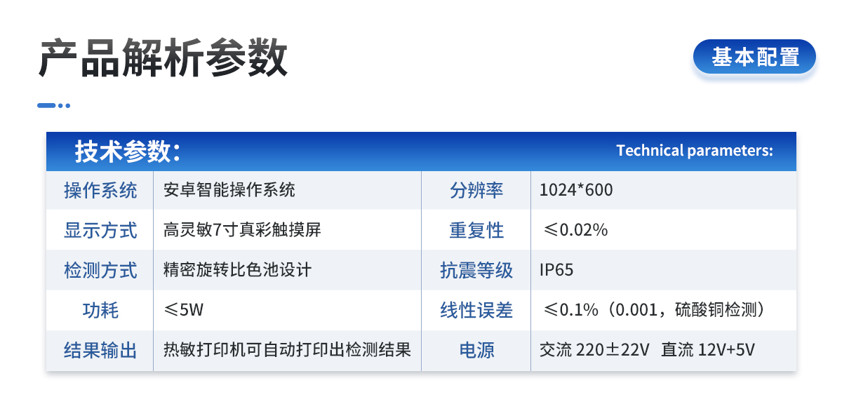 電源:交流 220±22V   直流 12V+5V(儀器內(nèi)置鋰電池也可用車載電源)功率: ≤5W量程及分辨率:0.001-9999重復(fù)性誤差: ≤0.02%(0.0002,重鉻酸鉀溶液)儀器穩(wěn)定性:一個小時內(nèi)顯示數(shù)字無漂移(透光度測量);兩個小時內(nèi)數(shù)字漂移不超過0.3%(0.003,透光度測量)、0.001(吸光度測量)。線性誤差: ≤0.1%(0.001,硫酸銅檢測)靈敏度:紅光≥4.5 ×10-5  藍(lán)光≥3.17×10-3  綠光≥2.35×10-3  橙光≥2.13×10-3波長范圍 :紅光:680±2nm; 藍(lán)光:420±2nm; 綠光:510±2nm;橙光:590±4nmPH值(酸堿度): (1)測試范圍:1~14  (2)精度:0.01  (3)誤差:±0.1含鹽量:(1)測試范圍:0.01%~1.00%  (2)相對誤差:±5%土壤水分技術(shù)參數(shù)水分單位:﹪(g/100g);含水率測試范圍:0-100﹪;誤差小于0.5%土壤溫度:范圍:-40-120℃;測量精度:±0.2℃;分辨率:±0.1℃土壤電導(dǎo):范圍:0-20ms;測量精度:±2%;分辨率:±0..1ms溫度量程:-40℃~+125℃   ;精度:±0.3℃濕度量程:0%HR-100%HR    ;精度:±3%HR露點量程:-20~+50℃      ;精度:±0.5℃氣壓量程:300~110kPa(海拔9000米~-500米);精度:0.06hPa(0.5米)光照量程:0-200000Lux    ;精度:0.054LuxCO2量程:0-5000PPM      ;精度:50PPM抗震等級:IP65儀器尺寸:48×34.5×22cm主機(jī)凈重:5.2kg