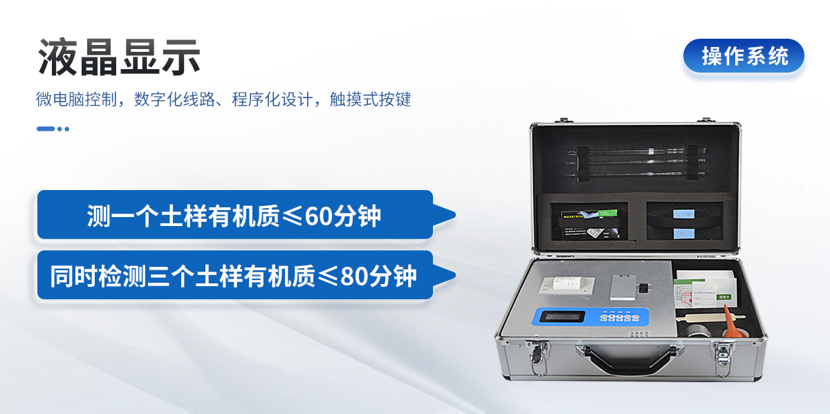 | 配套齊全:土壤有機(jī)質(zhì)速測(cè)儀該儀器集藥、器、儀為一體,攜帶方便,相當(dāng)于一個(gè)小型實(shí)驗(yàn)室。適于農(nóng)業(yè)服務(wù)部門或農(nóng)資經(jīng)銷商、肥料廠商測(cè)土施肥和鑒別肥料真假。 | 操作簡(jiǎn)便、速度快捷,成品藥劑開瓶即用,無(wú)須配置。 | 性能可靠:工作穩(wěn)定性優(yōu)于國(guó)家標(biāo)準(zhǔn)JJG179-90指標(biāo)的6倍,重復(fù)性達(dá)到光柵型分光光度計(jì)指標(biāo)水平。 |