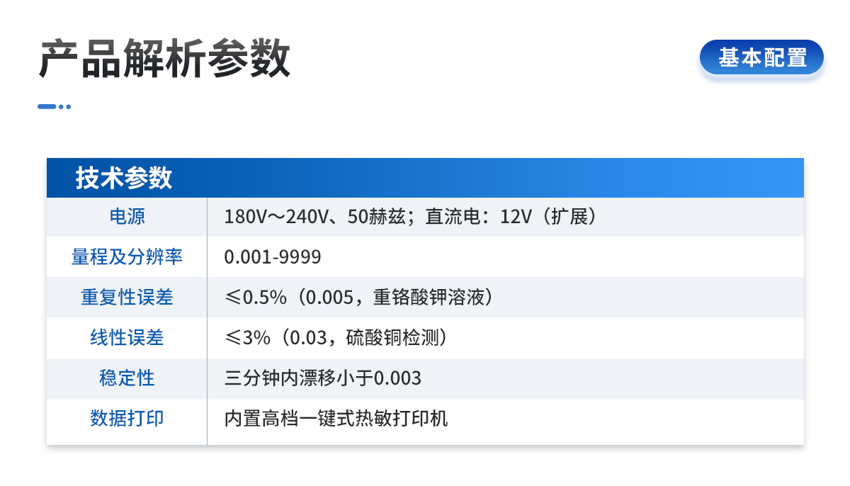 | 電源:交流電:180V~240V、50赫茲;直流電:12V(擴(kuò)展) | 量程及分辨率:0.001-9999 | 穩(wěn)定性:三分鐘內(nèi)漂移小于0.003 | 線性誤差:≤3%(0.03,硫酸銅檢測(cè)) | 重復(fù)性誤差:≤0.5%(0.005,重鉻酸鉀溶液) | 靈敏度:紅光≥4.5 ×10-5 藍(lán)光≥3.17×10-3 | 波長(zhǎng)范圍:紅光620±8nm 藍(lán)光440±8nm | 測(cè)試速度:測(cè)一個(gè)土樣有機(jī)質(zhì)≤60分鐘(含前處理時(shí)間) | 可同時(shí)檢測(cè)8個(gè)土樣≤個(gè)小時(shí)(含前處理時(shí)間) | 數(shù)據(jù)打?。簝?nèi)置高檔一鍵式熱敏打印機(jī)(國(guó)內(nèi)首家**設(shè)計(jì)) |