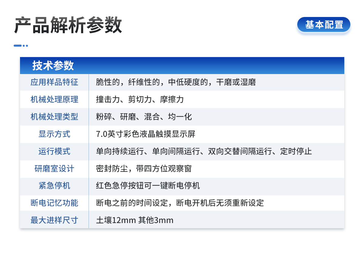 應(yīng)用領(lǐng)域:土壤、地質(zhì)、環(huán)保、第三方檢測、農(nóng)牧業(yè)、農(nóng)產(chǎn)品質(zhì)量、資源與環(huán)境等,土壤制樣、重金屬分析應(yīng)用樣品特征:脆性的,纖維性的,中低硬度的,干磨或濕磨儀器機械處理原理:撞擊力、剪切力、摩擦力儀器機械處理類型:粉碎、研磨、混合、均一化控制系統(tǒng):觸摸屏、無線遙控遠程遙控:標(biāo)配無線遙控器,可遠距離控制研磨機的啟動、停止、加速、減速以及可切換三種運行模式(單向持續(xù)運行,單向間隔運行,雙向交替間隔運行)顯示方式:7.0寸彩色液晶顯示屏,可顯示、觸控操作運行模式、運行時間、轉(zhuǎn)速、交替運行間隔運行模式:單向持續(xù)運行、單向間隔運行、雙向交替間隔運行、定時停止連續(xù)運行時間設(shè)定:0.1~9999.9分鐘交替、單向間隔暫停時間設(shè)定:0.1~9999.9分鐘主盤轉(zhuǎn)速:50-450min研磨罐轉(zhuǎn)速:100-900min傳動比(行星盤、研磨罐):1:2可連續(xù)工作(滿負荷):90h緊急停機:紅色急停按鈕可一鍵斷電停機斷電記憶功能:斷電之前的時間設(shè)定,斷電開機后無須重新設(shè)定 過載保護功能:有研磨室設(shè)計:密封防塵,帶四方位觀察窗同時處理樣品種數(shù):4種適用研磨罐:本機是新款通用型,100ml、250ml、500ml三種規(guī)格研磨罐均可使用,可根據(jù)客戶需求同時放不同規(guī)格的罐;對角對稱即可(4個研磨罐為一套)。**進樣尺寸:土壤12mm 其他3mm研磨罐配球量:罐子容積的三分之一**裝樣量:研磨罐容積的三分之二出樣粒度:*小可達0.1um(即1.0×10mm-4)研磨罐材質(zhì):瑪瑙、陶瓷、聚四氟乙烯、氧化鋯、聚氨酯、不銹鋼、尼龍、碳化鎢、硬質(zhì)合金等可選(常用瑪瑙、氧化鋯研磨罐)研磨球材質(zhì):瑪瑙、氧化鋯、不銹鋼、陶瓷、硬質(zhì)合金、碳化硅等研磨球直徑:3、5、10、15、20mm(根據(jù)實際需求配置)電源端口:國標(biāo)、歐標(biāo)、美標(biāo)、英標(biāo)等電機轉(zhuǎn)速、功率、電壓:1400rpm、0.75kw、220V±10%單相,50/60Hz凈重:80kg尺寸(長寬高):756*484*488mm噪聲描述:60dB防護等級:IP60標(biāo)準(zhǔn)配置:研磨儀主機:1臺;研磨罐鎖緊裝置:1套4個;250ml研磨機研磨罐保護裝置:1套4個;100ml研磨機研磨罐保護裝置:1套4個;電源線:1根;說明書:1本;保修卡:1張;合格證:1張