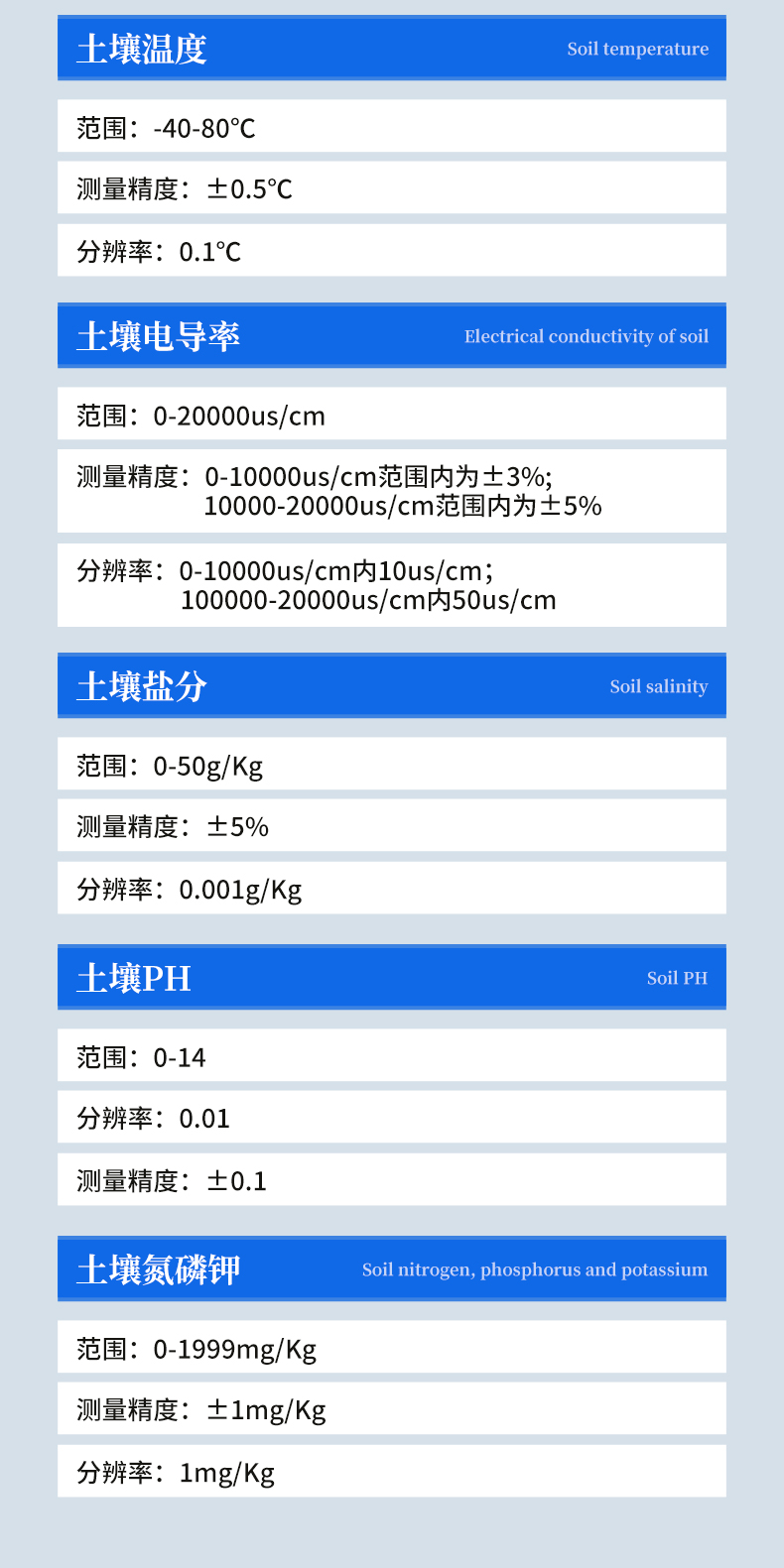 | 土壤水分:土壤容積含水量(%);范圍:0-100%;測(cè)量精度:0-50%范圍內(nèi),±2% ;50-100%范圍內(nèi),±3%;分辨率:0.1%;互換精度:<3%> | 土壤溫度:范圍:-40-80℃ 測(cè)量精度:±0.5℃ 分辨率:0.1℃ 土壤電導(dǎo)率: 范圍:0-20000us/cm 測(cè)量精度:0-10000us/cm范圍內(nèi)為±3%;10000-20000us/cm范圍內(nèi)為±5% 分辨率:0-10000us/cm內(nèi)10us/cm;100000-20000us/cm內(nèi)50us/cm | 土壤鹽分:范圍:0-50g/Kg 測(cè)量精度:±5% 分辨率:0.001g/Kg | 土壤PH:范圍:0-14 分辨率:0.01 測(cè)量精度:±0.1 | 土壤氮磷鉀:范圍:0-1999mg/Kg 測(cè)量精度:±1mg/Kg 分辨率:1mg/Kg 儀器尺寸:204*100*36(mm)(長(zhǎng)*寬*高) 重量:0.3kg 軟件:上位機(jī)軟件免費(fèi)贈(zèng)送 包裝尺寸:450*190*350mm 包裝重量:3.6kg |