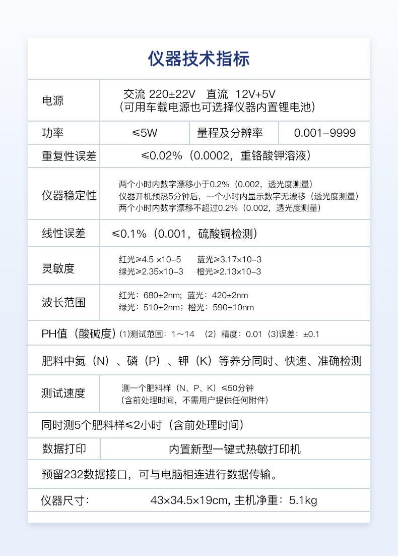 | 1.電源:交流 220±22V 直流 12V+5V(可用車載電源也可選擇儀器內(nèi)置鋰電池) | 2.功率: ≤5W | 3.量程及分辨率:0.001-9999 | 4.重復(fù)性誤差: ≤0.02%(0.0002,重鉻酸鉀溶液) | 5.儀器穩(wěn)定性:兩個(gè)小時(shí)內(nèi)數(shù)字漂移小于0.2%(0.002,透光度測(cè)量)。儀器開(kāi)機(jī)預(yù)熱5分鐘后,一個(gè)小時(shí)內(nèi)顯示數(shù)字無(wú)漂移(透光度測(cè)量),兩個(gè)小時(shí)內(nèi)數(shù)字漂移不超過(guò)0.2%(0.002,透光度測(cè)量)。 | 6.線性誤差: ≤0.1%(0.001,硫酸銅檢測(cè)) | 7.靈敏度:紅光≥4.5 ×10-5 藍(lán)光≥3.17×10-3 綠光≥2.35×10-3 橙光≥2.13×10-3 | 8.波長(zhǎng)范圍 :紅光:680±2nm; 藍(lán)光:420±2nm;綠光:510±2nm;橙光:590±10nm | 9.PH值(酸堿度): (1)測(cè)試范圍:1~14 (2)精度:0.01 (3)誤差:±0.1 | 10.肥料中氮(N)、磷(P)、鉀(K)等養(yǎng)分同時(shí)、快速、準(zhǔn)確檢測(cè) | 11.測(cè)試速度:測(cè)一個(gè)肥料樣(N、P、K)≤50分鐘(含前處理時(shí)間,不需用戶提供任何附件) | 12.同時(shí)測(cè)5個(gè)肥料樣≤2小時(shí)(含前處理時(shí)間) | 13.數(shù)據(jù)打?。簝?nèi)置新型一鍵式熱敏打印機(jī) | 14.預(yù)留232數(shù)據(jù)接口,可與電腦相連進(jìn)行數(shù)據(jù)傳輸。 | 15.儀器尺寸:43×34.5×19cm, 主機(jī)凈重:5.1kg | 16.儀器包裝尺寸:510*390*375mm,包裝重量:11.5kg |