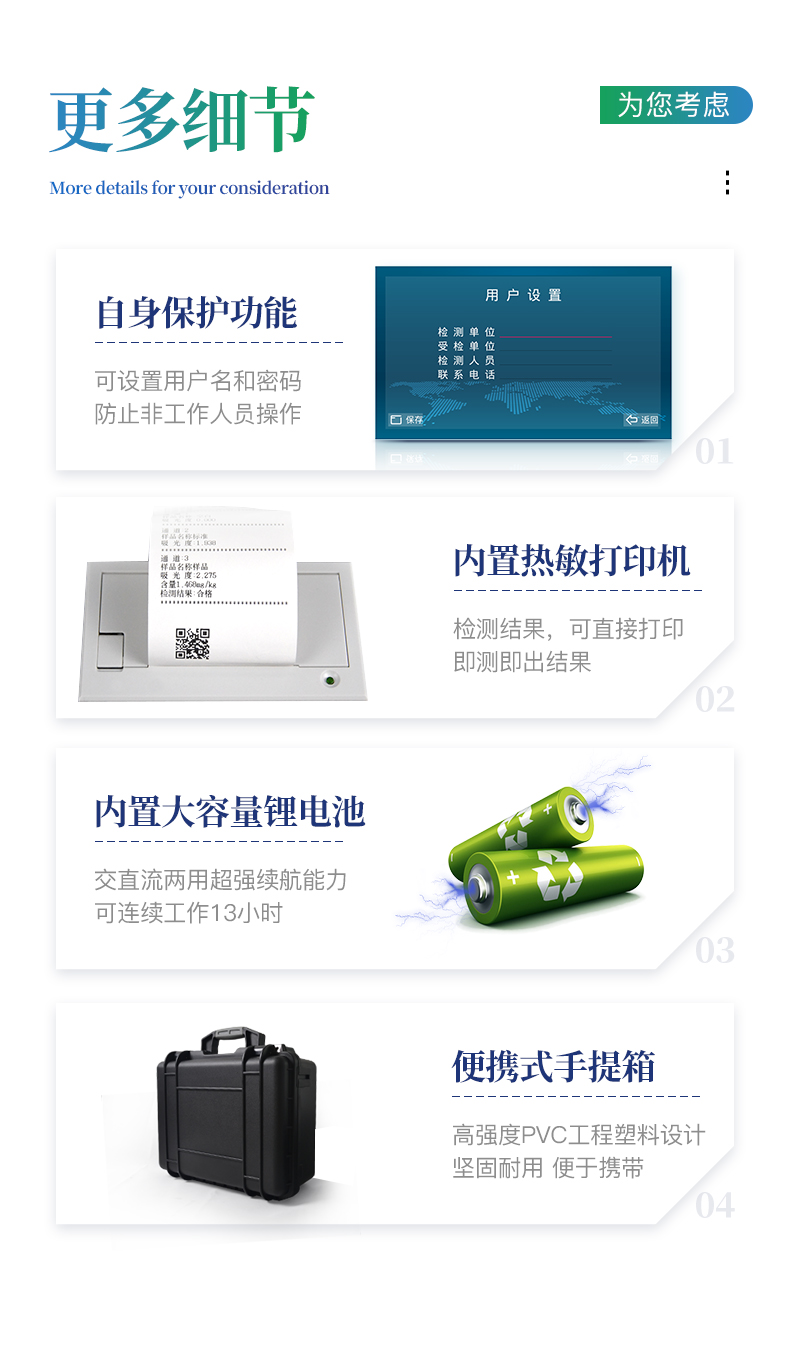 | 1、可檢測(cè)化肥、有機(jī)肥(含葉面肥、水溶肥、噴施肥等)、植株中的速效氮、速效磷、有效鉀、全氮、全磷、全鉀、有機(jī)質(zhì)、酸堿度,鈣、鎂、硫、鐵、錳、硼、鋅、銅、氯、硅、鉬等各種中微量元素以及鉛、鉻、鎘、汞、砷、鎳、鋁、氟、鈦、硒等各種重金屬含量。 | 2、安卓智能操作系統(tǒng),采用更加**和人性化操作,儀器標(biāo)配wifi聯(lián)網(wǎng)上傳、4G聯(lián)網(wǎng)傳輸、GPRS無(wú)線遠(yuǎn)傳,快速上傳數(shù)據(jù)。 | 3、內(nèi)置作物專家施肥系統(tǒng),可對(duì)百余種全國(guó)農(nóng)業(yè)、果樹(shù)、經(jīng)濟(jì)作物的目標(biāo)產(chǎn)量計(jì)算推薦施肥量,依據(jù)施肥配方科學(xué)指導(dǎo)農(nóng)業(yè)生產(chǎn)。 | 4、采用精密旋轉(zhuǎn)比色池設(shè)計(jì),光源一致性更加**保證檢測(cè)精度。一次性可快速檢測(cè)12個(gè)樣品,極大提升檢測(cè)效率,降低檢測(cè)成本。 | 5、內(nèi)置植物營(yíng)養(yǎng)診斷標(biāo)準(zhǔn)圖譜,根據(jù)各農(nóng)作物營(yíng)養(yǎng)缺失的圖片,進(jìn)行葉面對(duì)比,診斷豐缺。 | 6、采用高精度濾光片技術(shù)自主**分析方法(**號(hào):ZL 2018 2 1777724.7),比色槽部分采用標(biāo)準(zhǔn)1cm比色皿,無(wú)機(jī)械位移及磨損,光路測(cè)試定位**,保證檢測(cè)結(jié)果優(yōu)于國(guó)標(biāo)要求。 | 7、儀器配有數(shù)據(jù)接收平臺(tái),無(wú)需數(shù)據(jù)線,數(shù)據(jù)可直接局域網(wǎng)和互聯(lián)網(wǎng)無(wú)線上傳,方便進(jìn)行數(shù)據(jù)管理和數(shù)據(jù)長(zhǎng)期分析。 | 8、儀器內(nèi)置新一代高速熱敏打印機(jī),檢測(cè)完成可自動(dòng)打印檢測(cè)報(bào)告和二維碼。 | 9、高靈敏7寸電容觸摸屏,高清晰高交互顯示,大程度降低傳統(tǒng)儀器的繁瑣操作和失誤。 | 10、每個(gè)通道均配置四波長(zhǎng)冷光源,所有光源實(shí)現(xiàn)恒流穩(wěn)壓,保證波長(zhǎng)穩(wěn)定。 硅半導(dǎo)體作為信號(hào)接收系統(tǒng),壽命長(zhǎng)達(dá)10萬(wàn)小時(shí)級(jí)別。重現(xiàn)性好,準(zhǔn)確度高。 | 11、高強(qiáng)度PVC工程塑料手提箱設(shè)計(jì),堅(jiān)固耐用,便于攜帶,供電方式為交直流兩用,可野外流動(dòng)測(cè)試配套成品藥劑。 |