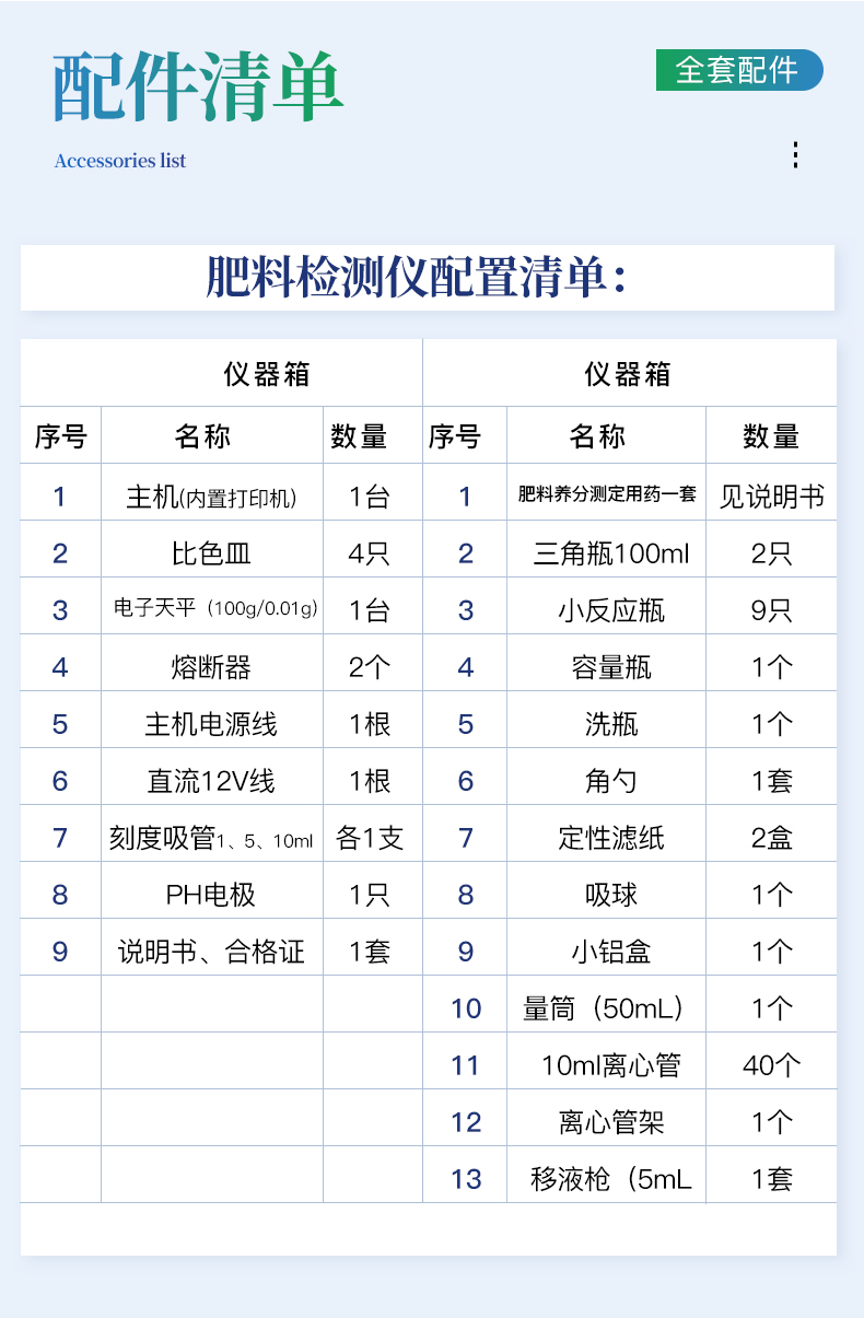 | 01 | 主機(jī)(內(nèi)置打印機(jī)) | 1臺(tái) | 01 | 肥料養(yǎng)分測(cè)定用藥一套 | 見(jiàn)說(shuō)明書(shū) |