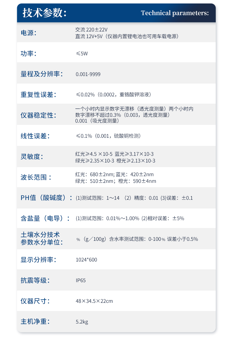 | 1、電源:交流 220±22V 直流 12V+5V(儀器內(nèi)置鋰電池也可用車載電源) | 2、功率: ≤5W | 3、量程及分辨率:0.001-9999 | 4、重復性誤差: ≤0.02%(0.0002,重鉻酸鉀溶液) | 5、儀器穩(wěn)定性:一個小時內(nèi)顯示數(shù)字無漂移(透光度測量);兩個小時內(nèi)數(shù)字漂移不超過0.3%(0.003,透光度測量)、0.001(吸光度測量)。 | 6、線性誤差: ≤0.1%(0.001,硫酸銅檢測) | 7、靈敏度:紅光≥4.5 ×10-5 藍光≥3.17×10-3 綠光≥2.35×10-3 橙光≥2.13×10-3 | 8、波長范圍 :紅光:680±2nm; 藍光:420±2nm; 綠光:510±2nm;橙光:590±4nm | 9、PH值(酸堿度): (1)測試范圍:1~14 (2)精度:0.01 (3)誤差:±0.1 | 10、含鹽量(電導):(1)測試范圍:0.01%~1.00% (2)相對誤差:±5% | 11、土壤水分技術(shù)參數(shù)水分單位:﹪(g/100g);含水率測試范圍:0-100﹪;誤差小于0.5% | 12、顯示屏分辨率:1024*600 | 13、抗震等級:IP65 | 14、抗震等級:IP65 | 15、主機凈重:5.2kg | 16、包裝尺寸:510*390*375mm | 17、包裝重量:12kg |
