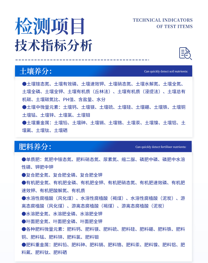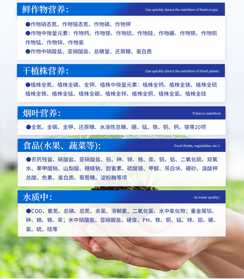 | 1、土壤養(yǎng)分:●土壤銨態(tài)氮、土壤有效磷、土壤速效鉀、土壤硝態(tài)氮、土壤堿解氮、土壤全氮、土壤全磷、土壤全鉀、土壤有機質(zhì)(丘林法)、土壤有機質(zhì)(浸提法)、土壤總有機碳、土壤碳氮比、PH值、含鹽量、水分?!裢寥乐形⒘吭兀和寥棱}、土壤鎂、土壤硫、土壤硅、土壤硼、土壤鐵、土壤銅、土壤錳、土壤鋅、土壤氯、土壤鉬;●土壤重金屬:土壤鉛、土壤砷、土壤鎘、土壤鉻、土壤汞、土壤鎳、土壤鋁、土壤氟、土壤鈦、土壤硒。 | 2、肥料養(yǎng)分:●單質(zhì)肥:氮肥中銨態(tài)氮、肥料硝態(tài)氮、尿素氮、縮二脲、磷肥中磷、磷肥中水溶性磷、鉀肥中鉀;●復合肥全氮、復合肥全磷、復合肥全鉀;●有機肥全氮、有機肥全磷、有機肥全鉀、有機肥硝態(tài)氮、有機肥速效磷、有機肥速效鉀、有機肥酸解氮、有機質(zhì);●水溶性腐植酸(風化煤)、水溶性腐植酸(褐煤)、水溶性腐植酸(泥炭)、游離態(tài)腐植酸(風化煤)、游離態(tài)腐植酸(褐煤)、游離態(tài)腐植酸(泥炭);●水溶肥全氮、水溶肥全磷、水溶肥全鉀;●葉面肥全氮、葉面肥全磷、葉面肥全鉀;●各種肥料微量元素:肥料鈣、肥料鎂、肥料硫、肥料硅、肥料硼、肥料鐵、肥料銅、肥料錳、肥料鋅、肥料氯、肥料鉬;●肥料重金屬:肥料鉛、肥料砷、肥料鎘、肥料鉻、肥料汞、肥料鎳、肥料鋁、肥料氟、肥料鈦、肥料硒。 | 3、鮮作物營養(yǎng):●作物硝態(tài)氮、作物銨態(tài)氮、作物磷、作物鉀;●作物中微量元素:作物鈣、作物鎂、作物硫、作物硅、作物硼、作物鐵、作物銅、作物錳、作物鋅、作物氯;●作物中硝酸鹽、亞硝酸鹽、總糖量、還原糖、蛋白質(zhì)。 | 4、干植株營養(yǎng):●植株全氮、植株全磷、全鉀、植株中微量元素:植株全鈣、植株全鎂、植株全硫、植株全鐵、植株全錳、植株全硼、植株全鋅、植株全銅、植株全氯、植株全硅。 | 5、煙葉營養(yǎng):●全氮、全磷、全鉀、還原糖、水溶性總糖、硼、錳、鐵、銅、鈣、鎂等20項。 | 6、食品(水果、蔬菜等):●農(nóng)藥殘留、硝酸鹽、亞硝酸鹽、鉛、砷、鎘、鉻、汞、銅、鋁、二氧化硫、雙氧水、苯甲酸鈉、山梨酸、糖精鈉、甜蜜素、硫酸鎂、甲醛、吊白塊、硼砂、溴酸鉀、總酸、色素、蛋白質(zhì)、葡萄糖、淀粉酶等項。 | 7、水質(zhì)中:COD、氨氮、總磷、總氮、余氯、溶解氧、二氧化氯、水中氰化物;重金屬鉛、砷、鎘、鉻、汞;水中硝酸鹽、亞硝酸鹽、硬度、PH、鐵、銅、錳、鋅、鋁、硼、氯、硫、硅等 |