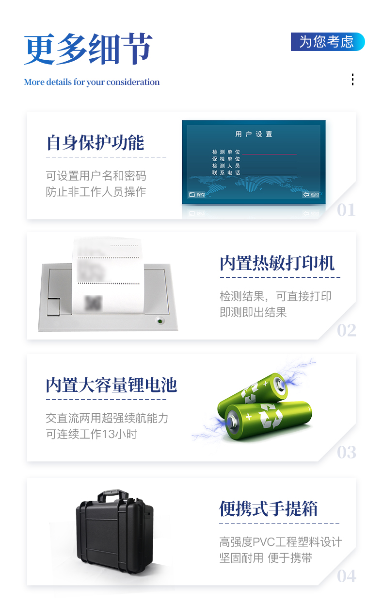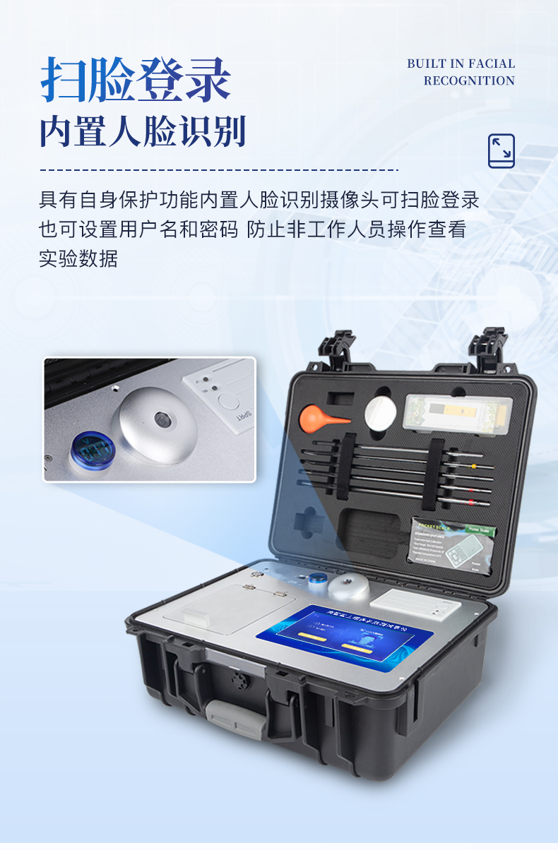 | 1、安卓智能操作系統(tǒng)Android 7.1版本,主控芯片采用ARM Cortex-A7,RK3288/4核處理器,主頻1.88Ghz,運轉(zhuǎn)速度更快速,穩(wěn)定性更強。 | 2、可檢測各種土壤、肥料、作物、食品、水質(zhì)、環(huán)境等共200多個測試項目,一機多用,功能齊全。 | 3、測試速度更快!無需空白對照和標準校準,省卻以往繁瑣的操作步驟,一鍵式操作,直接讀取數(shù)據(jù),**率,低消耗。 | 4、采用精密旋轉(zhuǎn)比色池設計(**號:ZL 2018 2 1777724.7),光源一致性更加**,保證檢測精度。 | 5、12個旋轉(zhuǎn)檢測通道,一次性可快速檢測12個樣品,極大提升檢測效率,降低檢測成本。 | 6、采用高精度濾光片技術(shù)自主**分析方法(**號:ZL 2020 2 1763837.9),**認證。 | 7、具有自身保護功能,內(nèi)置人臉識別攝像頭可掃臉登錄,也可設置用戶名和密碼,防止非工作人員操作查看實驗數(shù)據(jù)。 | 8、檢測過程中內(nèi)置校準功能,智能恒流穩(wěn)壓,光強自動校準,確保檢測準確度,取得中國計量科學研究院的《校準證書》。 | 9、儀器標配wifi無線上傳、4G聯(lián)網(wǎng)傳輸、GPRS無線遠傳,快速上傳數(shù)據(jù)。 | 10、配有智慧云農(nóng)業(yè)平臺,儀器連入無線網(wǎng)絡后,可將檢測數(shù)據(jù)可選擇性或批量無線上傳,方便用戶進行數(shù)據(jù)管理和長期分析。 | 11、儀器配同時具有USB接口、以太網(wǎng)接口,內(nèi)置大容量內(nèi)存,并可隨時用U盤拷貝數(shù)據(jù)。 | 12、可用手機隨時登錄云平臺在線移動查看歷史數(shù)據(jù) | 13、內(nèi)置作物專家施肥系統(tǒng),可對百余種全國農(nóng)業(yè)經(jīng)濟作物、果樹等的目標產(chǎn)量計算推薦施肥量,依據(jù)施肥配方科學指導農(nóng)業(yè)生產(chǎn)。測土配方施肥結(jié)果可打印,打印內(nèi)容包含:作物種類、肥料種類、目標產(chǎn)量、需求總量、建議施肥方案。 | 14、內(nèi)置植物營養(yǎng)診斷標準圖譜,根據(jù)各農(nóng)作物營養(yǎng)缺失的圖片,進行葉面對比,診斷豐缺。 | 15、4波長專業(yè)測試冷光源(紅、藍、綠、橙),光源波長穩(wěn)定,長時間連續(xù)工作光源無溫漂現(xiàn)象,壽命長達10萬小時級別,重現(xiàn)性好,準確度高。 | 16、比色池部分采用標準1cm比色皿,無機械位移及磨損,光路測試定位**,有效屏蔽外光干擾,保證檢測結(jié)果優(yōu)于國標要求。 | 17、儀器系統(tǒng)內(nèi)帶有樣品前處理操作視頻,各種樣品檢測方法點擊視頻模塊即可觀看,檢測人員無需自學說明書,指導教學方便快速,方便新手快速操作。 | 18、內(nèi)置新一代高速熱敏打印機(無需色帶),打印內(nèi)容包含:檢測單位、檢測人員、檢測項目、通道號、吸光度、養(yǎng)分含量(mg/kg)、檢測時間、以及二維碼等信息 | 19、高靈敏7寸真彩觸摸屏,采用更加**和人性化操作,高清晰高交互顯示,大程度降低傳統(tǒng)儀器的繁瑣操作和失誤,并取得多項《軟件著作權(quán)》。 | 20、內(nèi)置時鐘功能,方便操作時間記錄,長期歷史追溯。 | 21、可設置多賬戶賬號密碼登錄,**UI交互界面,不同的用戶可自由添加編輯檢測信息,保存后可長期使用。 | 22、GPS功能:可在野外作業(yè)時記錄經(jīng)緯度地點,滿足特殊用戶需求。 | 23、內(nèi)置低電壓提示功能,可在檢測時明確電量,避免測試數(shù)據(jù)偏移,同時具有斷電保護功能,斷電自動保存數(shù)據(jù),防止數(shù)據(jù)丟失。 | 24、交直流兩用供電方式,內(nèi)置大容量充電鋰電池,滿電狀態(tài)下可連續(xù)工作10余小時,同時可外接車載電源蓄電。 | 25、儀器具有中英文切換功能,可滿足出口要求。 | 26、高強度PVC工程塑料手提箱設計,堅固耐用,便于攜帶。 |