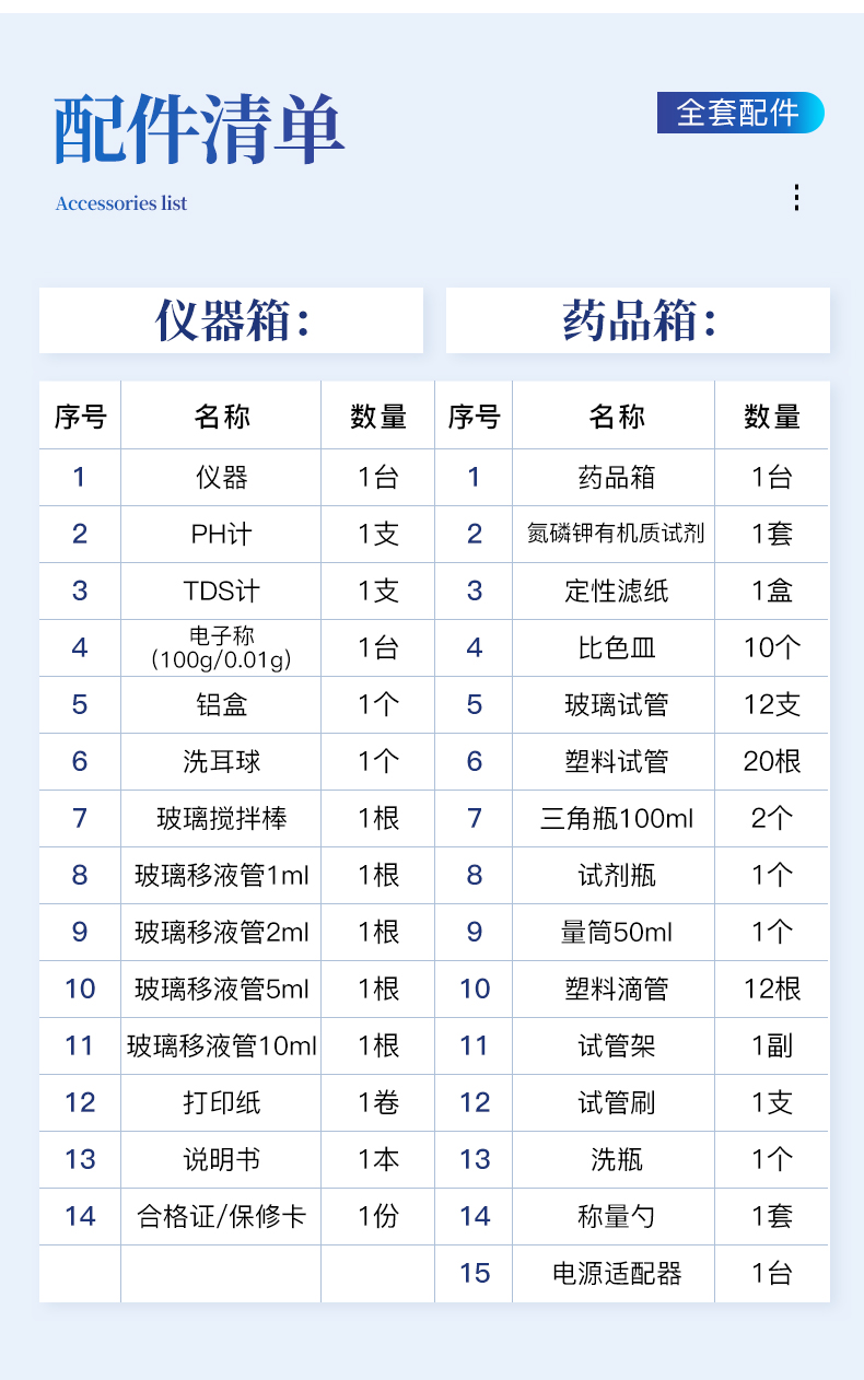 八、全項目土壤肥料養(yǎng)分檢測儀配置清單: :