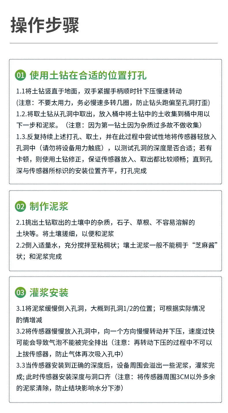 將土鉆豎直于地面,雙手緊握手柄順時(shí)針下壓慢速轉(zhuǎn)動(dòng)。(注意:不要太用力,務(wù)必慢速多轉(zhuǎn)幾圈,防止鉆頭跑偏至孔洞打歪)反復(fù)持續(xù)上述打孔、取土,并在此過程中嘗試性地將傳感器輕放入孔洞中(請(qǐng)勿將設(shè)備用力觸底),以測(cè)試孔洞的深度是否合適;若有卡頓,則使用土鉆修正,保證傳感器放入、取出都比較順暢;直到孔深與傳感器所標(biāo)識(shí)的安裝位置齊平,打孔完成