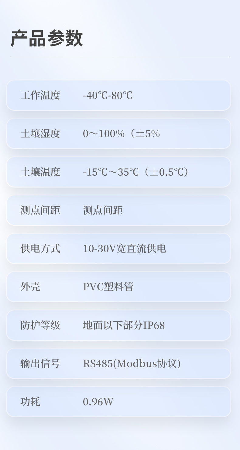 1、工作溫度:-40℃-80℃ 2、土壤濕度:0~100%(±5%) 3、土壤溫度:-15℃~35℃(±0.5℃)4、測(cè)點(diǎn)間距:10cm 5、供電方式:10-30V寬直流供電6、外殼:PVC塑料管 7、防護(hù)等級(jí):地面以下部分IP68 8、輸出信號(hào):RS485(Modbus協(xié)議)9、功耗:四層 0.9W