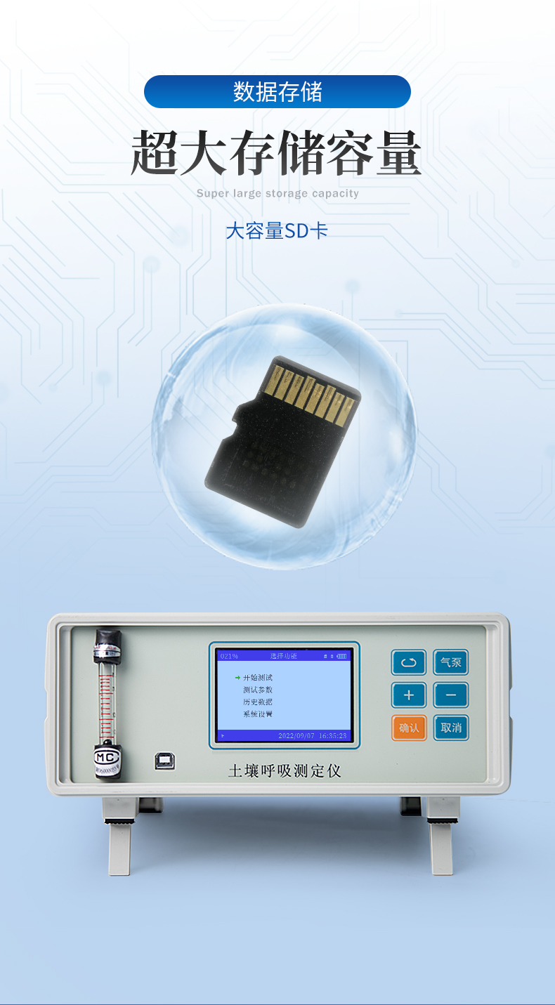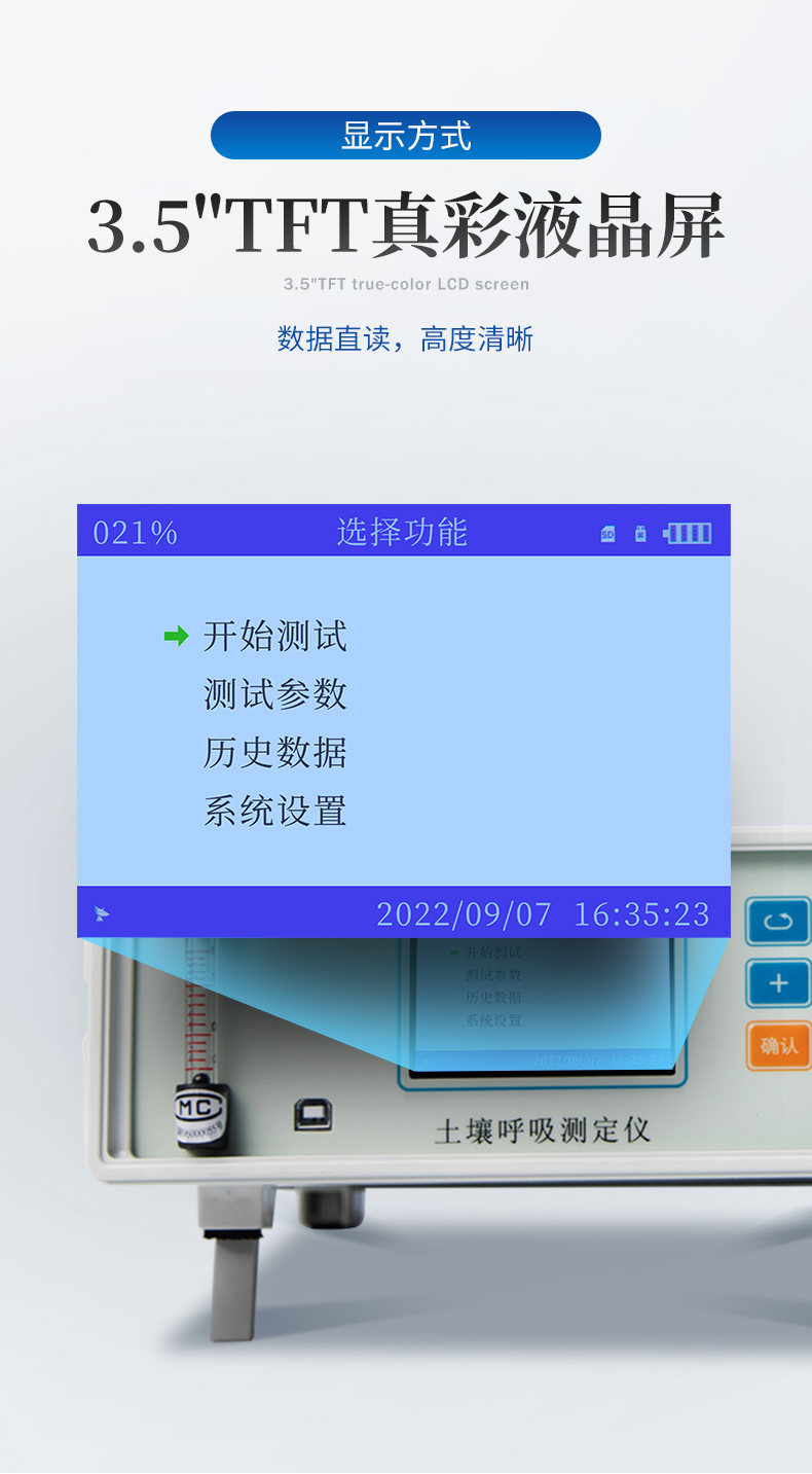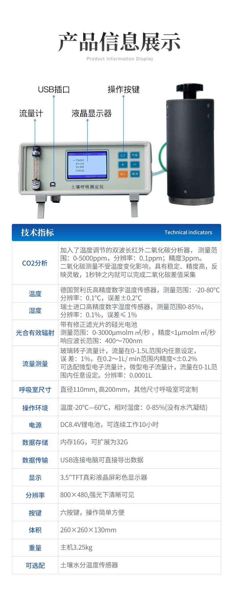 1、 CO2分析:加入了溫度調(diào)節(jié)的雙波長紅外二氧化碳分析器, 測量范圍:0-5000ppm,分辨率:0.1ppm; 精度3ppm。二氧化碳測量不受溫度變化影響,具有穩(wěn)定、精度高,反映靈敏,1秒鐘之內(nèi)就可以完成二氧化碳差值采集。2、溫度:德國賀利氏高精度數(shù)字溫度傳感器,測量范圍:-20-80℃,分辨率:0.1℃,誤差±0.2℃3、 濕度: 瑞士進口高精度數(shù)字濕度傳感器,測量范圍0-85%,分辨率:0.1%,誤差≤ 1%4、光合有效輻射:帶有修正濾光片的硅光電池,測量范圍:0-3000μmolm ㎡/秒 ,精度<1μmolm>5、流量測量:玻璃轉(zhuǎn)子流量計,流量在0-1.5L范圍內(nèi)任意設定, 誤 差:1%,在0.2~1L/ min范圍內(nèi)精度<±0.2%??蛇x配微型電子流量計,微型電子流量計,流量在0-1l范圍內(nèi)任意設定。分辨率:0.0001l<>6、 呼吸室尺寸:直徑110mm, 高200mm,其他尺寸呼吸室可定制。7、操作環(huán)境:溫度-20℃—60℃,相對濕度:0-85%(沒有水汽凝結(jié))8、  電源:DC8.4V鋰電池,可連續(xù)工作10小時9、數(shù)據(jù)存儲:內(nèi)存16G,可擴展為32G。10、 數(shù)據(jù)傳輸:USB連接電腦可直接導出數(shù)據(jù)。 11、顯 示:3.5"TFT真彩液晶屏彩色顯示器12、  分辨率 800×480,強光下清晰可見 。13、按 鍵:六按鍵,操作簡單方便14、   體積:260×260×130mm13、 重量:主機3.25kg14、   可選配:土壤水分溫度傳感器