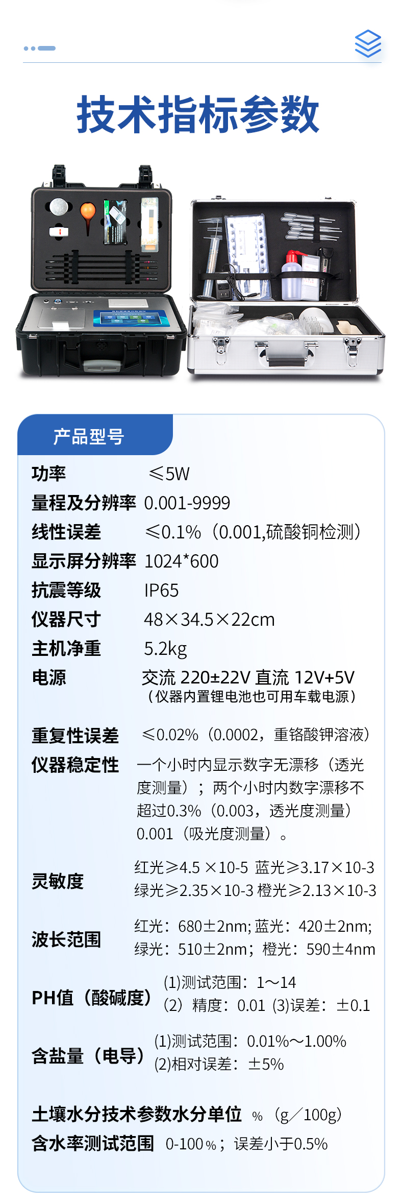 1、電源:交流 220±22V 直流 12V+5V(儀器內(nèi)置鋰電池也可用車載電源)2、功率: ≤5W3、量程及分辨率:0.001-99994、重復(fù)性誤差: ≤0.02%(0.0002,重鉻酸鉀溶液)5、儀器穩(wěn)定性:一個(gè)小時(shí)內(nèi)顯示數(shù)字無(wú)漂移(透光度測(cè)量);兩個(gè)小時(shí)內(nèi)數(shù)字漂移不超過(guò)0.3%(0.003,透光度測(cè)量)、0.001(吸光度測(cè)量)。6、線性誤差: ≤0.1%(0.001,硫酸銅檢測(cè))7、靈敏度:紅光≥4.5 ×10-5 藍(lán)光≥3.17×10-3 綠光≥2.35×10-3 橙光≥2.13×10-38、波長(zhǎng)范圍 :紅光:680±2nm; 藍(lán)光:420±2nm; 綠光:510±2nm;橙光:590±4nm9、PH值(酸堿度): (1)測(cè)試范圍:1~14 (2)精度:0.01 (3)誤差:±0.110、含鹽量(電導(dǎo)):(1)測(cè)試范圍:0.01%~1.00% (2)相對(duì)誤差:±5%11、土壤水分技術(shù)參數(shù)水分單位:﹪(g/100g);含水率測(cè)試范圍:0-100﹪;誤差小于0.5%12、顯示屏分辨率:1024*60013、抗震等級(jí):IP6514、儀器尺寸:48×34.5×22cm。15、主機(jī)凈重:5.2kg16、包裝尺寸:510*390*375mm17、包裝重量:11.5kg
