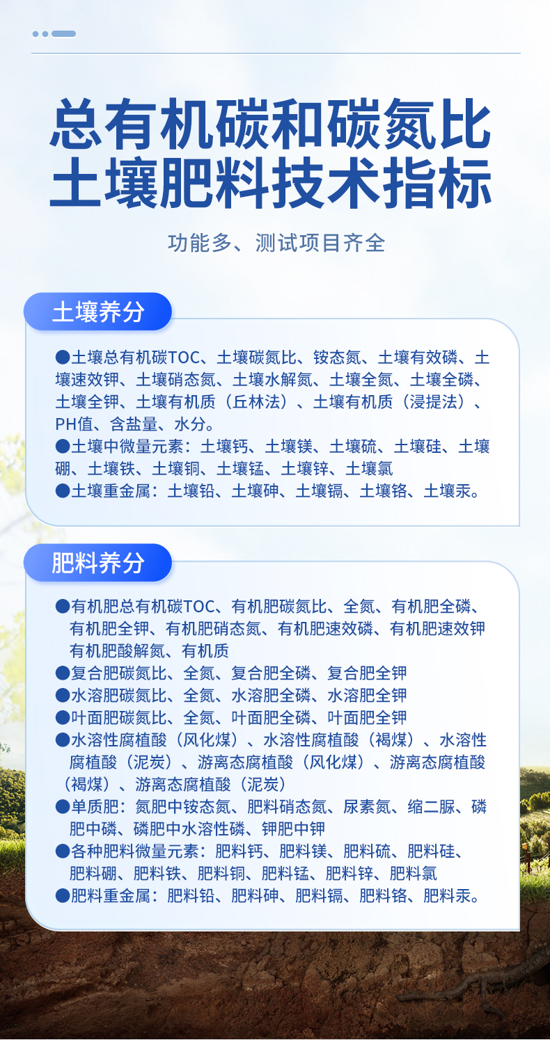 1、土壤養(yǎng)分:●土壤銨態(tài)氮、土壤有效磷、土壤速效鉀、土壤硝態(tài)氮、土壤水解氮、土壤全氮、土壤全磷、土壤全鉀、土壤有機(jī)質(zhì)(丘林法)、土壤有機(jī)質(zhì)(浸提法)、土壤總有機(jī)碳、土壤碳氮比、PH值、含鹽量、水分?!裢寥乐形⒘吭兀和寥棱}、土壤鎂、土壤硫、土壤硅、土壤硼、土壤鐵、土壤銅、土壤錳、土壤鋅、土壤氯、土壤鉬;●土壤重金屬:土壤鉛、土壤砷、土壤鎘、土壤鉻、土壤汞、土壤鎳、土壤鋁、土壤氟、土壤鈦、土壤硒。2、肥料養(yǎng)分:●單質(zhì)肥:氮肥中銨態(tài)氮、肥料硝態(tài)氮、尿素氮、縮二脲、磷肥中磷、磷肥中水溶性磷、鉀肥中鉀;●復(fù)合肥全氮、復(fù)合肥全磷、復(fù)合肥全鉀;●有機(jī)肥全氮、有機(jī)肥全磷、有機(jī)肥全鉀、有機(jī)肥硝態(tài)氮、有機(jī)肥速效磷、有機(jī)肥速效鉀、有機(jī)肥酸解氮、有機(jī)質(zhì);●水溶性腐植酸(風(fēng)化煤)、水溶性腐植酸(褐煤)、水溶性腐植酸(泥炭)、游離態(tài)腐植酸(風(fēng)化煤)、游離態(tài)腐植酸(褐煤)、游離態(tài)腐植酸(泥炭);●水溶肥全氮、水溶肥全磷、水溶肥全鉀;●葉面肥全氮、葉面肥全磷、葉面肥全鉀;●各種肥料微量元素:肥料鈣、肥料鎂、肥料硫、肥料硅、肥料硼、肥料鐵、肥料銅、肥料錳、肥料鋅、肥料氯、肥料鉬;●肥料重金屬:肥料鉛、肥料砷、肥料鎘、肥料鉻、肥料汞、肥料鎳、肥料鋁、肥料氟、肥料鈦、肥料硒。3、鮮作物營(yíng)養(yǎng):●作物硝態(tài)氮、作物銨態(tài)氮、作物磷、作物鉀;●作物中微量元素:作物鈣、作物鎂、作物硫、作物硅、作物硼、作物鐵、作物銅、作物錳、作物鋅、作物氯、作物鉬;●作物中硝酸鹽、亞硝酸鹽。4、干植株?duì)I養(yǎng):●植株全氮、植株全磷、植株全鉀5、煙葉營(yíng)養(yǎng):●全氮、全磷、全鉀、還原糖、水溶性總糖、硼、錳、鐵、銅、鈣、鎂等20項(xiàng)。6、食品(水果、蔬菜等):●硝酸鹽、亞硝酸鹽、重金屬(鉛、鉻、鎘、砷、汞)等項(xiàng)。7、水質(zhì)中:●銨態(tài)氮、水中磷、水中鉀、硝酸鹽、亞硝酸鹽、硬度、PH、鐵、銅、錳、鋅、硼、氯、硫、硅、鉬等