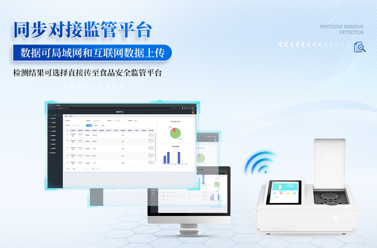 6.4.數(shù)據(jù)監(jiān)管系統(tǒng):同步對接監(jiān)管平臺,數(shù)據(jù)可局域網(wǎng)和互聯(lián)網(wǎng)數(shù)據(jù)上傳,檢測結(jié)果可選擇直接傳至食品安全監(jiān)管平臺。集成OSS輸出存儲服務(wù)、區(qū)分設(shè)備定向管理應(yīng)用,進行區(qū)域食品安全監(jiān)管及大數(shù)據(jù)分析處理與數(shù)據(jù)統(tǒng)計,檢測區(qū)域食品安全長短期動態(tài),達到食品安全問題預(yù)估、預(yù)警。