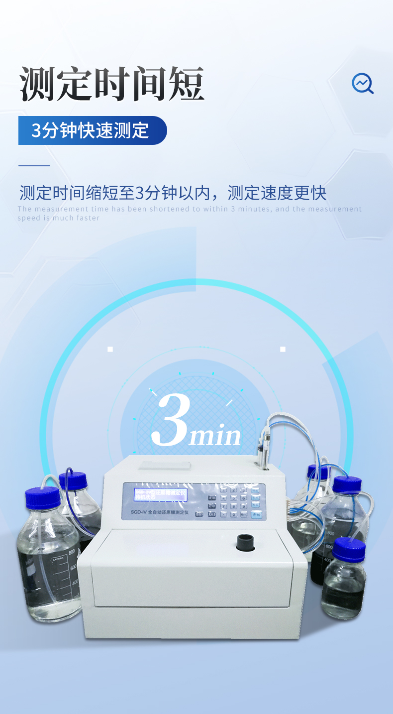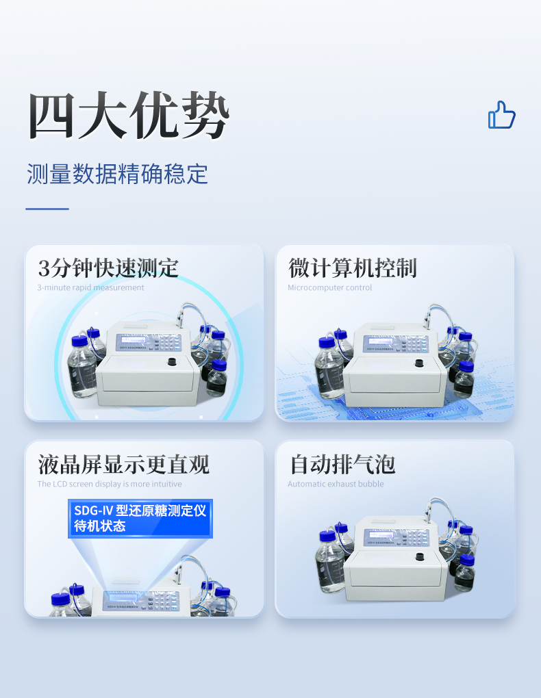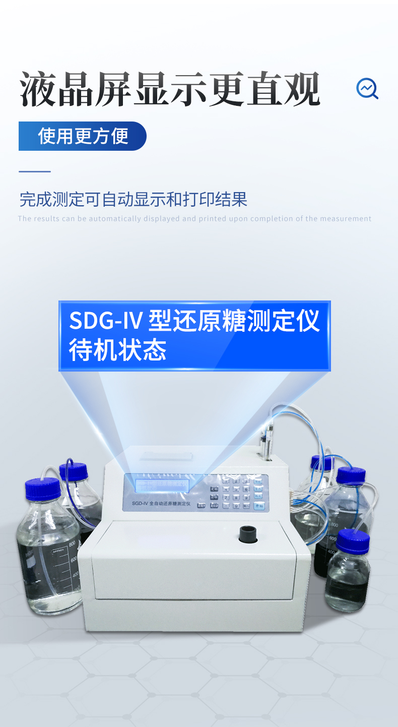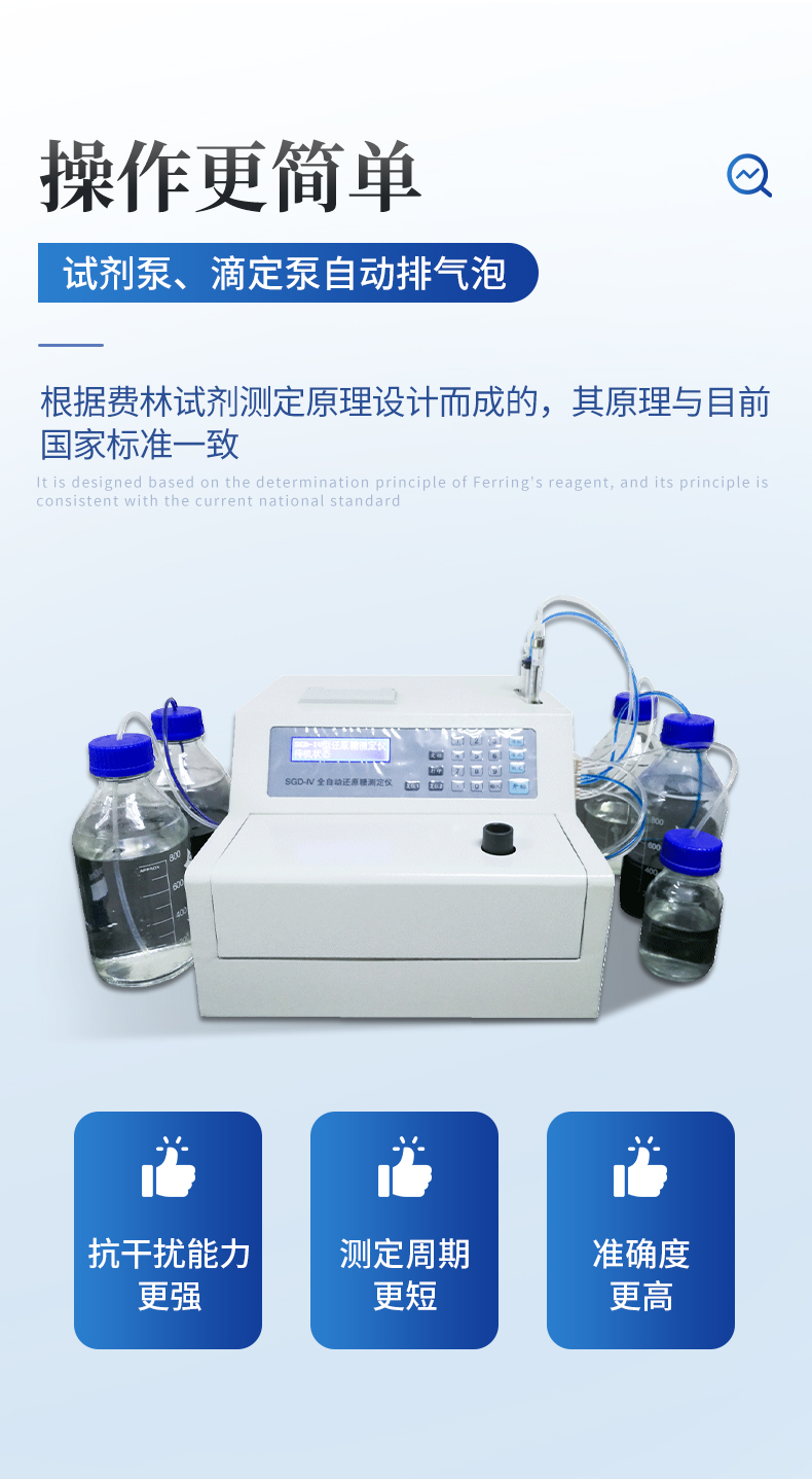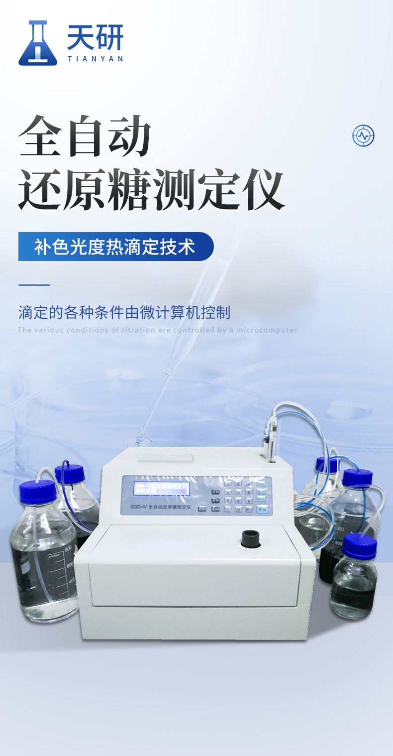 全自動還原糖測定儀是根據(jù)費林試劑測定原理設(shè)計而成的,其原理與目前國家標(biāo)準一致。IV型全自動還原糖測定儀實現(xiàn)試劑泵、滴定泵自動排氣泡,操控更方便;采用精密部件優(yōu)化設(shè)計,準確度更高;測定時間縮短至3分鐘以內(nèi),測定速度更快;液晶屏顯示更直觀。