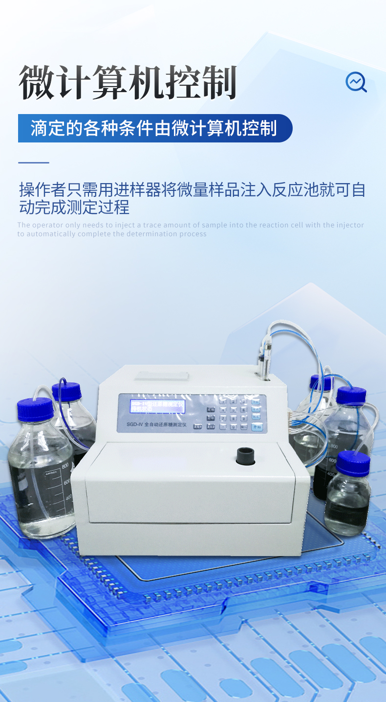 為適應(yīng)我國食品、醫(yī)藥發(fā)酵行業(yè)生產(chǎn)控制技術(shù)和過程分析中還原糖的快速檢測需求,在總結(jié)III型儀器應(yīng)用基礎(chǔ)上,研制出了全新全自動還原糖測定儀。該儀器采用補色光度熱滴定技術(shù),滴定的各種條件由微計算機控制,操作者只需用進樣器將微量樣品注入反應(yīng)池就可自動完成測定過程,并自動顯示和打印結(jié)果,操作更簡單,使用更方便,抗干擾能力更強,測定周期更短,準確度更高。